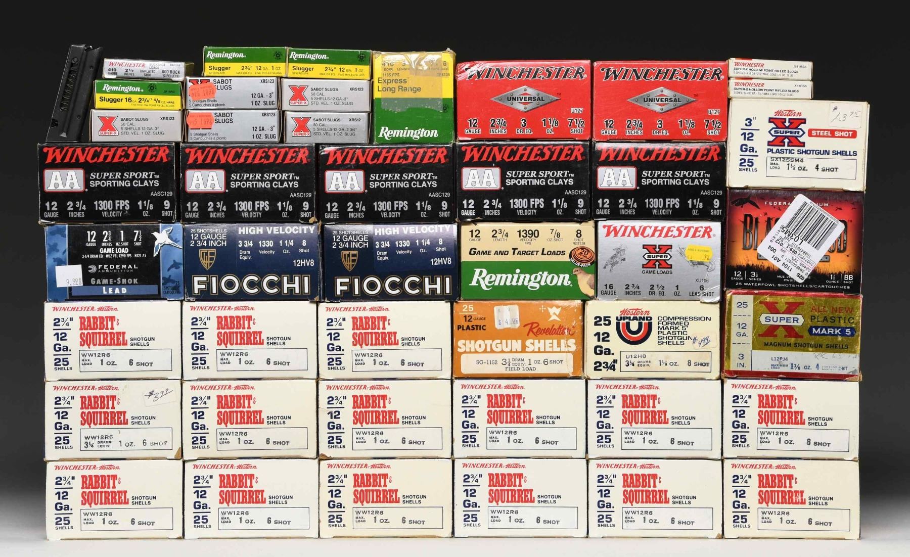 This lot consists of the following shotshell ammo: 1) about 120 rds. of Winchester AA Super Sport 12 Ga. 2 3/4" 9 shot shells. 2) 24 rds. of Winchester Super X 12 Ga 3" Sabot Slugs. 3) 25 rds. of Federal Blackcloud FS Steel 3 1/2 12 Ga ammo. 4) 40 rds. of Fiocchi 12 G. 2 3/4" #8 shot. 5) About 40 rds. of Winchester Universal 12 Ga 2 3/4" 7 1/2 shot. 6) 25 rds. of Federal 12 Ga. 2 3/4" Game Load 7 1/2 shot. 7) 10 rds. of Winchester Super-X Hollowpoint 410 2 1/2" slugs. 8) 25 rds of Winchester Super X 16 Ga. 2 3/4" #6 lead shot ammo. 9) About 20 rds. of Remington 410 3" Express long range #6 shot ammo. 10) 10 rds. of Remington 12 Ga. 2 3/4" slugs. 11) 5 rds. of Remington 16 Ga. 2 3/4" slugs. 12) About 18 rds. of Remington 12 Ga. 2 3/4" 8 shot Game Loads. 13) About 300 rds. of Winchester Western 12 Ga 2 3/4" Rabbit-Squirrel #6 shot ammo. 14) 25 rds. of Western Upland 12 Ga. 2 3/4" 8 shot shot ammo. 15) 25 rds. of Western Steel SHot12 Ga. 2 3/4" 4 shot ammo. 16) 25 rds. of Revelation 12 Ga. 2 3/4" #6 shot ammo. 17) 25 rds. of Western Super X 12 Ga. 3" Magnum #6 shot ammo. CONDITION: ammo generally rates good to very good with age & storage wear. Boxes show varying degrees of storage wear. (02-24605-1/MJC). $200-400 for lot.