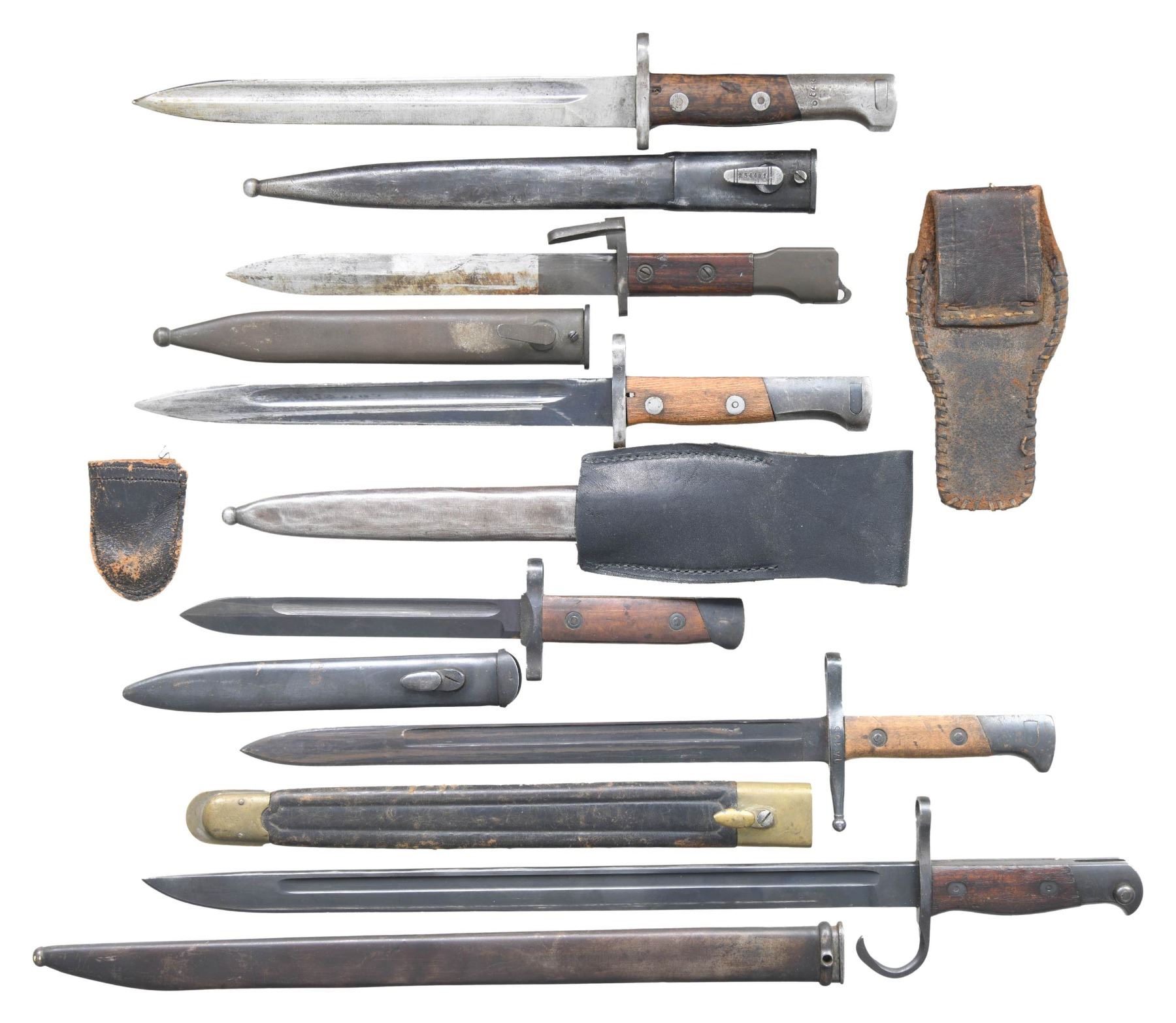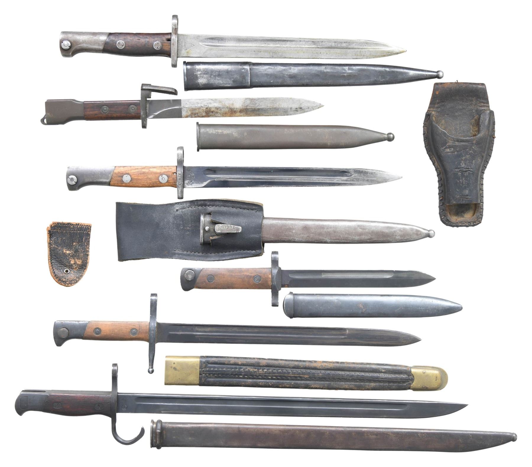 No.1: WWII Japanese Type 30 Bayonet. 15 5/8" fullered blade. This high condition bayonet is marked on the right ricasso w/ "Toyada Jidoshoki Seisakusho" marking & the Nagoya arsenal marking. Curved quillon. Smooth hardwood grips. S# 2866 on pommel. Steel scabbard w/ ball tip. CONDITION: wood & metal retain most of their original finishes. Blued blade has been lightly sharpened. Scabbard has traces of blue turned patina w/ scattered dents. No.2: Italian WWII Model 1938 Carcano Bayonet. 7" fixed fullered blade. S# on top of grip. Smooth hardwood grips retained by two rivets. Correct blued steel scabbard. CONDITION: metal including scabbard retains 75% of its original blue finish w/ thinning & light wear. Grips have moderate wear, staining & handling marks. No.3: Belgian Model 1953 Trident FAL Bayonet. 7 7/8" blade. Bayonet is marked only w/ S# 12559 on right side of pommel. Crossguard is equipped w/ two forward facing prongs, hence the name "Trident". Smooth hardwood grips retained by two screws. Steel scabbard w/ ball finial. CONDITION: bright blade has wear & staining. Balance of metal retains most of its Parkerized finish. The prongs have been bent downward notably. Scabbard is turning overall patina. No.4: Italian WWII Bayonet. 11 7/8" fullered blade. Dated 1941 on the right side of the crossguard. Left side of crossguard carries S#. Right side is marked "PS 1941". Crossguard has the ball-tip. Smooth hardwood grips retained by two rivets. Leather scabbard w/ brass throat & tip. CONDITION: metal retains a large degree of its original blue finish w/ moderate wear. Grips have light wear & staining. Scabbard w/ tight stitching has scuffing & flexing. Brass tips turned patina. No.5: Yugoslav Mauser Bayonet. 9 5/8" fullered blade. Blade is marked on right ricasso w/ cyrillic letters & "44". Crossguard carries S#. Smooth hardwood grips retained by two screws that appear to be replacements. Steel scabbard w/ shop-made leather frog. CONDITION: blade retains 50% of its worn blue finish & has been sharpened. Balance of metal turning gray. Scabbard shows grinding marks & has turned overall gray. No.6: Czech VZ24 Bayonet. 10 1/8" fullered blade. Blade marked on right ricasso w/ "BT3" in triangle. Smooth hardwood grips retained by two screws. Steel scabbard w/ two piece welded construction. CONDITION: bayonet is well-worn w/ numerous handling marks. Scabbard has dented appearance. No.7: Leather Frog. Appears to be shop-made w/ heavy wear. (02-24261-7/RW). NON-GUN. $250-350.
