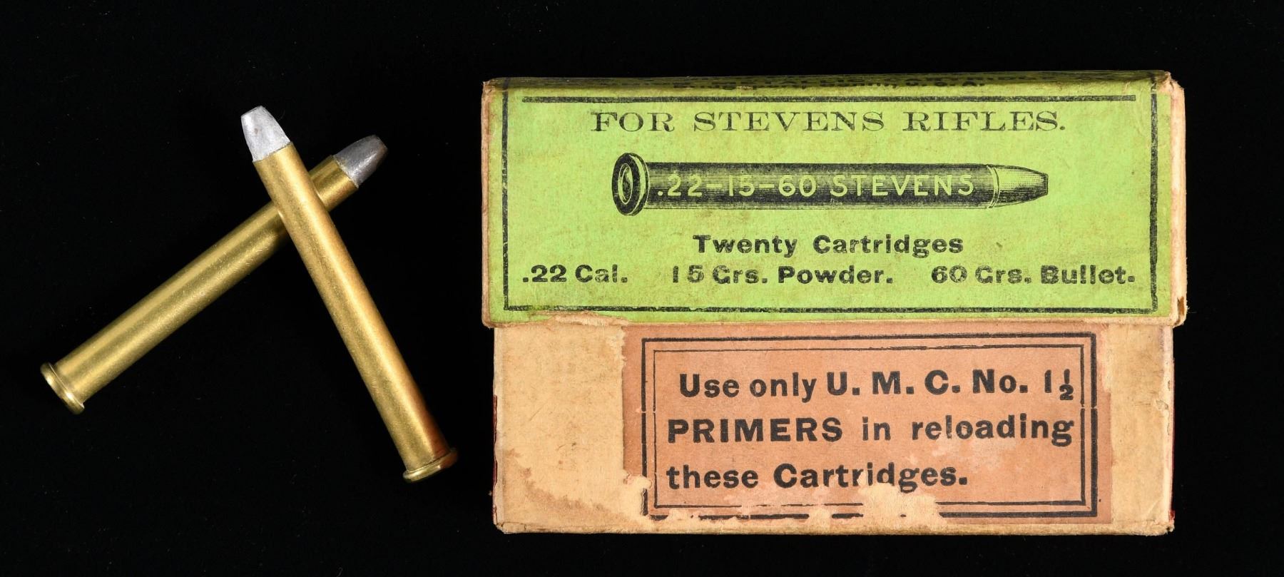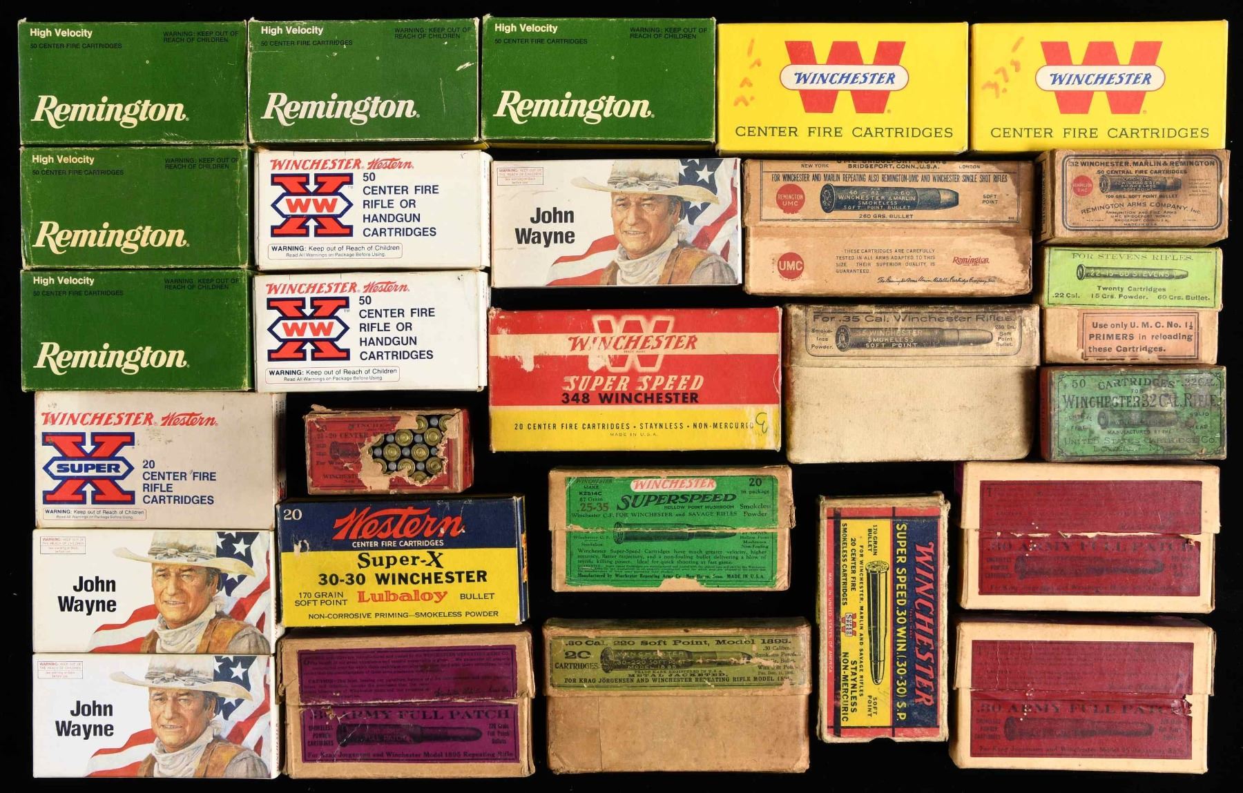 VINTAGE AMMO: all in very good condition to include boxes. 3 boxes of 20 Winchester John Wayne Commemorative nickel plated 32-40 (1 rd. missing). / 2 white boxes of 50 Winchester WW 180 gr. SP 38-40. / 2 yellow boxes of 20 Winchester 255 gr. SP 38-55 (boxes marked "3.75"). / 1 blue-yellow box of 20 Western Super-X 170 gr. SP 30-30. / 1 blue-red-yellow box of 20 Winchester Super Speed 170 gr. SP 30-30. / 1 red-yellow box of 20 Winchester Super Speed 150 gr. SP 348 Win. / 5 green-yellow boxes of 50 Remington 86 gr. SP 25-20. / 1 white box of 20 Winchester Western 200 gr. Silvertip 358 Win. / COLLECTOR 2 PIECE BOXED AMMO: conditions very good with flaws noted. 3 boxes of 20 having magenta colored tops by Winchester (3 rds. missing plus 3 with stained rims) 220 gr. Full Patch bullets for 30 Army (30-40 Krag). / 1 box of 20 having pale green colored tops by Winchester (1 rd. missing) 220 gr. Soft Point for Model 1895 (30-40 Krag). / 1 white box (soiled top) Remington UMC 20 rds. (1 fired case plus 3 missing) 250 gr. Soft Point 35 Win. / 1 tan box (water stained end) of 20 rds. Remington UMC 260 gr. Soft Point 40-82 Win. & Marlin. (4 with cleaned rims only). / 1 red box of 50 rds. Winchester Smokeless with lead bullets for 25-20 Single Shot. (approx. 1/3 of top eaten away plus cellophane tape repair). / 1 aged looking conventional box of 50 rds. Remington UMC 100 gr. Jacketed SP in 32-20. / 1 red-green box 50 rds. (only 20 remaining) Winchester Model 1873 lead bullet for "Winchester 32 Rifle" (32-20), great cond. ammo. / 1 green box 20 rds. (6 very nice, 2 missing & 12 with varying degrees of corrosion - mainly on rims) 87 gr. hollow points in 25-35. Saved the best for last: 1 green box of 20 rds. (2 missing) UMC 60 gr. 22 cal. Stevens with 15 gr. of black powder. (22-15-60) in truly remarkable condition to include the 2 piece box. Very rare and unbelievable condition !. (02-24465-1/NW). $750-1,000.