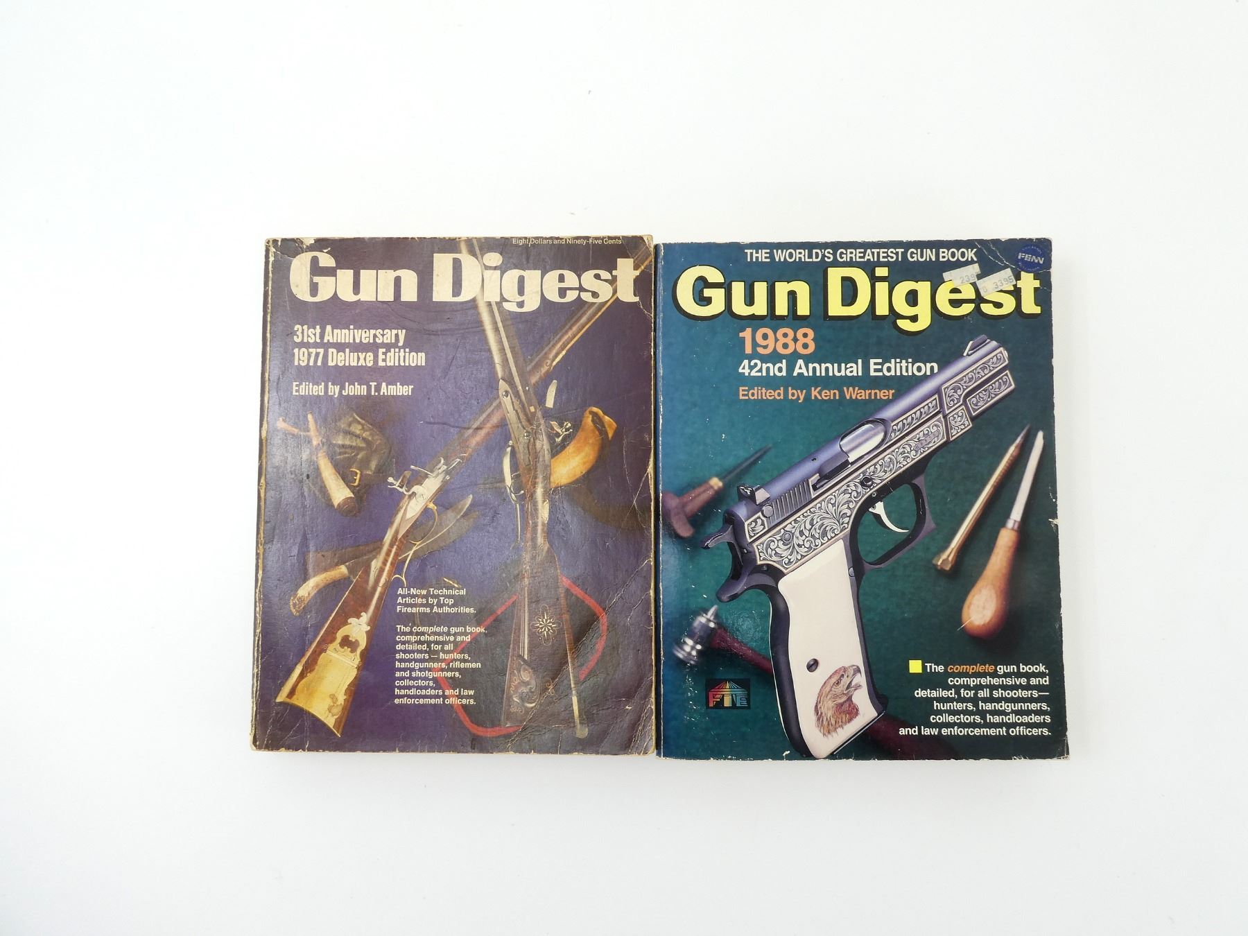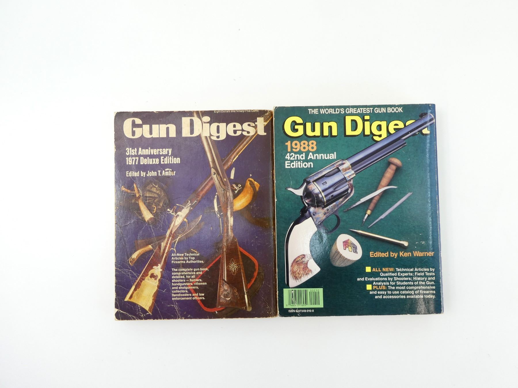 LOT INCLUDES; (1) "GUN DIGEST 31ST ANNIVERSARY 1977 DELUXE EDITION", EDITED BY JOHN T. AMBER, SOFT COVER, ISBN: 0-695-80674-2 & (1) "GUN DIGEST 42ND ANNIVERSARY 1988 ANNUAL EDITION", EDITED BY KEN WARNER, SOFT COVER, ISBN: 0-87349-010-X. SEE PHOTOS.