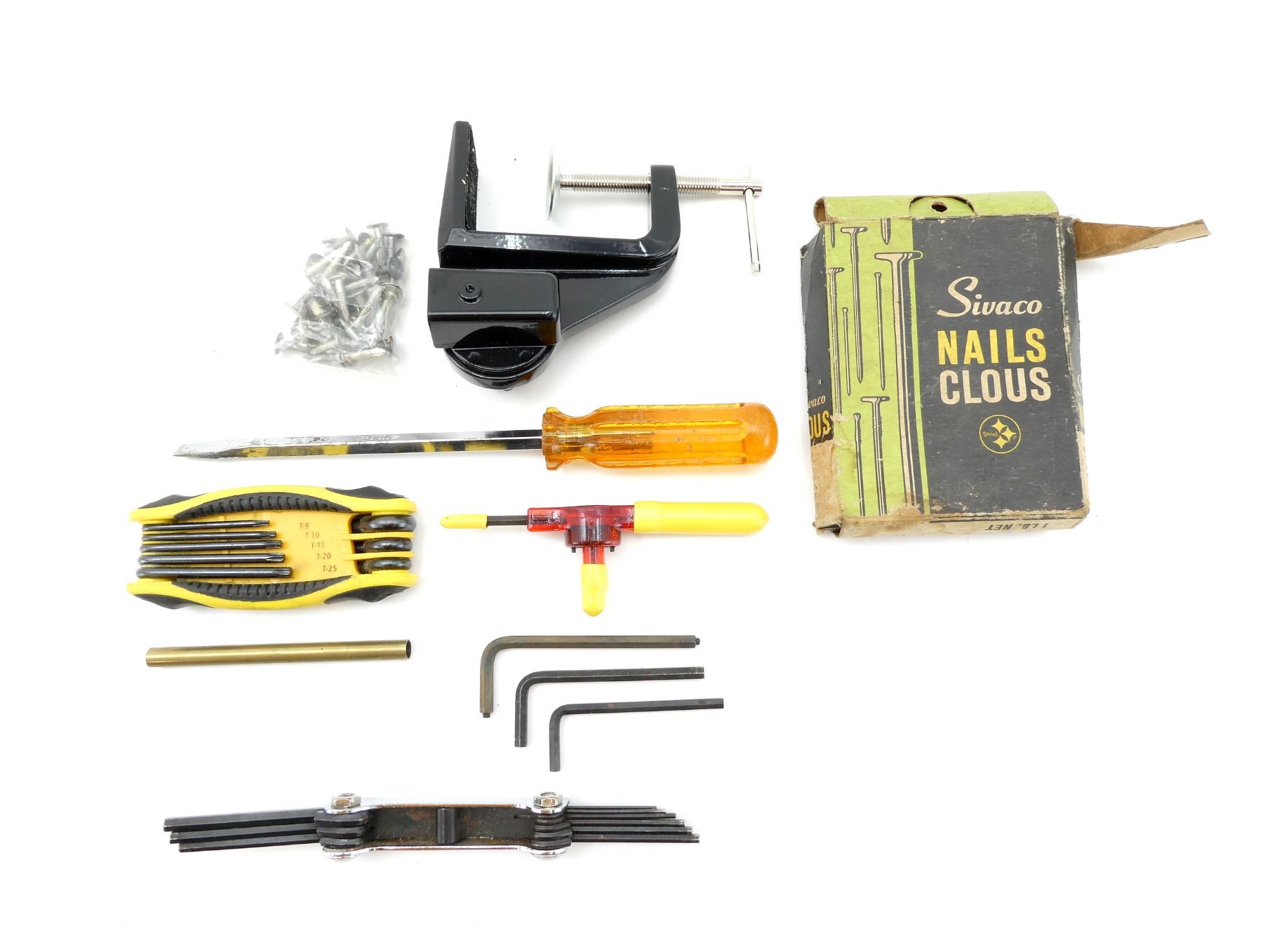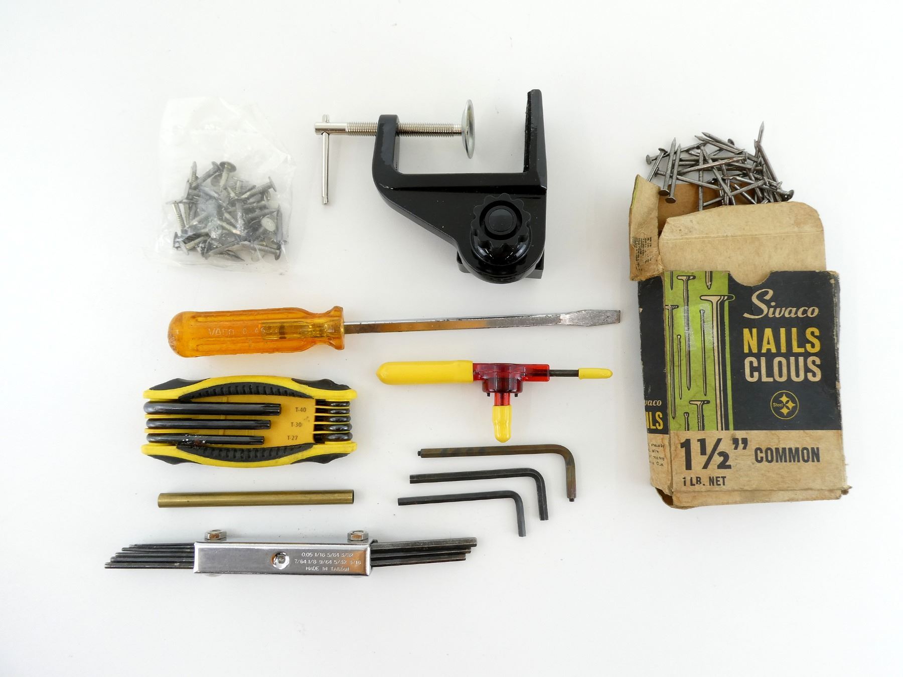 LOT INCLUDES; (1) C-CLAMP TABLE MOUNTING BRACKET, (1) STANLEY 8-PIECE FOLDING STAR HEX KEY SET, 1.5" COMMON SIVACO NAILS, (1) UNKNOWN FOLDING HEX KEY SET, (1) SCREWDRIVER & (3) ALLEN KEYS, ETC. SEE PHOTOS.