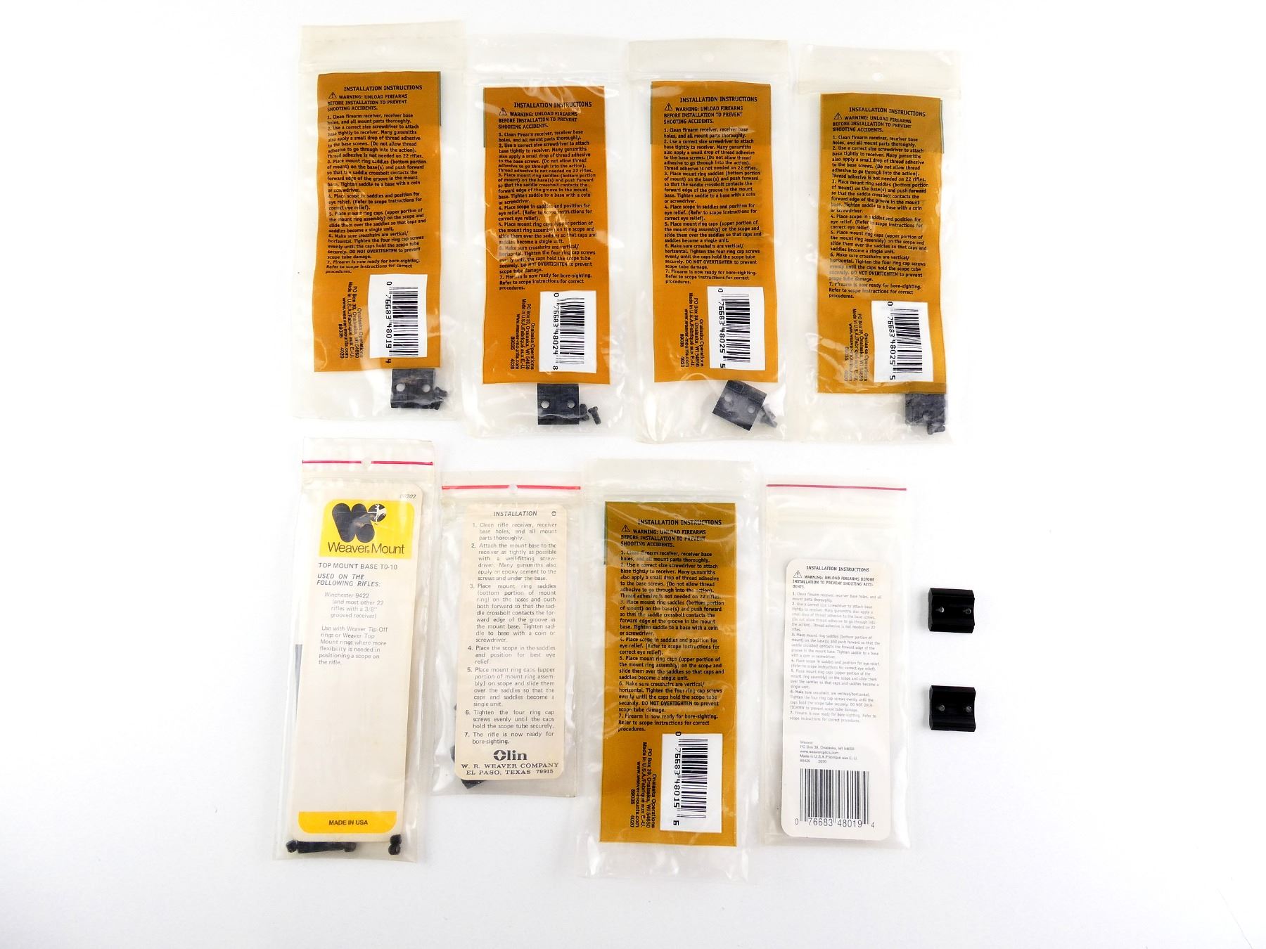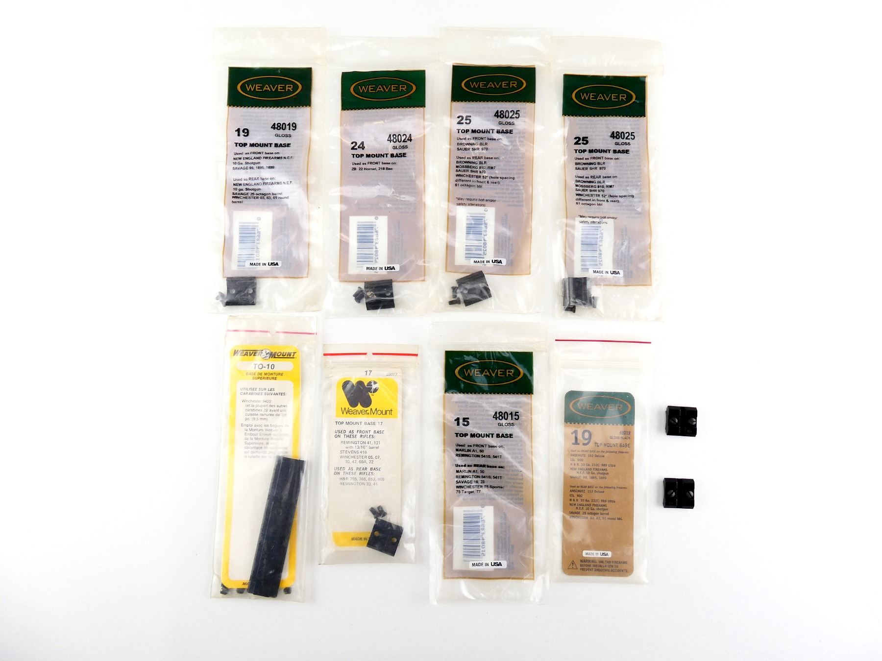 LOT INCLUDES; (8) WEAVER TOP MOUNT BASES, NO. 15 / 17 / 19 / 24 / 25 / ETC., PRODUCT #: 08202 / 48015 / 08017 / 48019 / 48024 / 48025, WITH ORIGINAL PACKAGING, 6 SEALED IN PACKAGING. MAY REQUIRE FITTING. SEE PHOTOS.