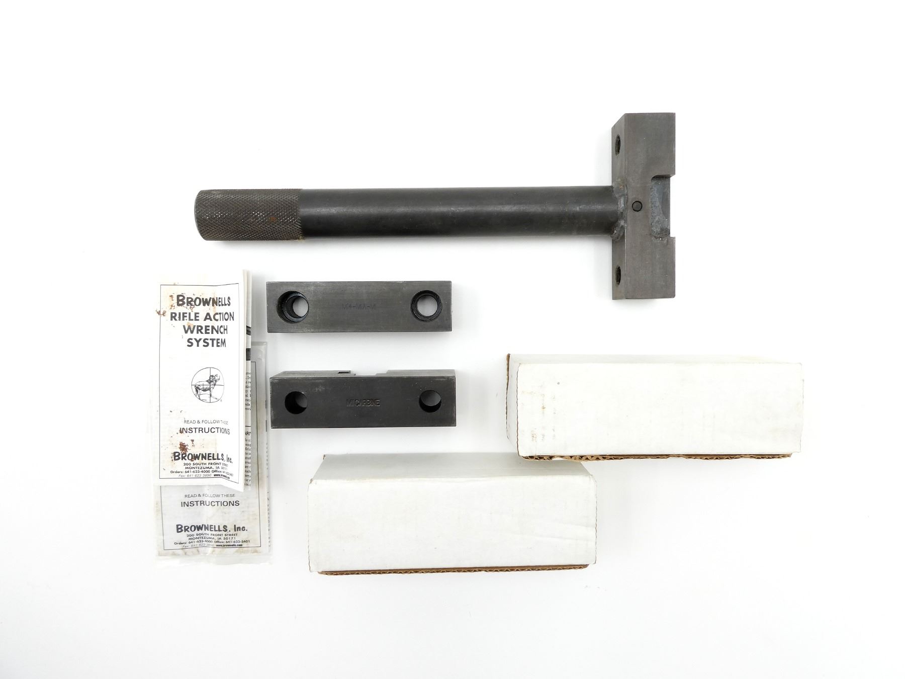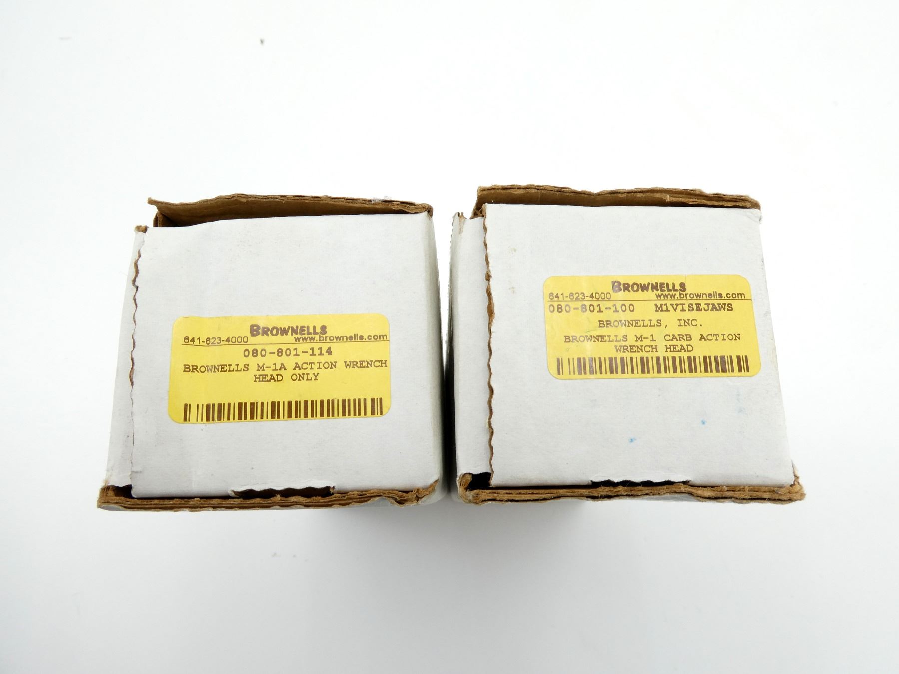 LOT INCLUDES; (1) UNKNOWN UNIVERSAL ACTION WRENCH, (1) BROWNELL'S M-1 CARBINE ACTION WRENCH HEAD, PRODUCT #: 080-801-100, IN ORIGINAL PACKAGING WITH INSTRUCTIONS & (1) BROWNELL'S M-1A ACTION WRENCH HEAD, PRODUCT #: 080-801-114, IN ORIGINAL PACKAGING WITH INSTRUCTIONS. MISSING BOLTS. SEE PHOTOS.