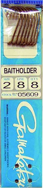Gamakatsu 05609 Snelled Baitholder Hook, Size 2, Needle Point, Sliced Shank, Offset, Ringed Eye, Bronze, 8 per Pack. This listing is for one brand new, unopened, factory sealed unit. UPC: 89726010579.