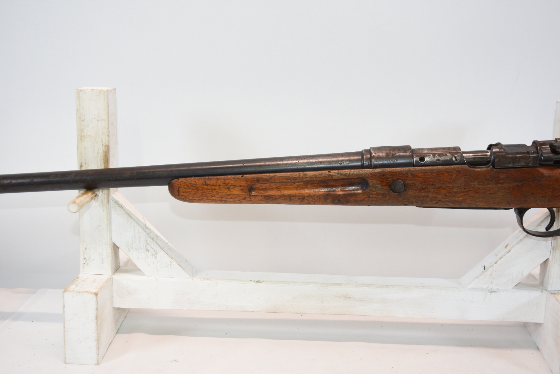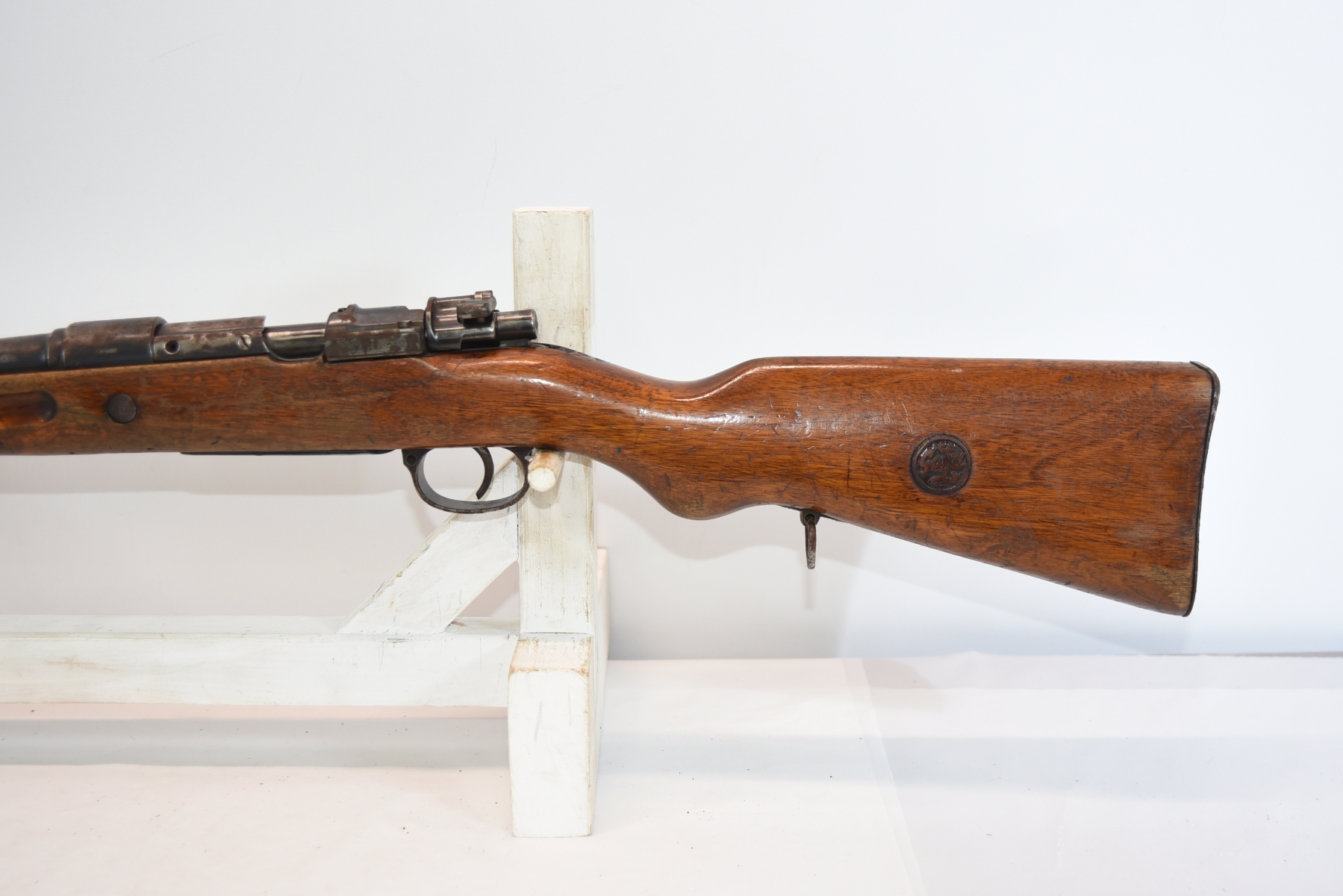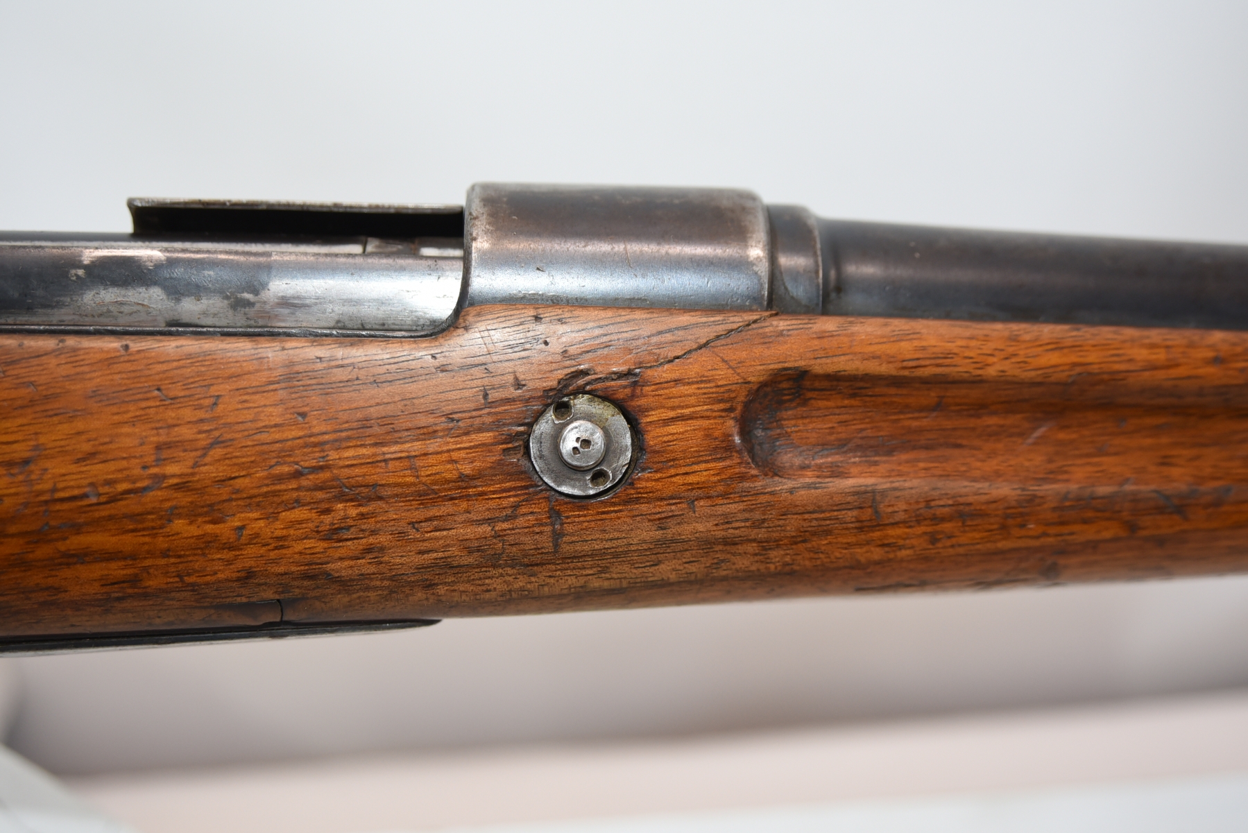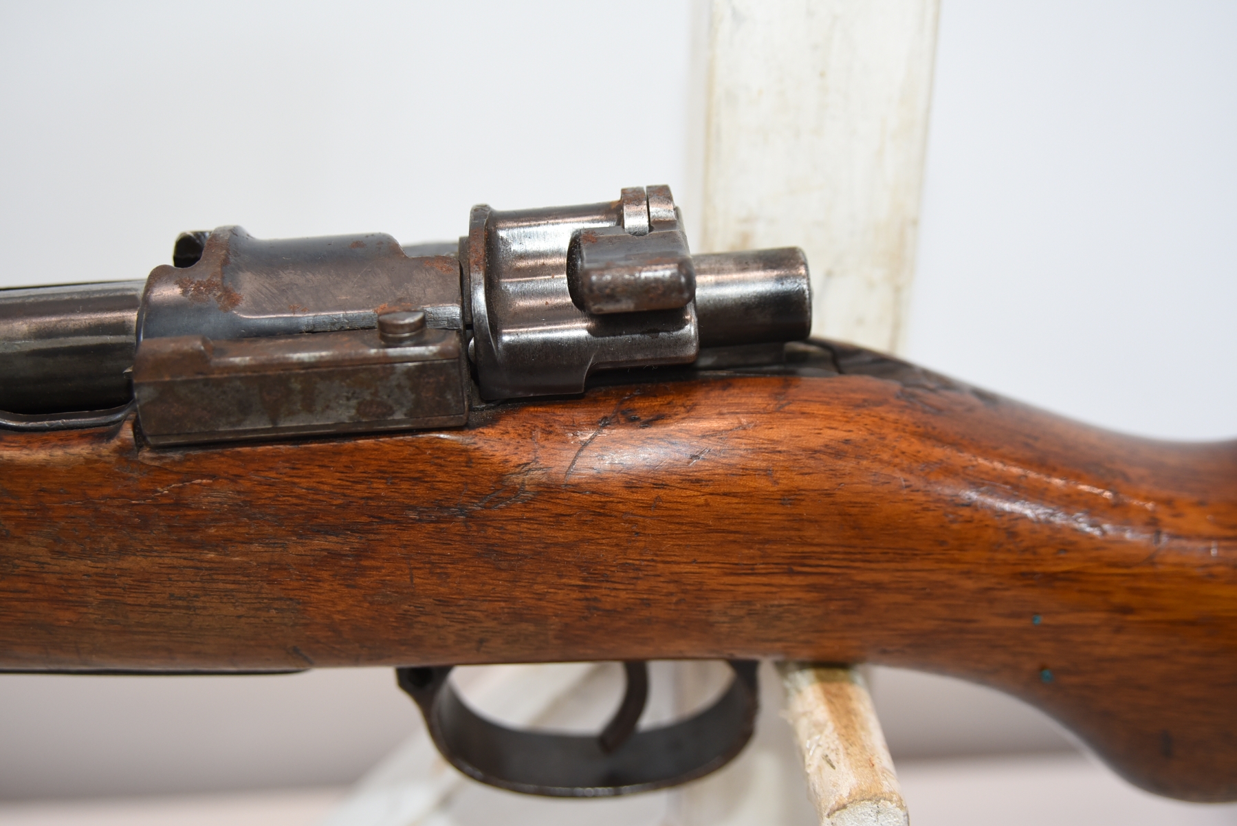 Wood stock shows lots of scratches, scuff, dents, small cracks, chips; condition is good.