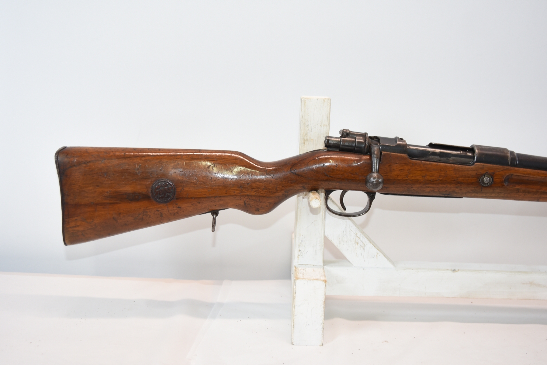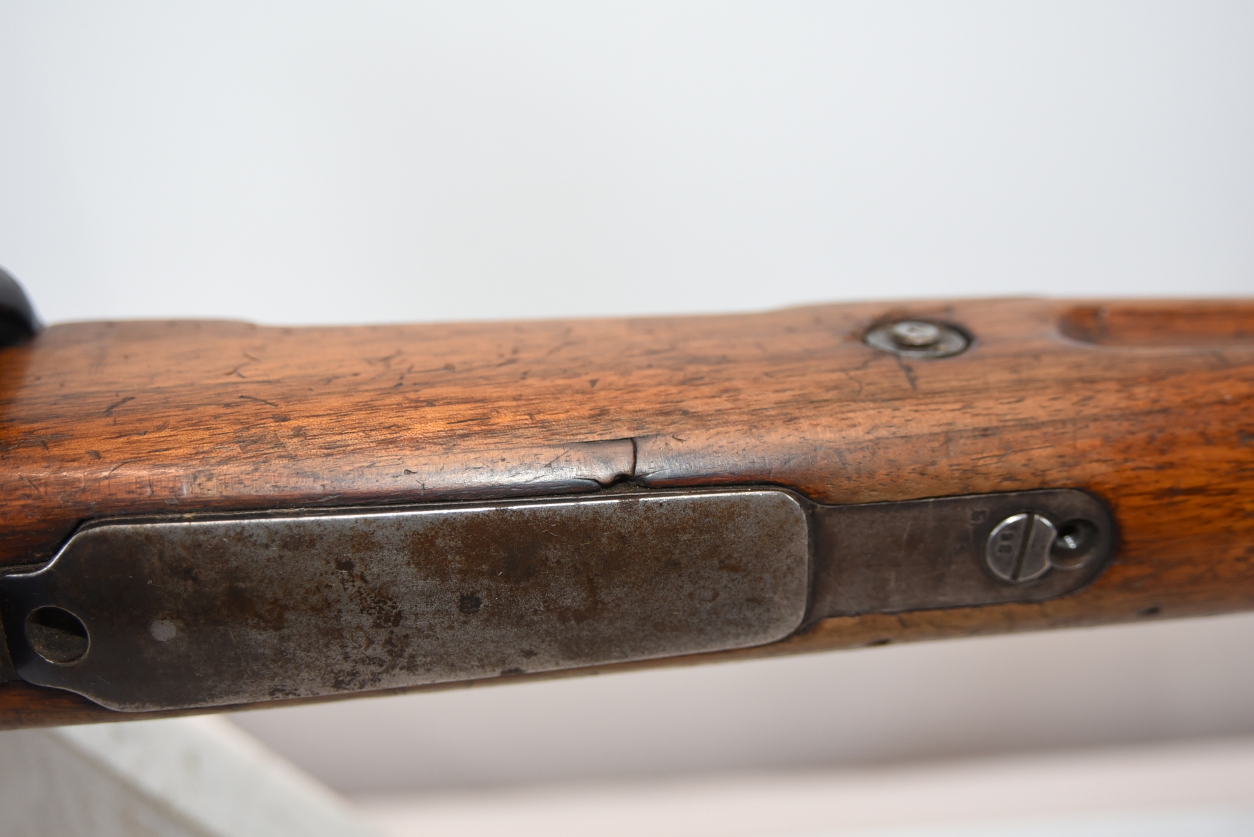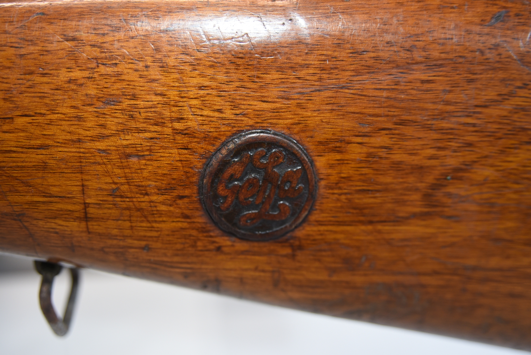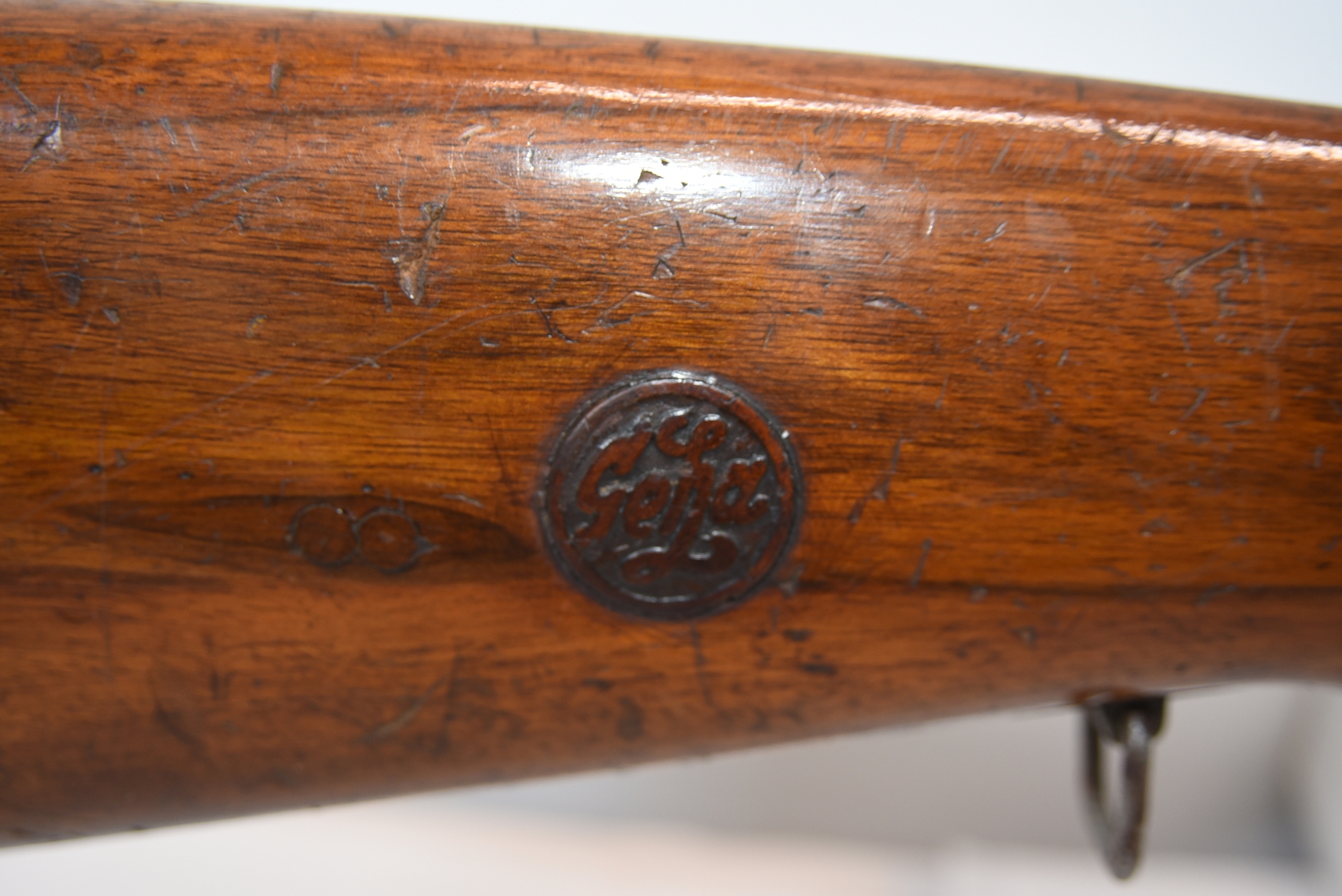 Wood stock shows lots of scratches, scuff, dents, small cracks, chips; condition is good.