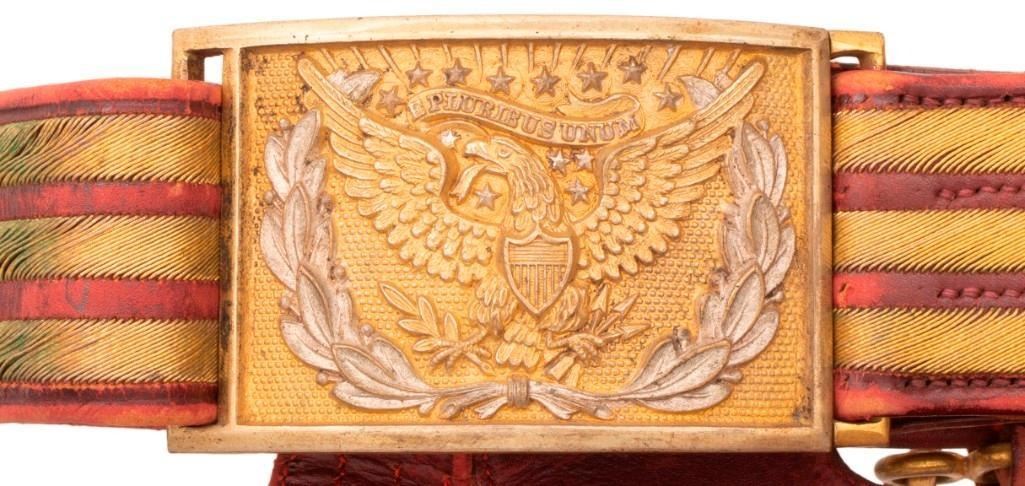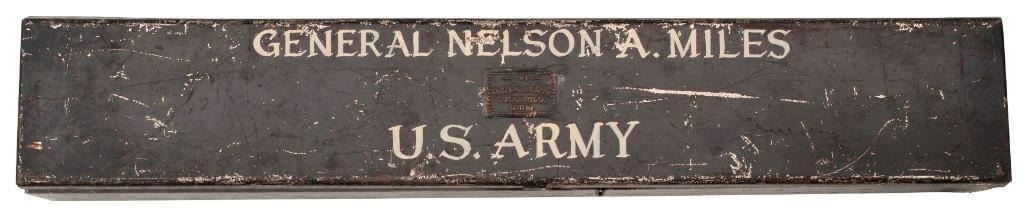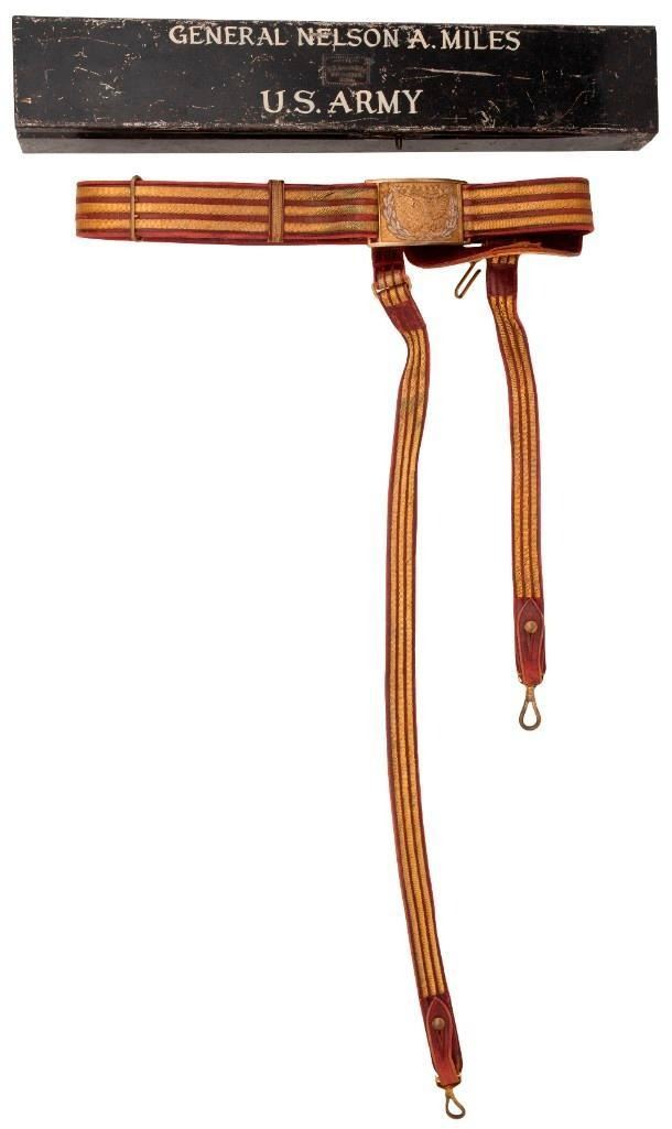 A red leather and gold bullion Generals sword belt attributed to General Nelson A. Miles in a Japanned tin case, stencil marked General Nelson A. Miles US Army, tin case with M.C. Lilley & amp; Co. Columbus Ohio, medal buckle with American eagle and shield.