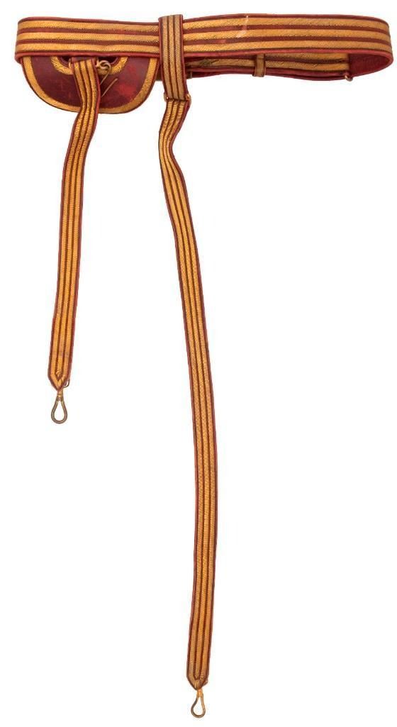 Overall good condition. Restoration to the stenciling. Belt leather and gold bullion in good vibrant condition. Minor greenish stain in small area of gold bullion.
