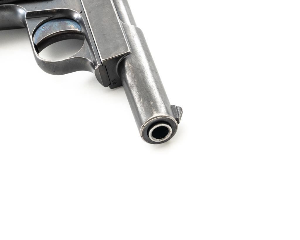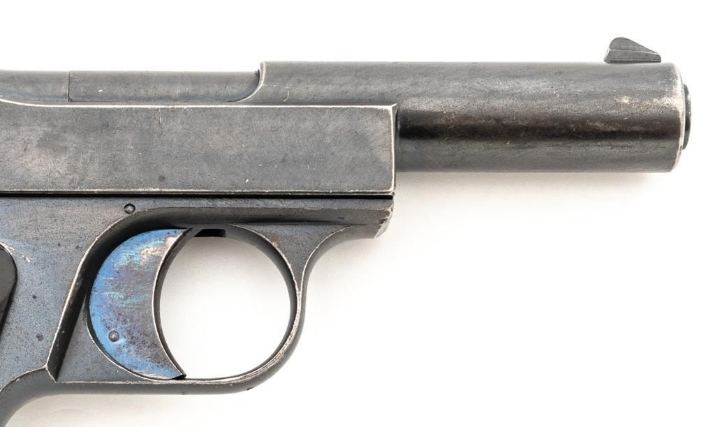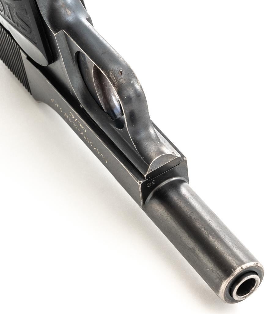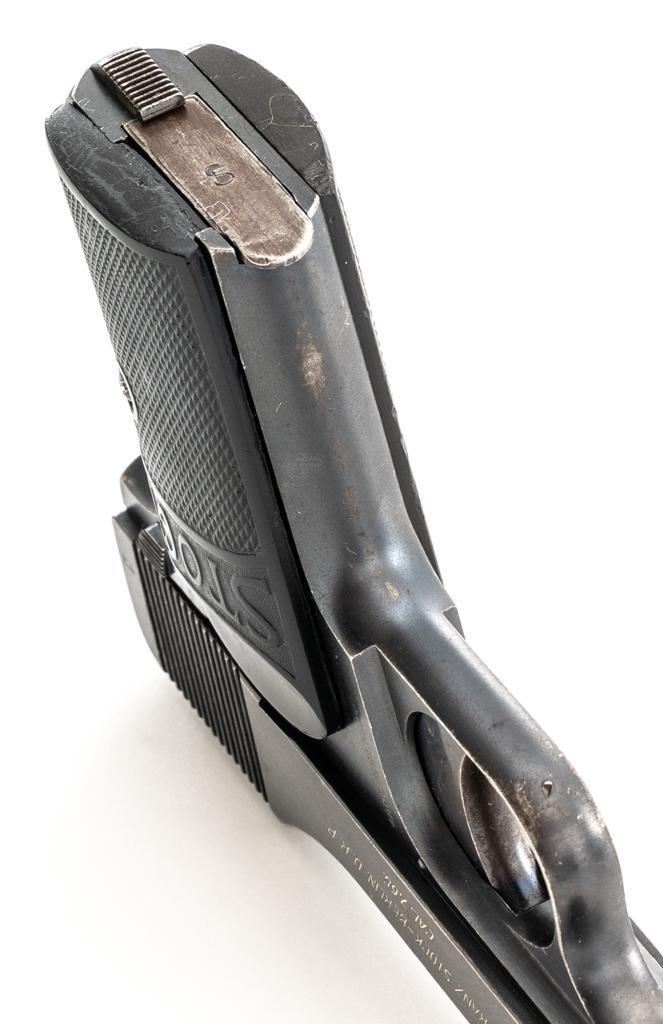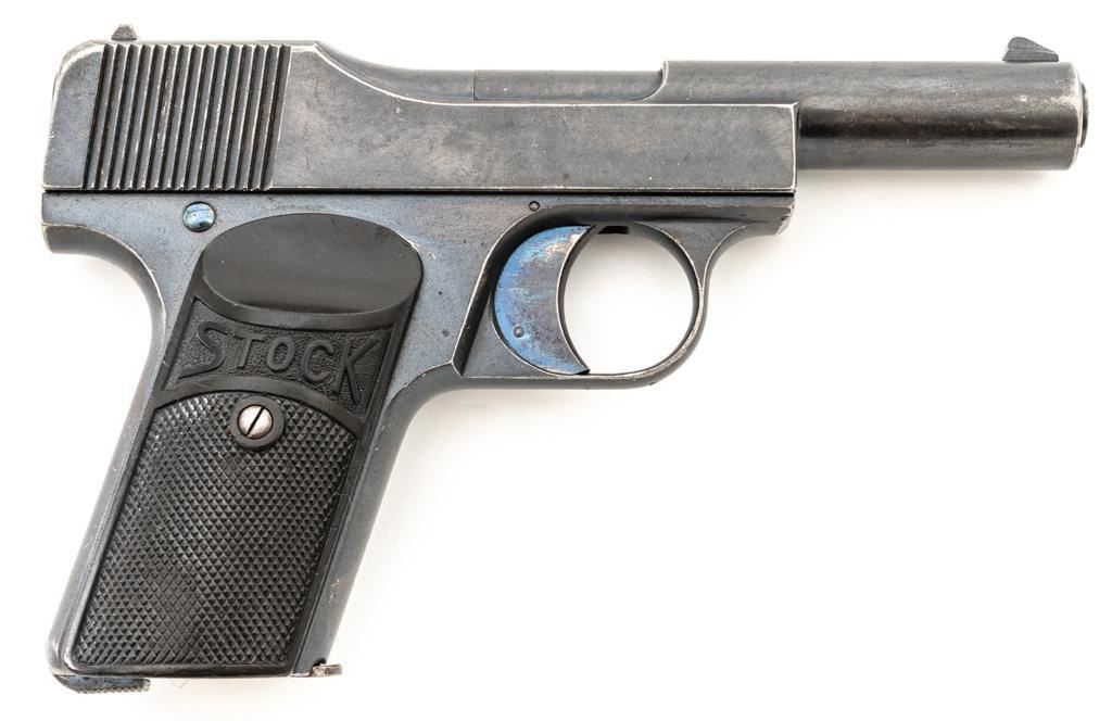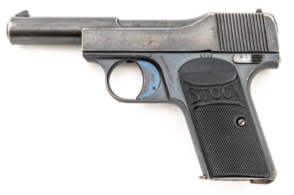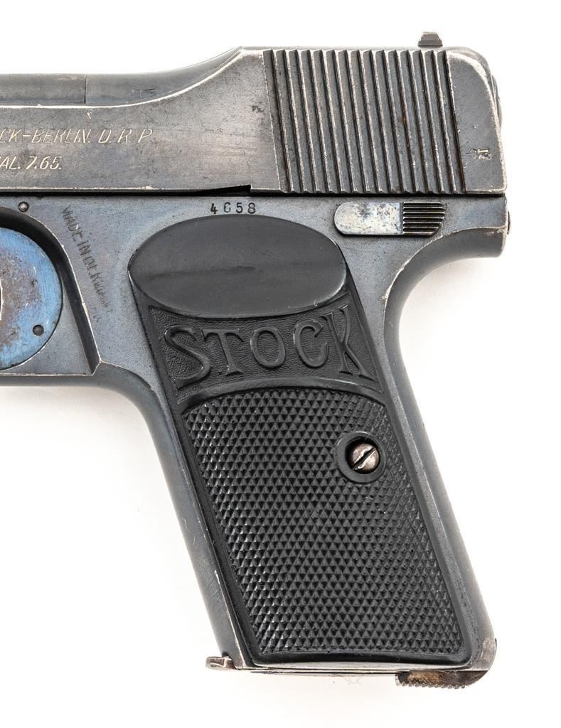 German Franz Stock Semi-Automatic Service Pistol Type I, #4658, .32 ACP cal., 3.9" barrel, blue finish, checkered hard rubber two-piece Stock grips, blade front sight, and fixed "U"-notched rear sight, with one 8-round blue steel magazine. Magazine base is marked "FS". Left side of the slide is marked "FRANZ STOCK-BERLIN. D.R.P.", with a German "(crown)N" at the left rear of the slide, barrel and frame. Left side of the frame is lightly marked "MADE IN GERMANY" vertically behind the trigger. All matching visible serial numbers. No import marks. Mfgd from 1920-1940. Pistol is in near fine overall condition, retaining approx. 85%-90% thinning finish, with wear at the muzzle, scattered light surface erosion, and edgewear. Grips are in very good condition, with small mars at the top of the right panel, and some age cracks at the base. Action functions well. Bore is very good with scattered visible light erosion and well-defined rifling. Est.: $400-$600. (C&R/PPT)