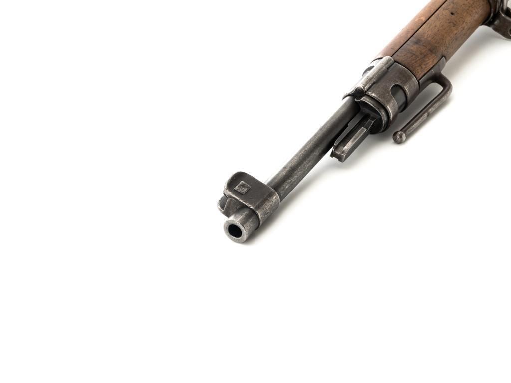 German Kar 98a Mauser Bolt Action Rifle, #5077M, 8x57mm cal., 23.75" barrel, blued finish, hardwood stock and handguard, inverted-"V" front sight with protectors, and adjustable tangent rear sight with "V"-notched groove, graduated to 2000 meters. Stock has no grasping grooves or takedown washer. Top of the receiver ring is marked "(crown)/ERFURT/1918" with a firing proof on the left side, and four crowned inspection stamps on the right side. Left side of the receiver rail is marked "Kar 98". There is a faint inspection stamp on right side of the buttstock. A five pointed star has been stamped into the right side bolt way. Numbers do not match. Import marked on left side of the barrel. Condition overall is good, retaining approx. 30%-35% blue, with most parts showing wear and brown toning, with spots of patina to the rear receiver bridge. Wood has a matte colored appearance, and there is a crack through both sides of the buttstock, behind the wrist; cracks to the front and rear of the handguard. Action operates smoothly. Bright bore rates good, with defined rifling. Est.: $700-$900. (C&R)