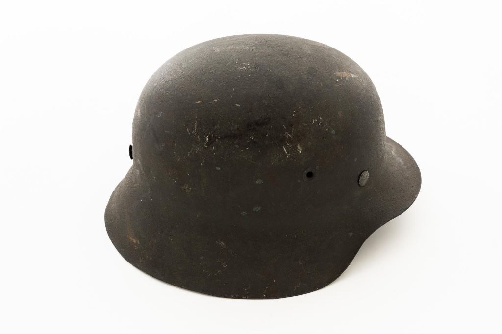 German M42 Steel Helmet with Replacement Black Leather Chin Strap and Tan Liner. Shell exterior is painted a rough dark green color and the interior with a smooth dark green paint. The Manufacturer and size markings are painted over, "4375" stamped on the rear brim. The liner has nine tongues that are attached in the center with a rope cord. Condition is very good, showing moderate wear and darkening to the shell. Liner shows light wear and darkening. Chin strap is stamped "RB.NR." and is in very good condition, showing light wear. Est.: $200-$300.