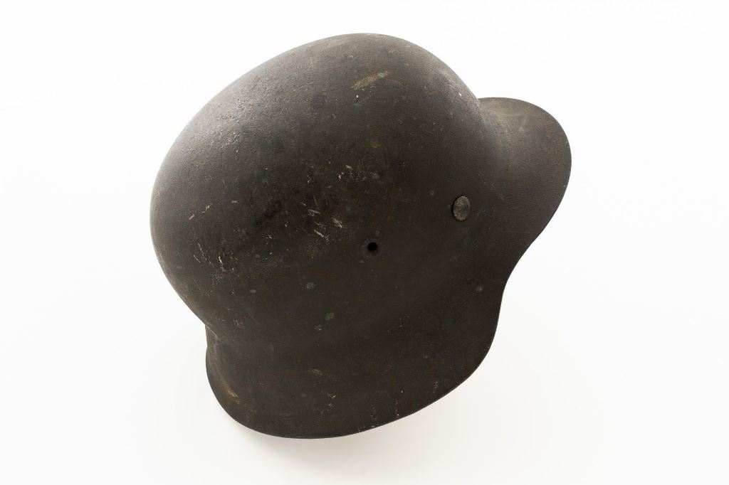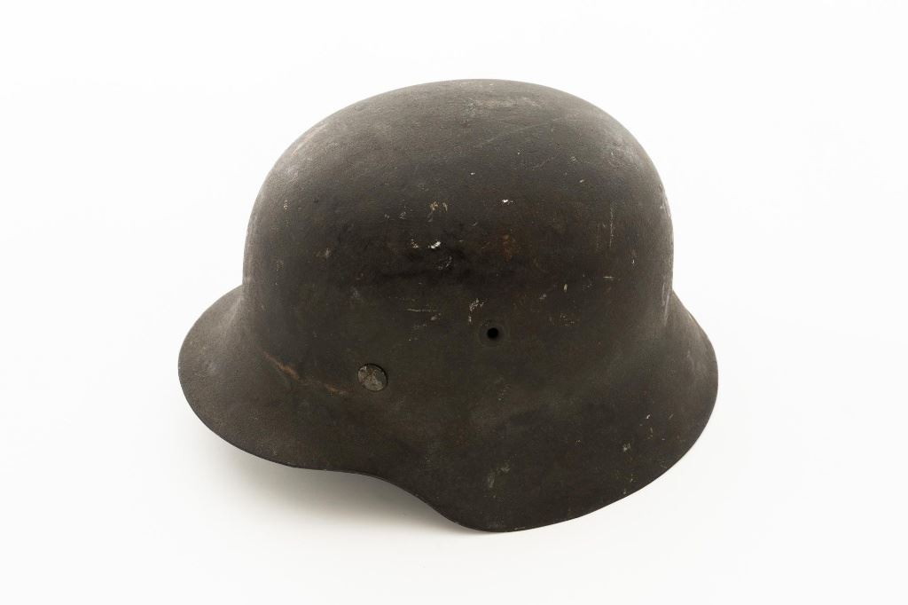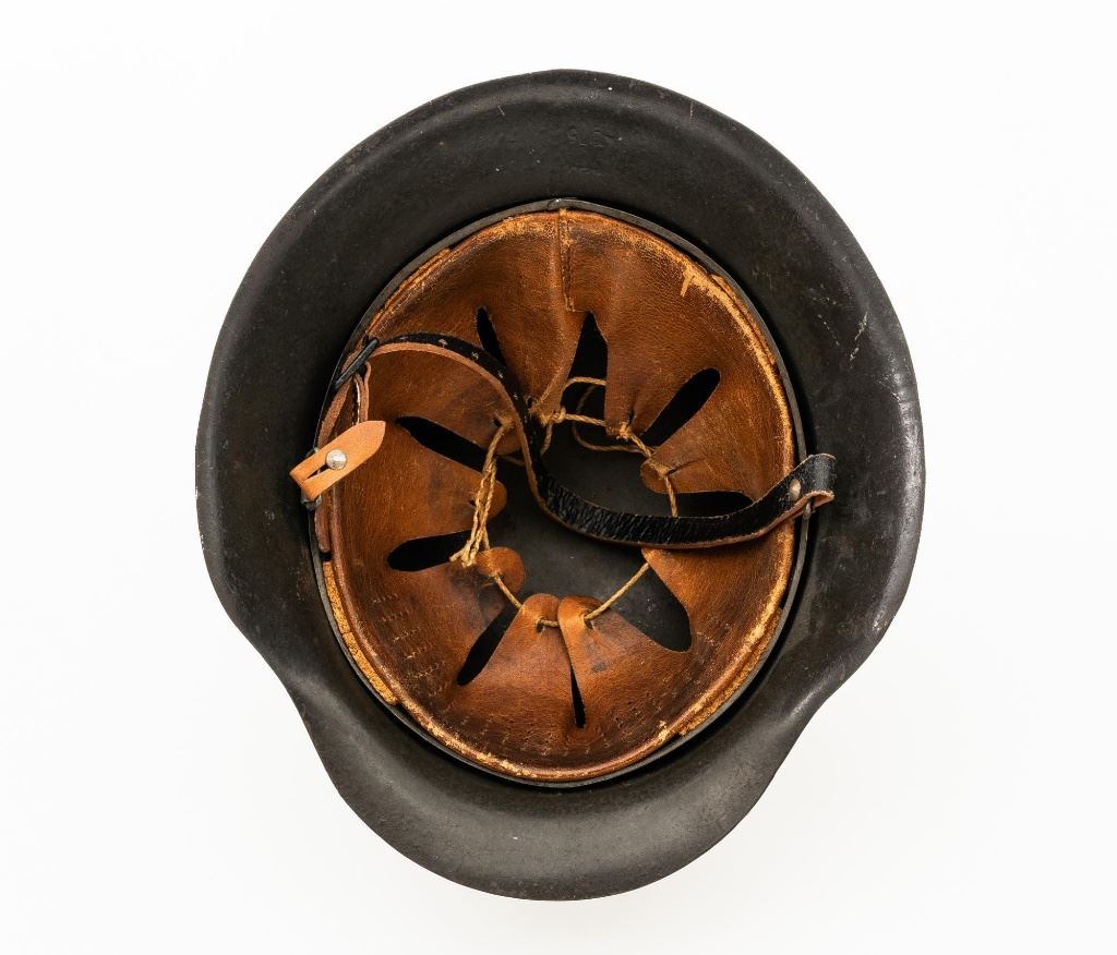German M42 Steel Helmet with Replacement Black Leather Chin Strap and Tan Liner