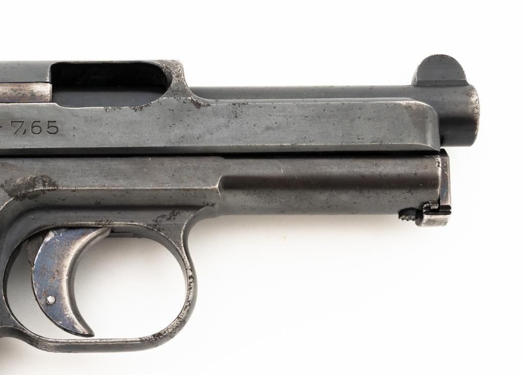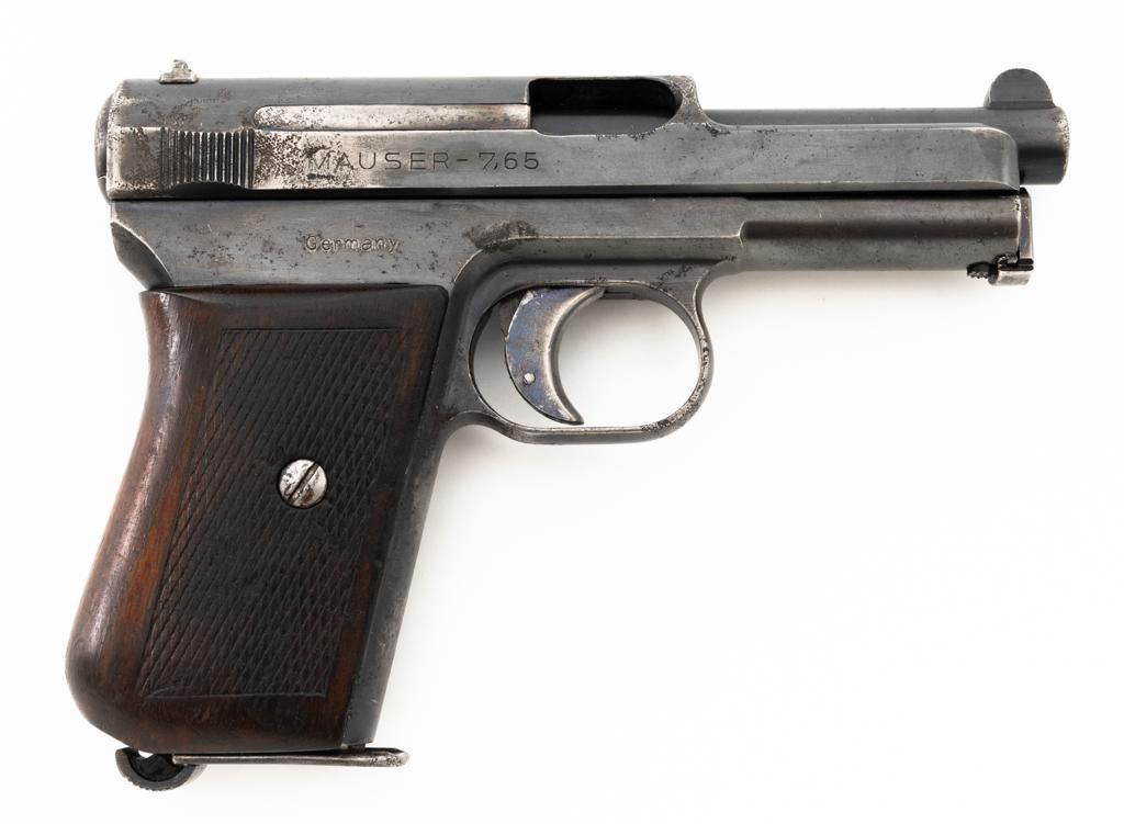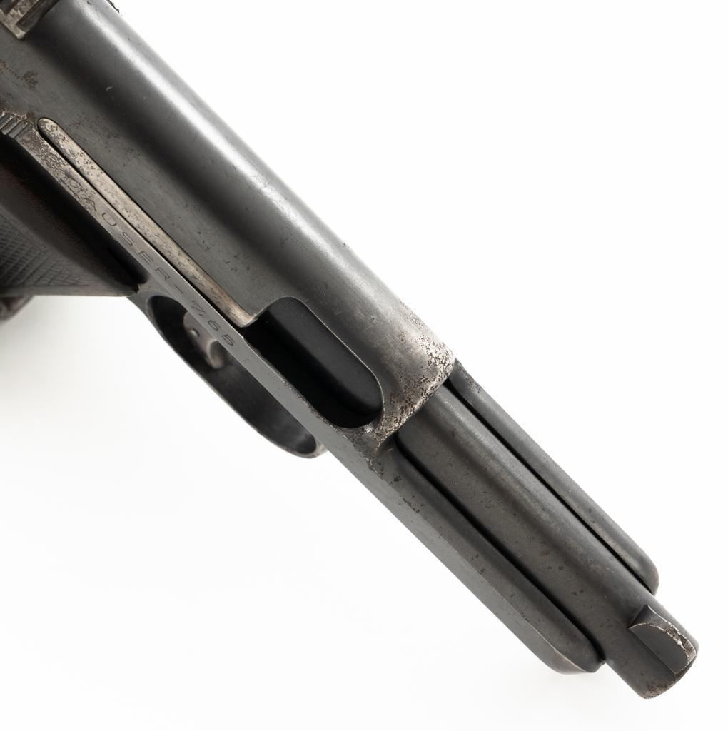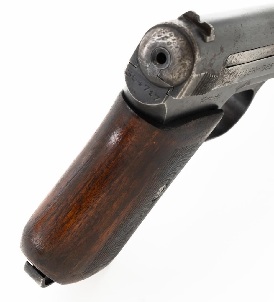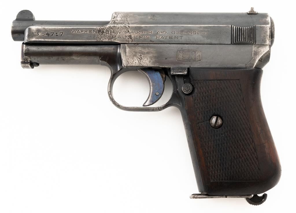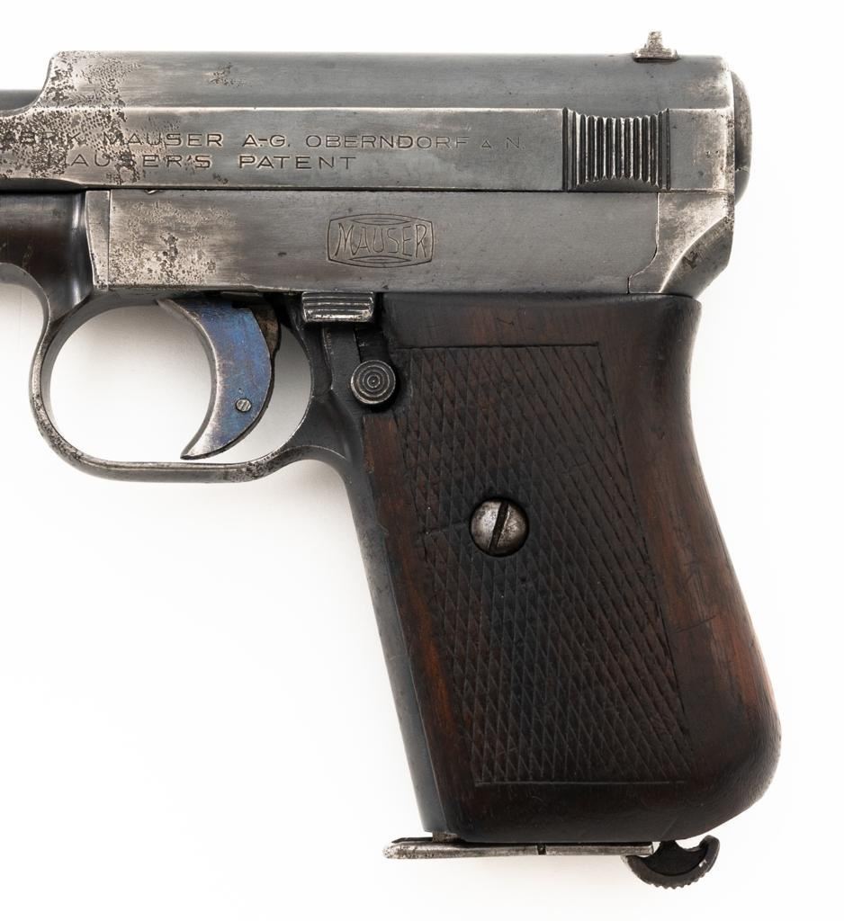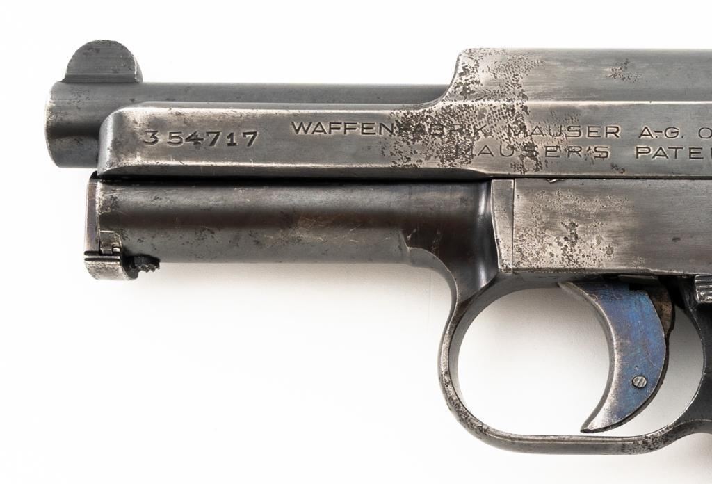 German Model 1914 Mauser Semi-Automatic Pistol, #354717, .32 ACP cal., 3.4" barrel, blued finish, checkered hardwood one-piece grip, blade front sight, and fixed rear sight with "U"-notched groove. Includes one magazine with bright steel body and blued floorplate, with "Mauser" logo on the left side. Left side of the slide is marked "WAFFENFABRIK MAUSER A.-G. OBERNDORF A.N./MAUSERS PATENT" with "MAUSER-7,65" on the right side. There is a "Mauser" logo on left side of the frame. Matching numbers on the frame and slide. Marked "GERMANY" on right side of the frame. Condition overall is fair, with the metal showing overall wear and patina. There is pitting to left side of the frame and both sides of the slide. Grips shows general age and handling wear. Action operates smoothly. Bore is bright with very good rifling. Est.: $200-$300. (C&R/PPT)