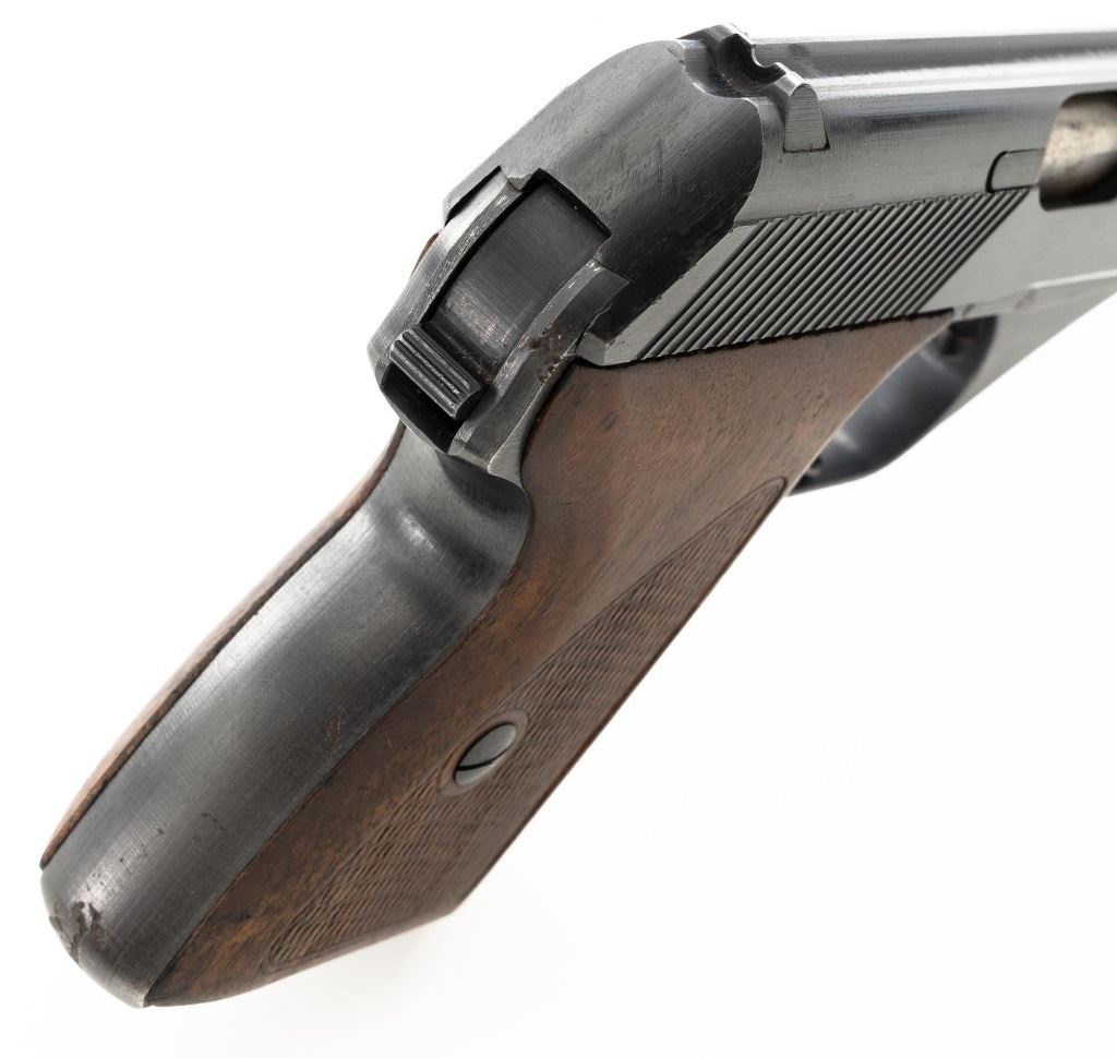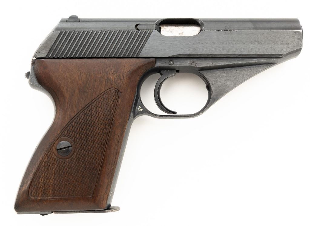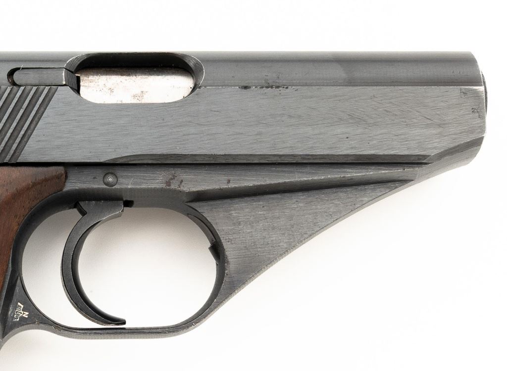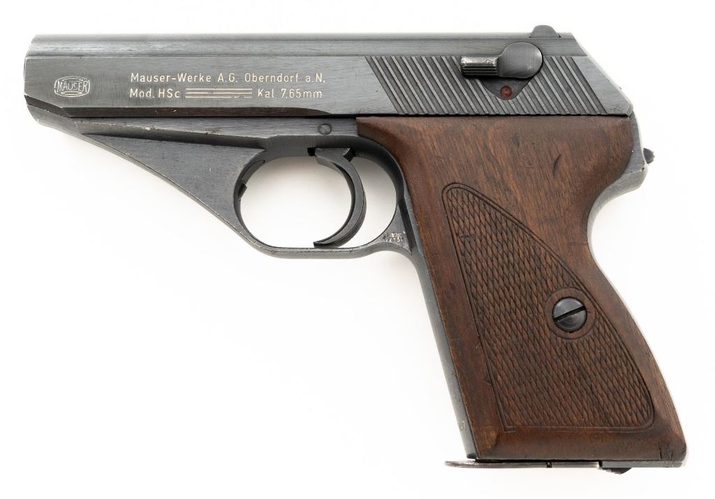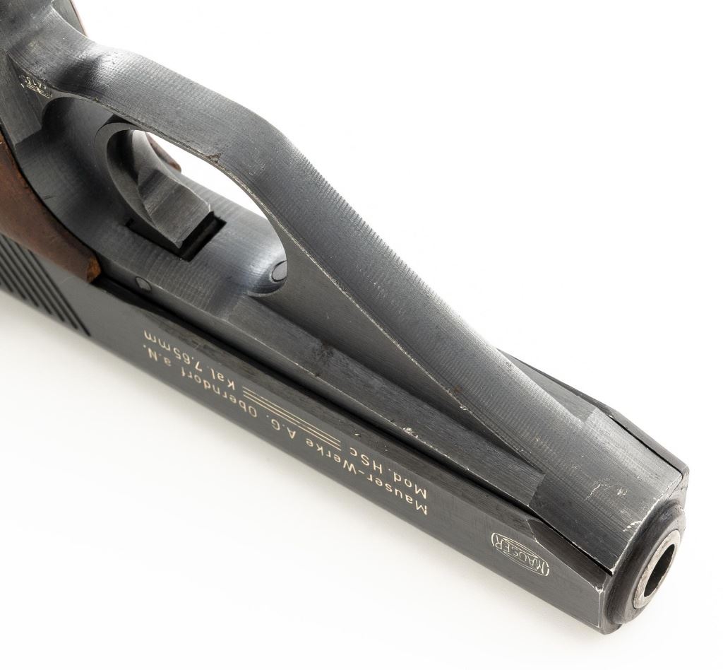 German WWII Mauser HSc Semi-Automatic Pistol, #935047, .32 ACP cal., 3.4" barrel, blued finish, checkered walnut grips, low profile blade front sight, and fixed rear sight with "U"-notched groove. Includes one unmarked phosphate finished magazine with blued floorplate. Pistol is last variation of WWII production and is marked "(eagle)/WaA 135" Waffenamt on left side of the trigger guard, with an "(Eagle)N" proof on the right side. Left side of the slide is marked "(Mauser logo) Mauser-Werke A.G. Oberndorf a.N./Mod.HSc(three lines)Kal.7,65mm". No visible import marks. Condition overall is very good, retaining approx. 85%-90% blue, with an area of roughness to right side of the frame, an area of pitting to the rear of the frame, toning and patina to the grip straps. Grips are very good with scattered impressions and handling marks, especially to the left side. Action operates smoothly. Bore is bright with very good rifling. Est.: $600-$900. (C&R/PPT)