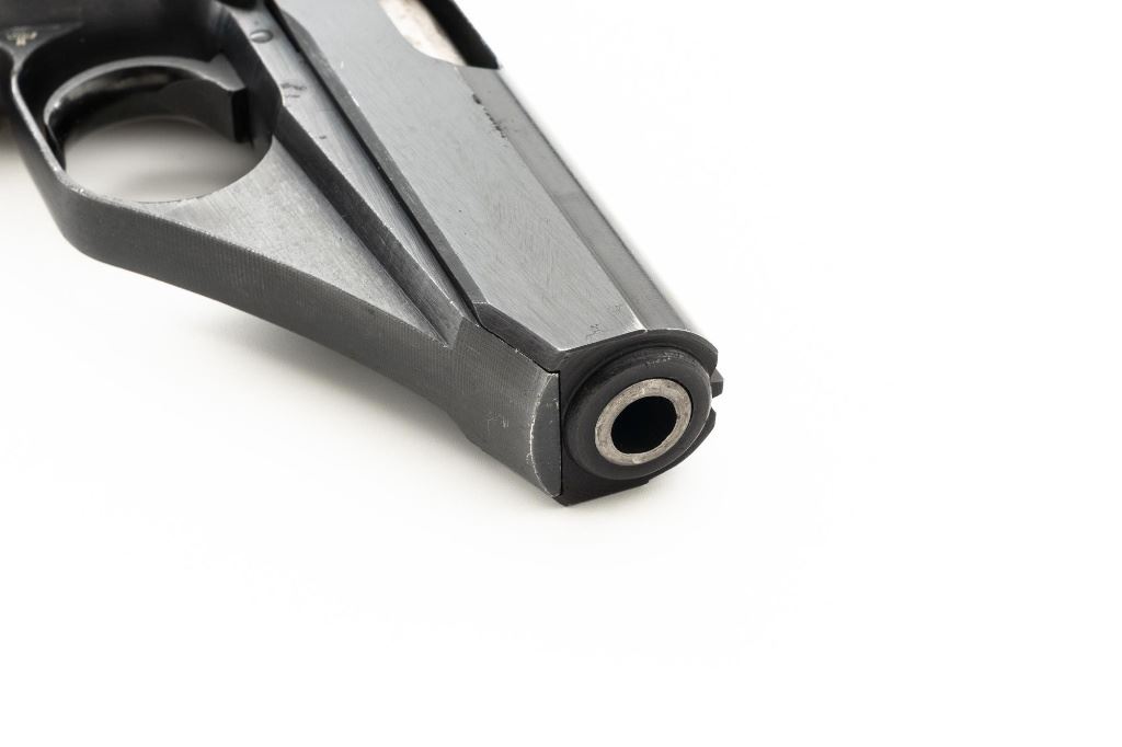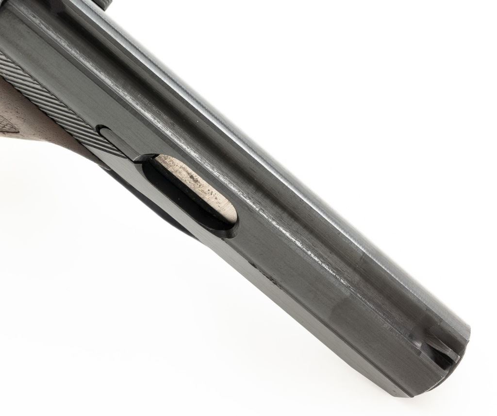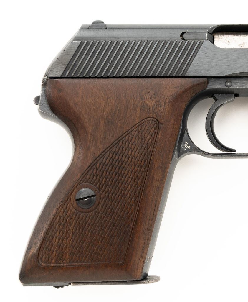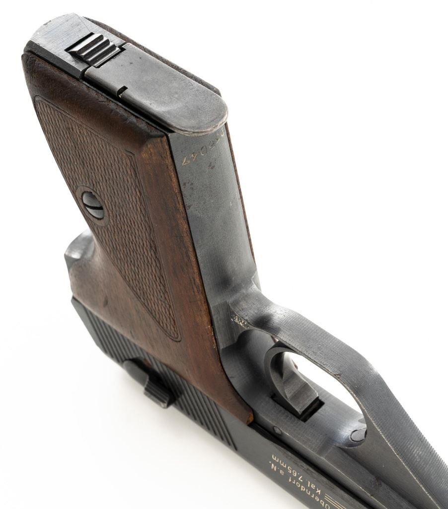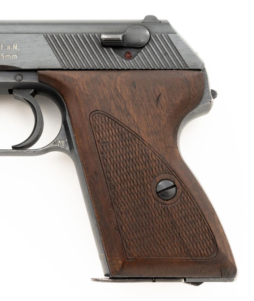 German WWII Mauser HSc Semi-Automatic Pistol, #935047, .32 ACP cal., 3.4" barrel, blued finish, checkered walnut grips, low profile blade front sight, and fixed rear sight with "U"-notched groove. Includes one unmarked phosphate finished magazine with blued floorplate. Pistol is last variation of WWII production and is marked "(eagle)/WaA 135" Waffenamt on left side of the trigger guard, with an "(Eagle)N" proof on the right side. Left side of the slide is marked "(Mauser logo) Mauser-Werke A.G. Oberndorf a.N./Mod.HSc(three lines)Kal.7,65mm". No visible import marks. Condition overall is very good, retaining approx. 85%-90% blue, with an area of roughness to right side of the frame, an area of pitting to the rear of the frame, toning and patina to the grip straps. Grips are very good with scattered impressions and handling marks, especially to the left side. Action operates smoothly. Bore is bright with very good rifling. Est.: $600-$900. (C&R/PPT)