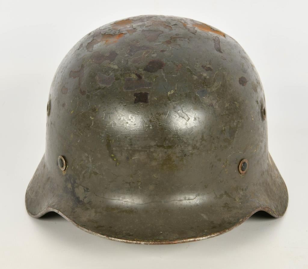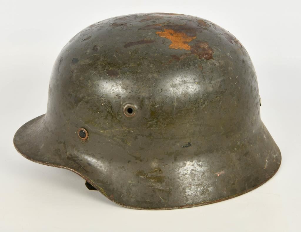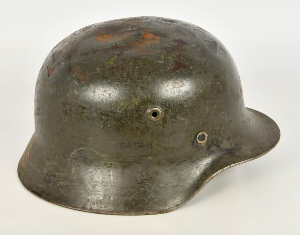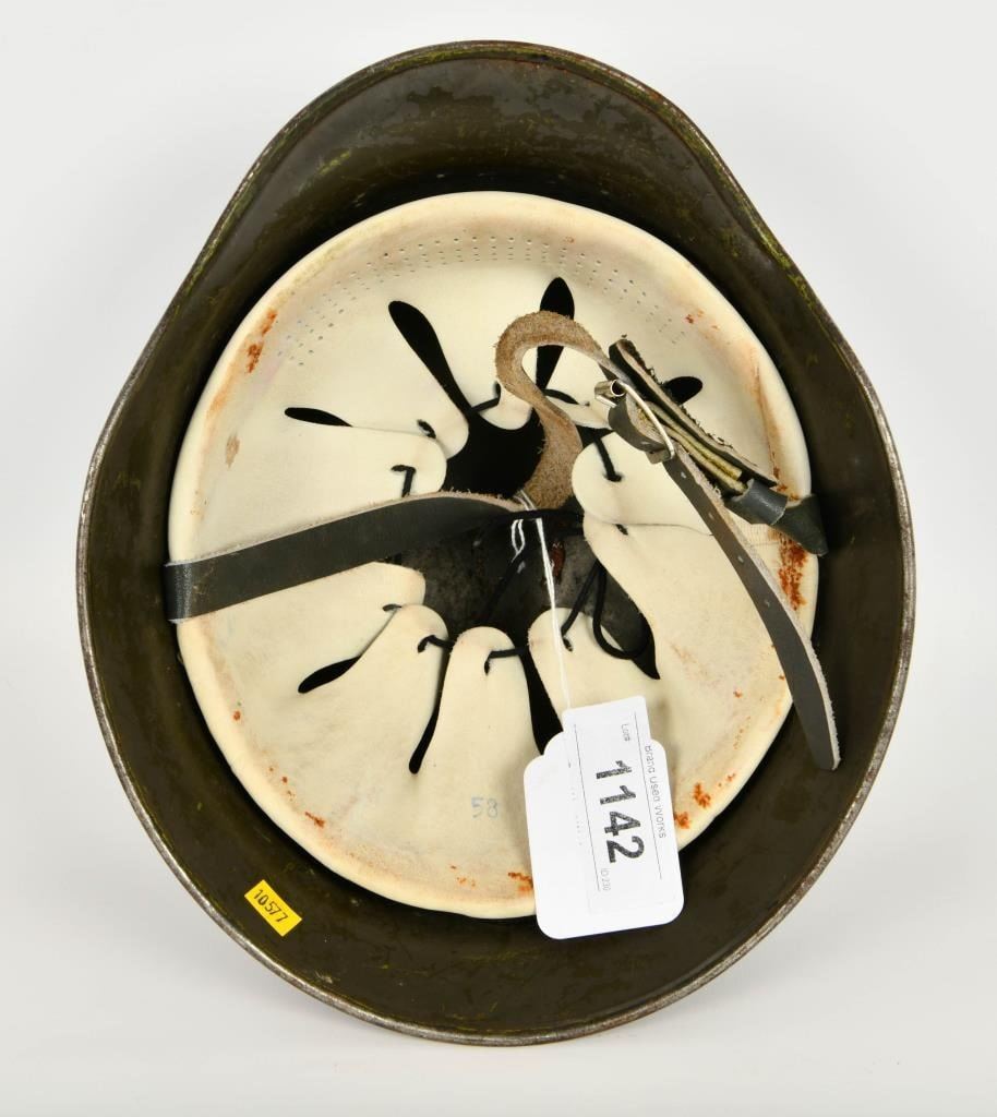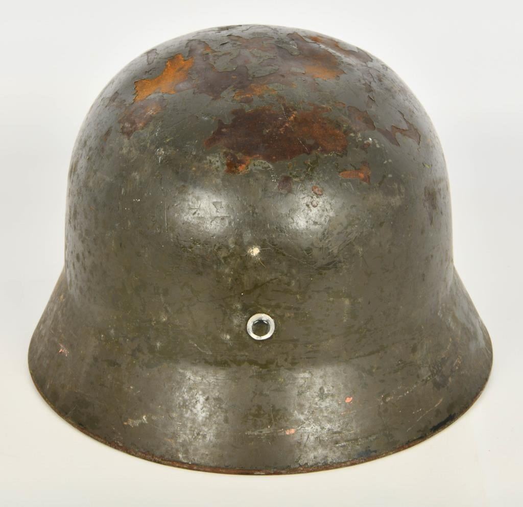 WWII German Type Steel Helmet Finnish M40/55 - with liner and strap- WWII German helmet stocks from the government of Finland These helmets are 100% genuine German manufactured WWII type M40 steel combat helmets Supplied throughout WWII and then under special contract for the Finnish Army in 1955, hence, they have become known as the M40/55 helmet. However, these helmets were made in the same factory, on the same machines and by some of the very same people that produced them for Germany in WWII. They are nearly identical to WWII issue M40 helmets (and are often sold as such) with the classic rolled edge, correct steel thickness, and pressed ventilation holes. The leather liners and chinstraps were made in Finland for the Finnish army who called it the M55 helmet; styles vary, as some of the helmets were used up until the early 1970s. some liners may be reproduced as well as straps, PLEASE NOTE; REFER to pictures to make your own determination, we described the War Helmets as best we could but we are not Helmet experts. Also, helmets may come with dents or scratches or paint removed or missing rivets or chords, the pictures will show these details.. shows size 58 on liner