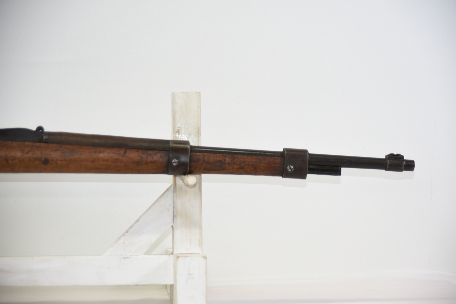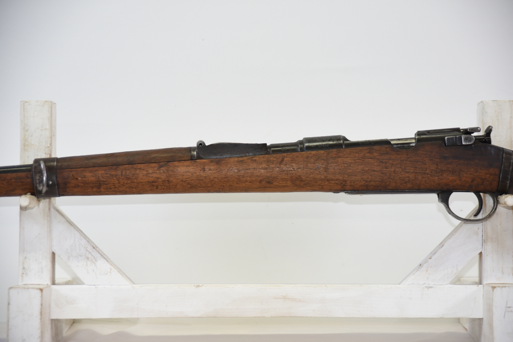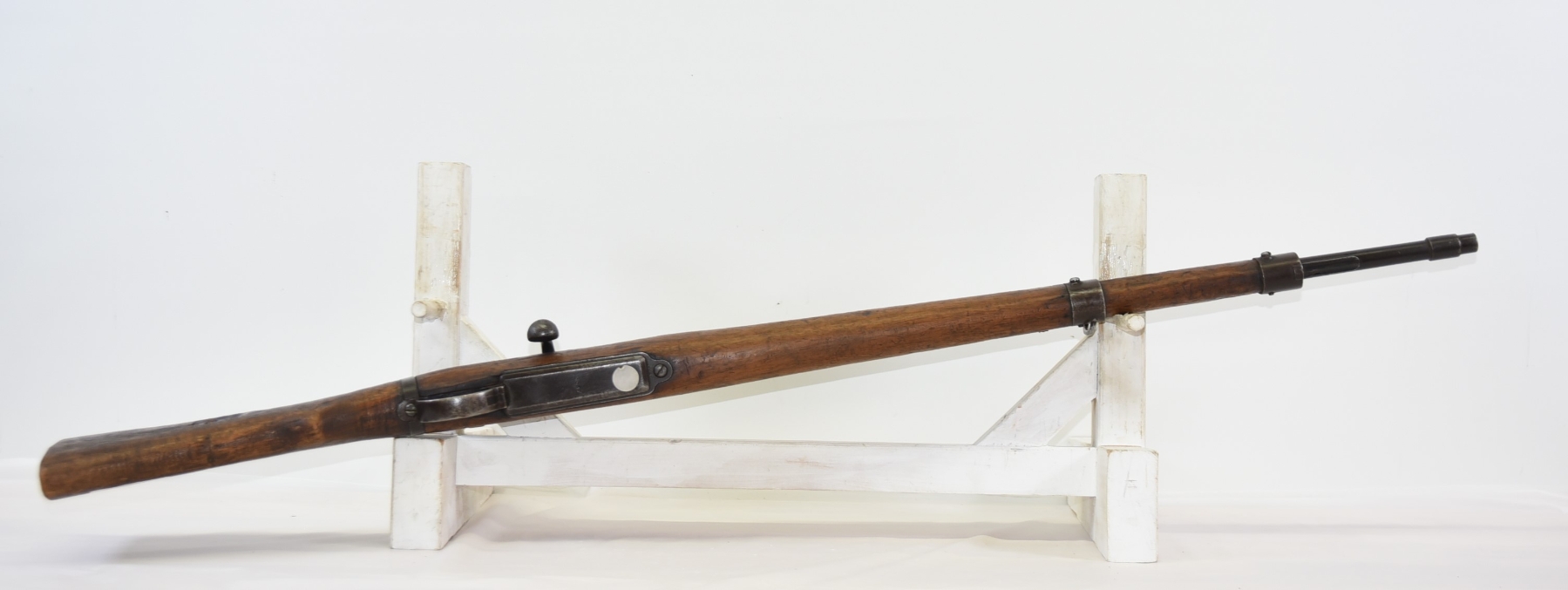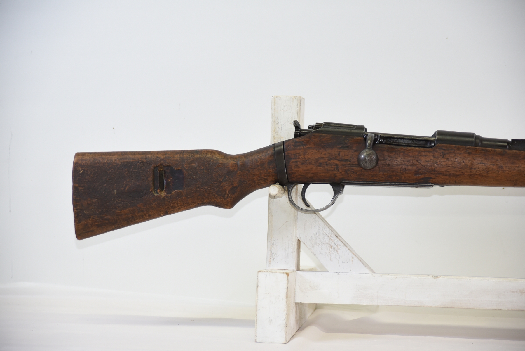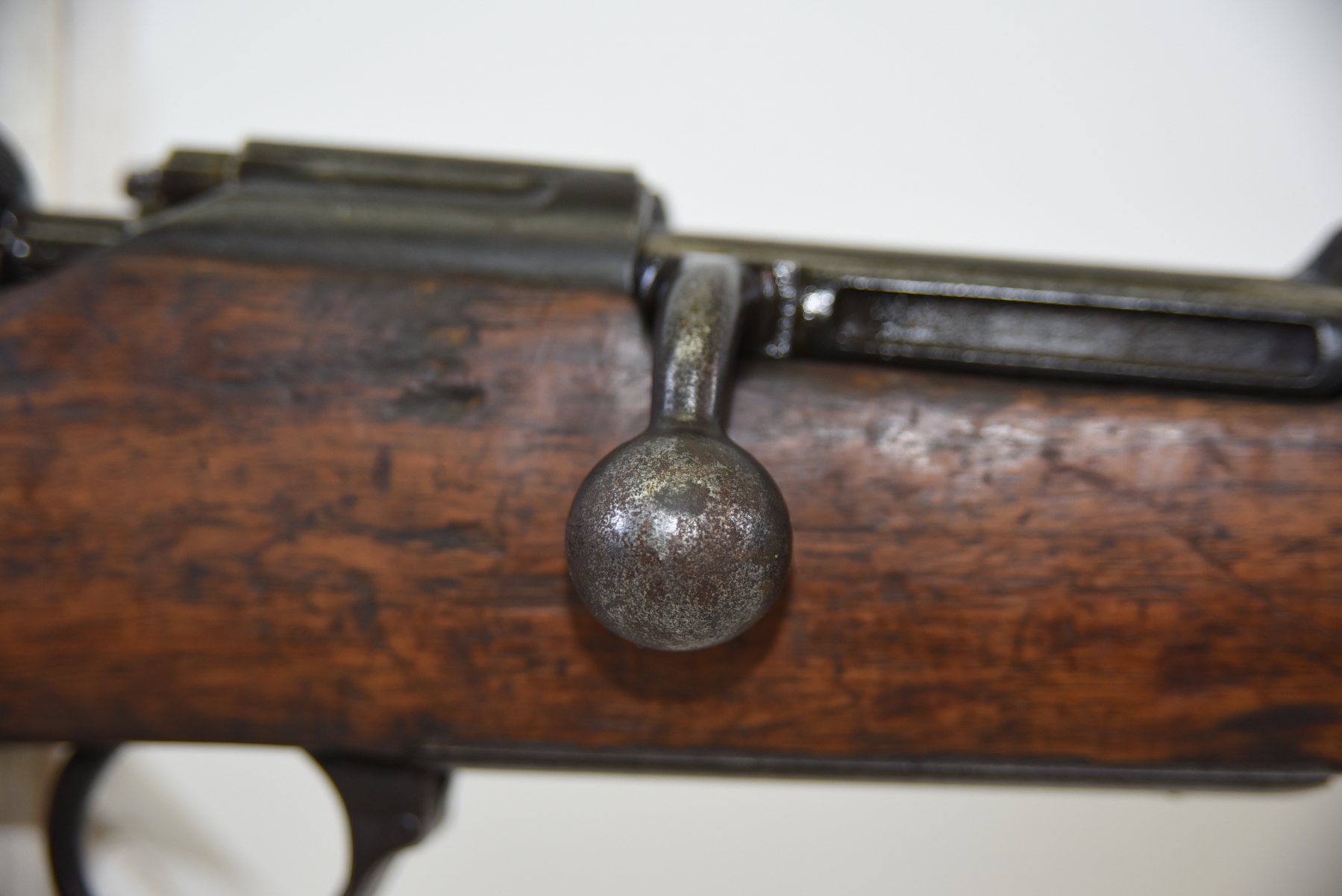 Wood stock has scratches, scuffs, dents, missing butt plate; condition is poor.