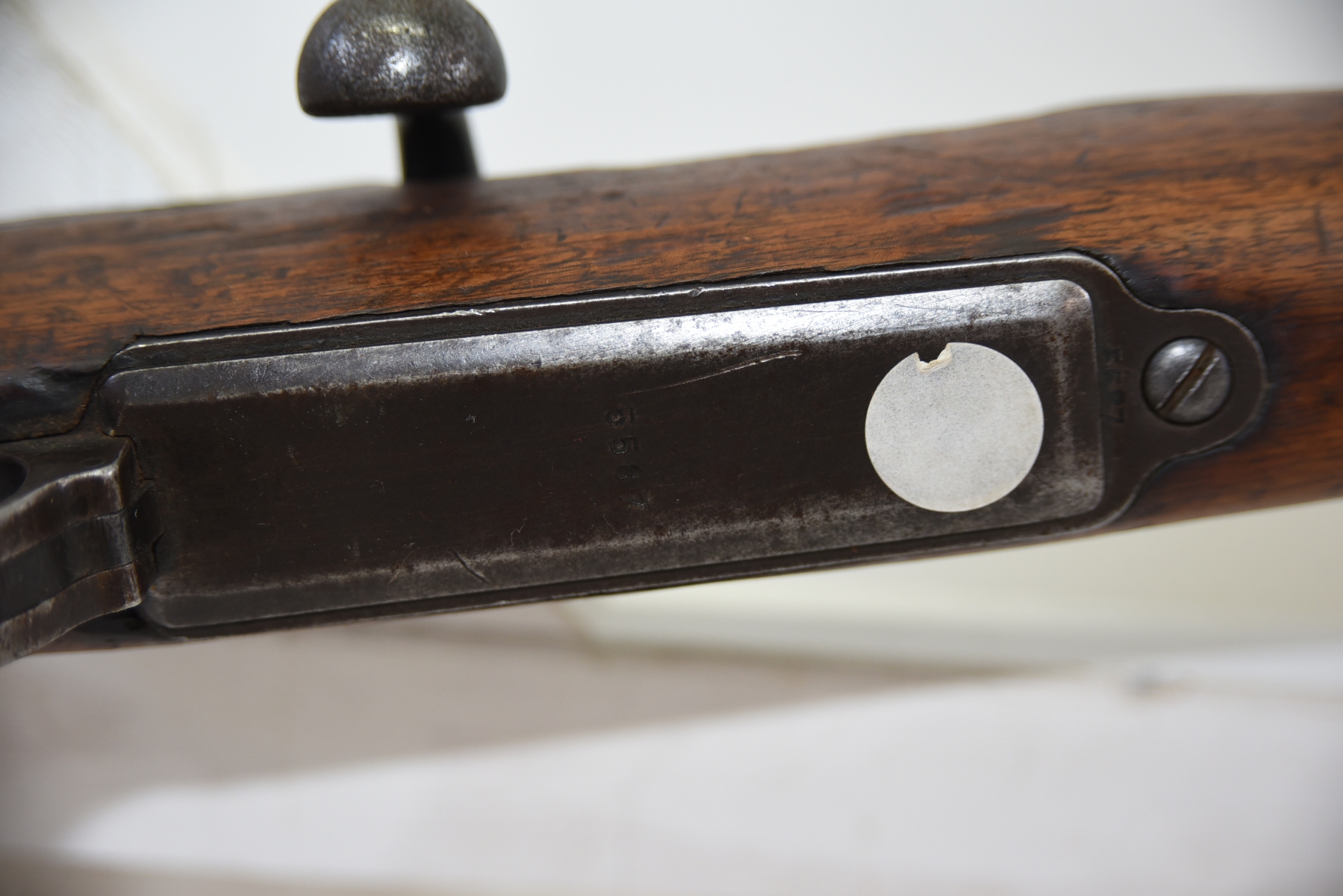 Metal finish shows patina, scratches, scuffs, dents, missing front and rear sight; condition is less than fair.