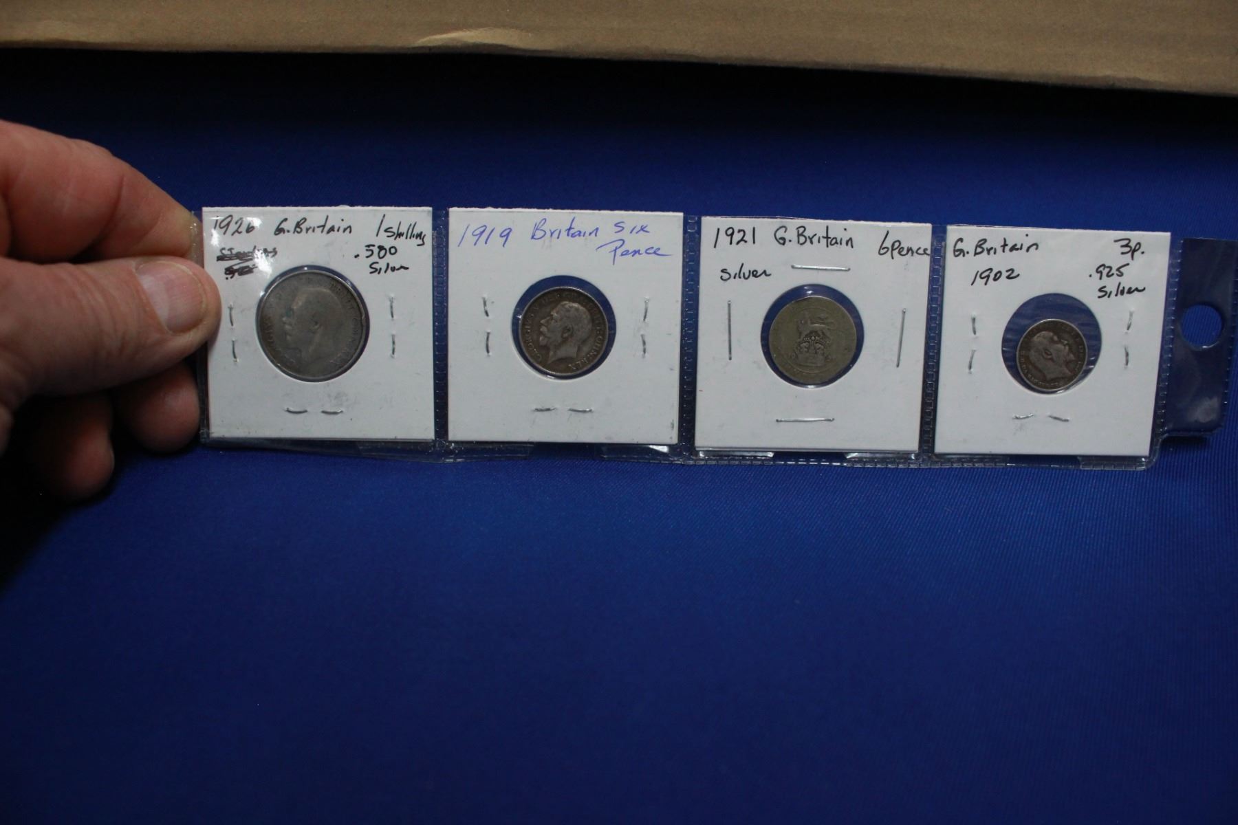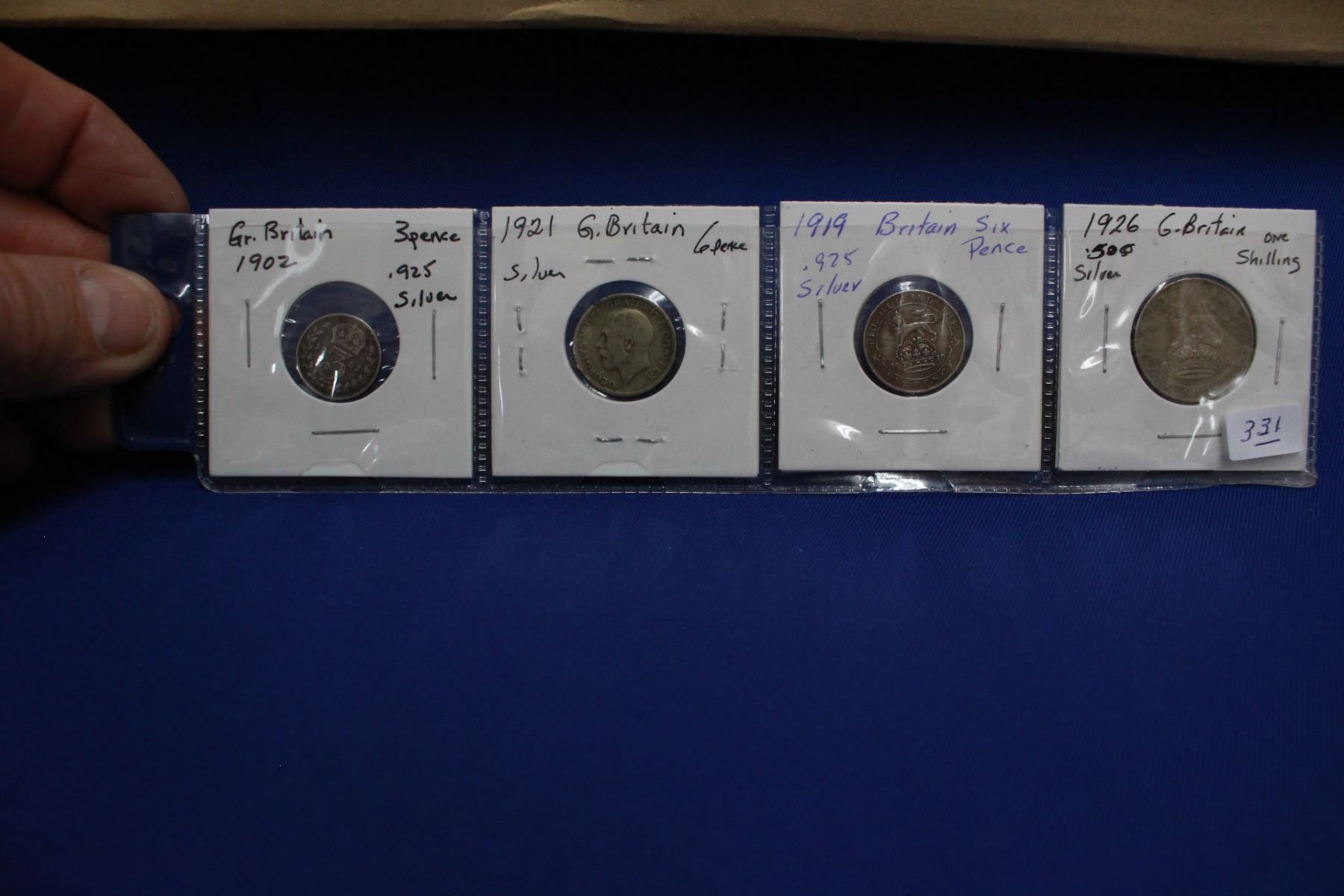 Great Britain Silver Coins: 1926 Shilling; 1919 Six Pence; 1921 Six Pence & 1902 Three Pence