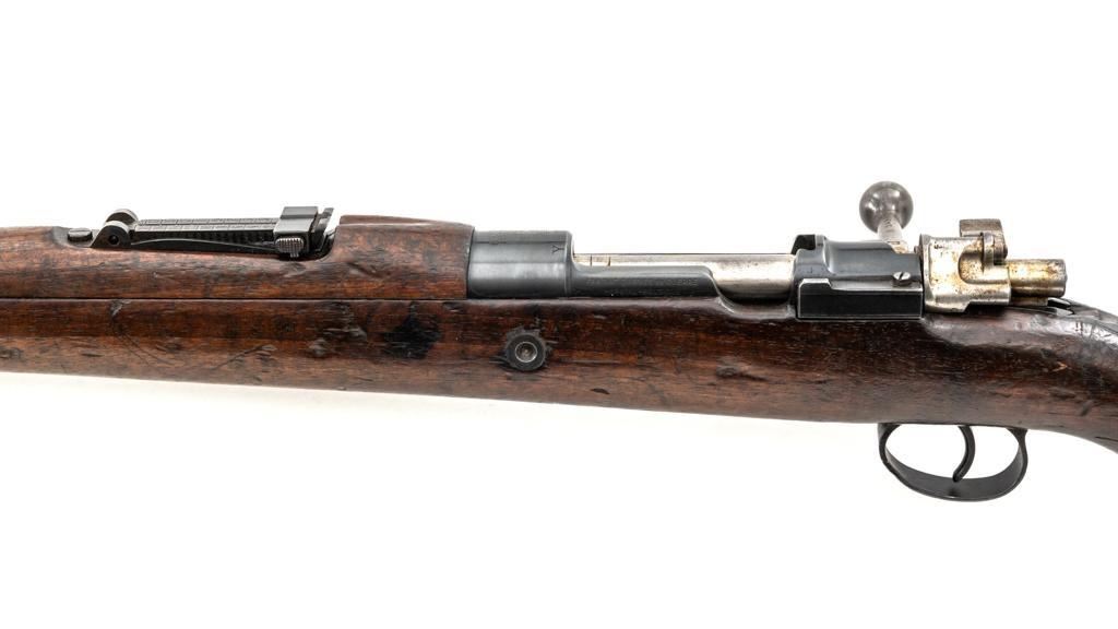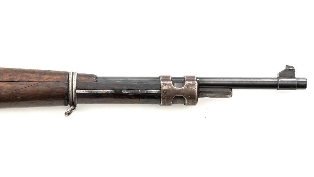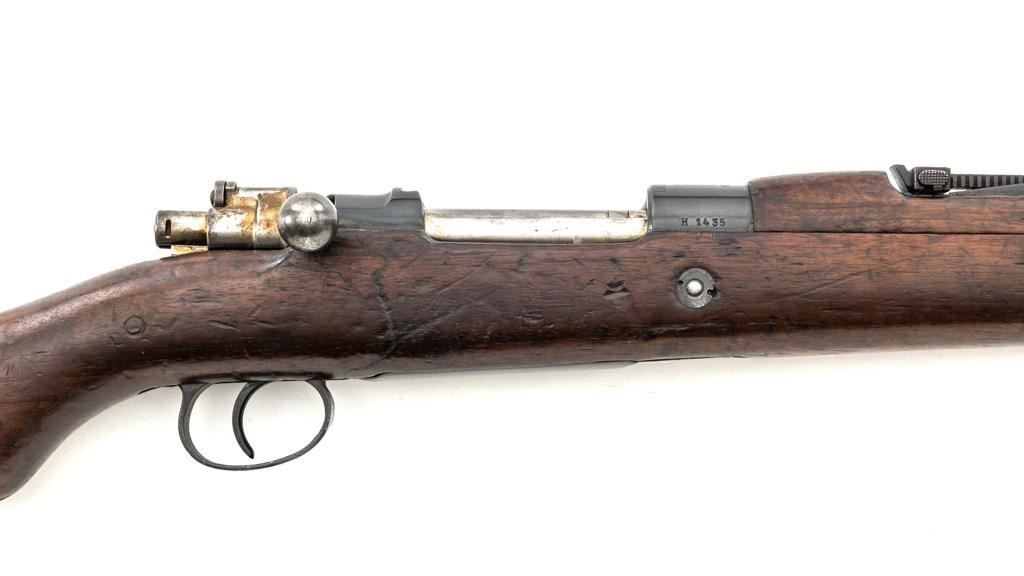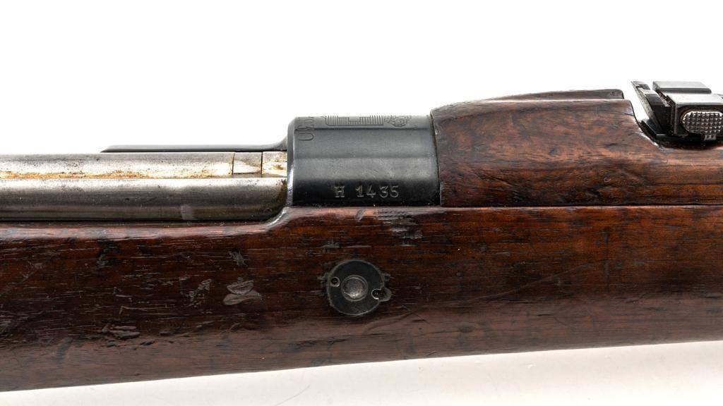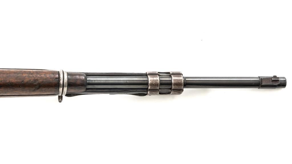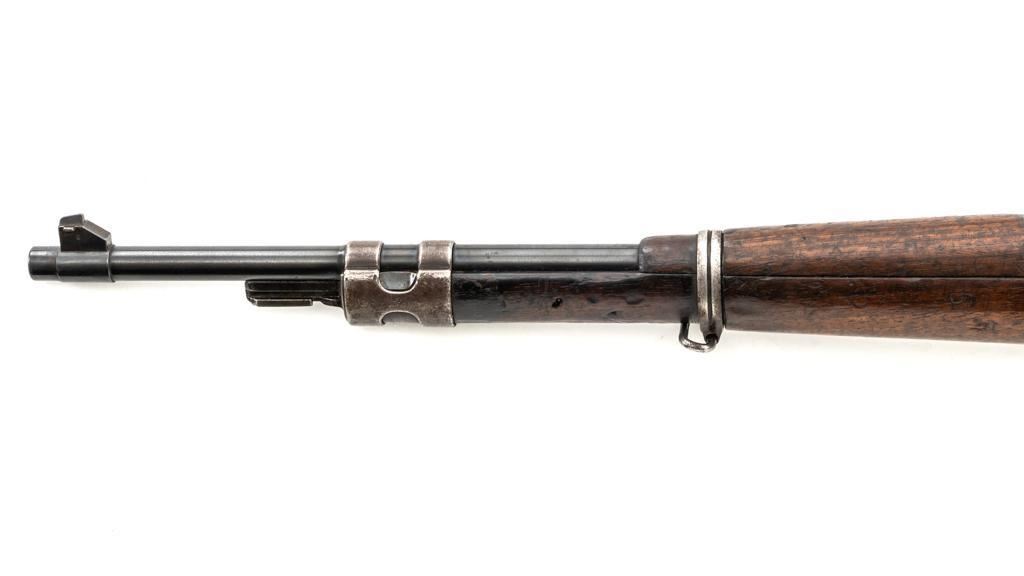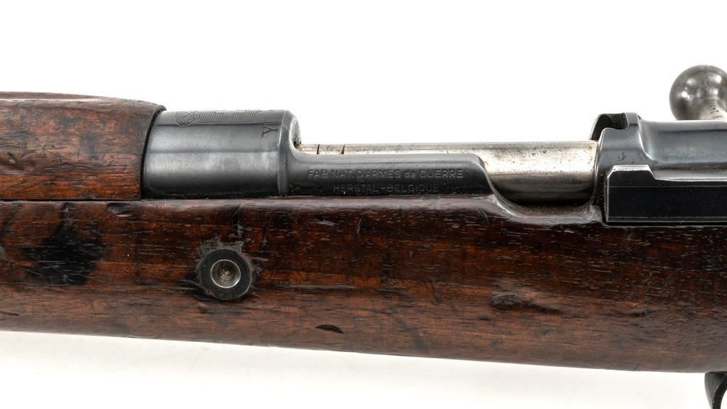 Greek FN Model 1930 Mauser Bolt Action Short Rifle, #1435, 8x57mm cal., 23.25"barrel, blued finish, hardwood stock and handguard, dovetailed inverted-"V" front sight, and adjustable tangent rear sight with "V"-notched groove, graduated to 2000 meters. Steel cleaning rod is missing. Top of the receiver ring is marked with "(Greek crest)/YII 1930". Left side of the receiver rail is marked "FAB.NAT.DARMES de GUERRE/HERSTAL-BELGIQUE". Right side of the buttstock is stamped "ZF". Matching numbered bolt. Stock does not match. No visible import marks. Metal is very good+ overall, retaining approx. 90% blue, with wear and patina to the barrel bands and buttplate. Wood is good with dents and scratches scattered throughout. Top of the handguard is cracked forward of the rear sight screw. Action operates smoothly. Bore is bright with very good, clearly defined rifling. Est.: $350-$550. (C&R)