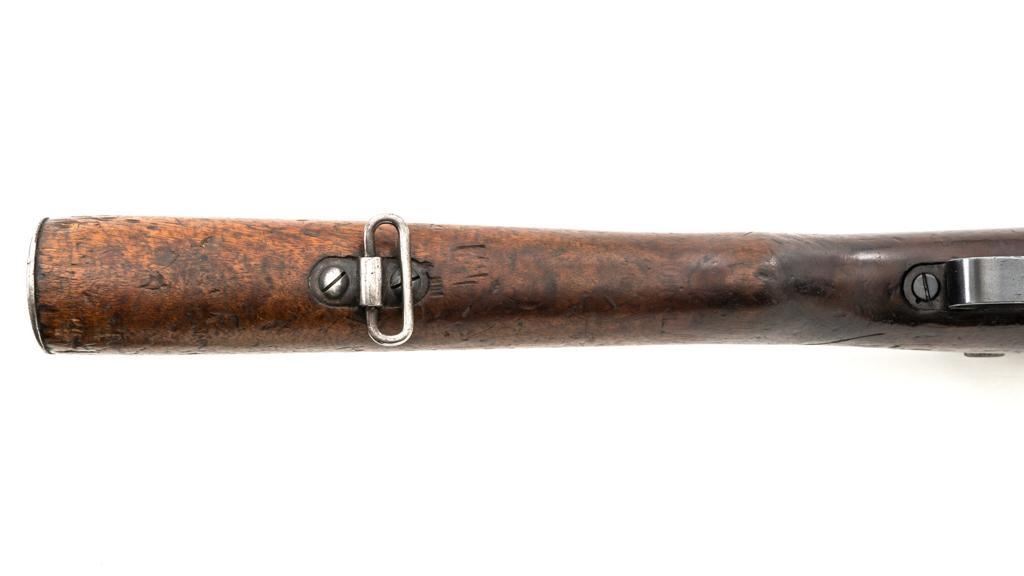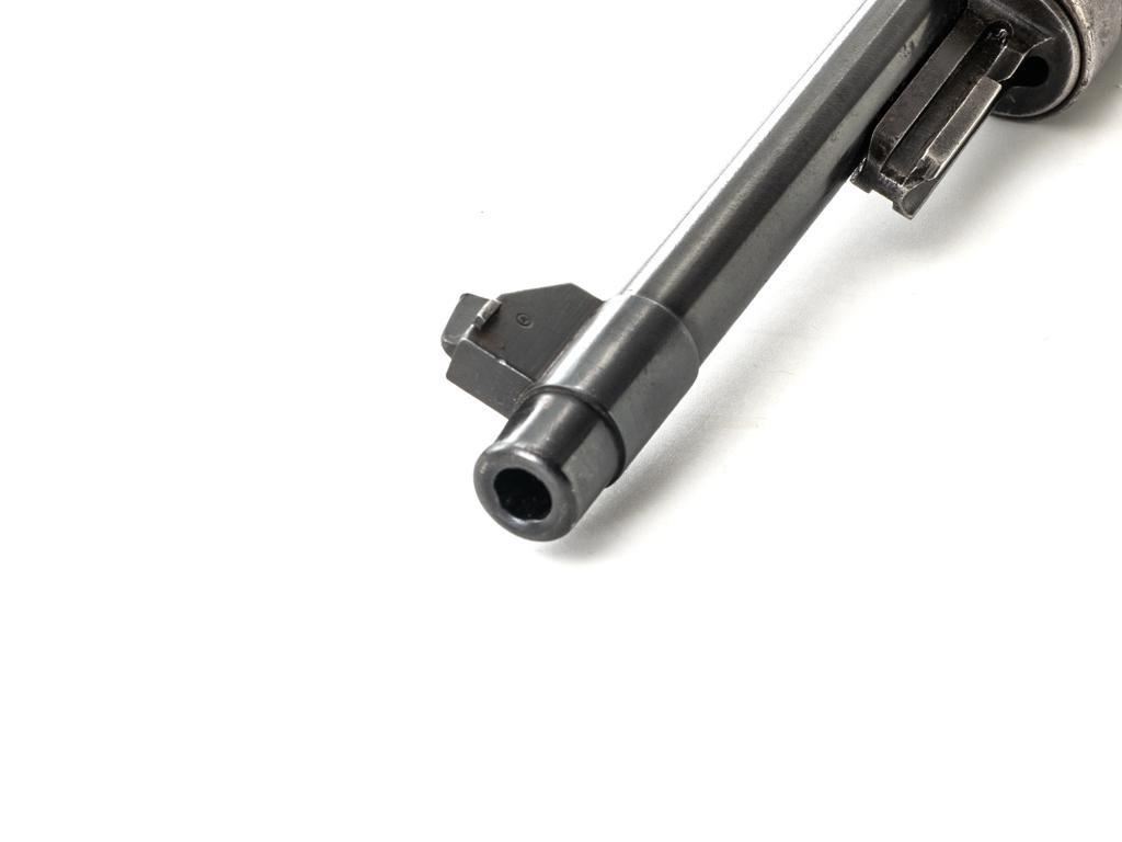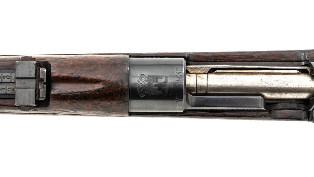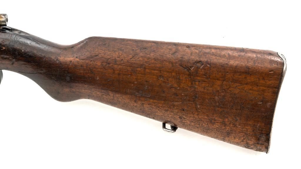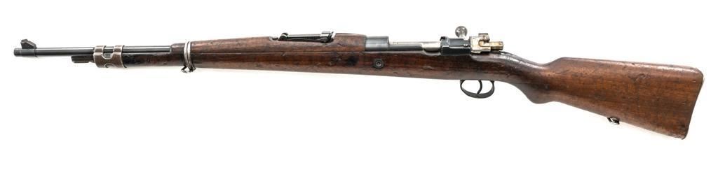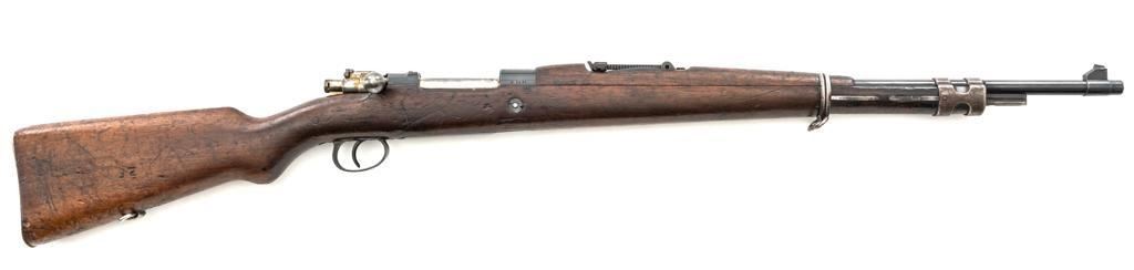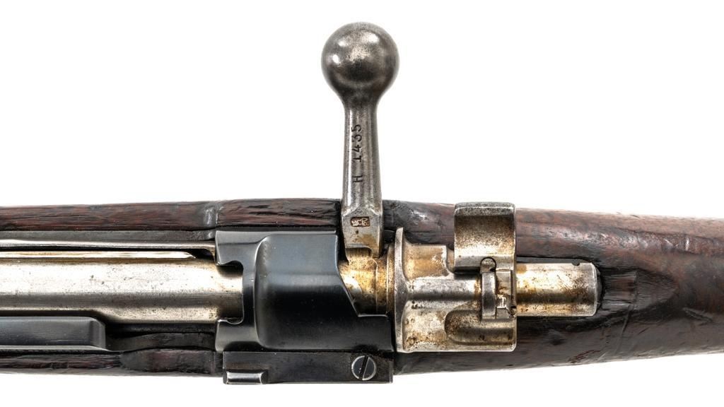 Greek FN Model 1930 Mauser Bolt Action Short Rifle, #1435, 8x57mm cal., 23.25"barrel, blued finish, hardwood stock and handguard, dovetailed inverted-"V" front sight, and adjustable tangent rear sight with "V"-notched groove, graduated to 2000 meters. Steel cleaning rod is missing. Top of the receiver ring is marked with "(Greek crest)/YII 1930". Left side of the receiver rail is marked "FAB.NAT.DARMES de GUERRE/HERSTAL-BELGIQUE". Right side of the buttstock is stamped "ZF". Matching numbered bolt. Stock does not match. No visible import marks. Metal is very good+ overall, retaining approx. 90% blue, with wear and patina to the barrel bands and buttplate. Wood is good with dents and scratches scattered throughout. Top of the handguard is cracked forward of the rear sight screw. Action operates smoothly. Bore is bright with very good, clearly defined rifling. Est.: $350-$550. (C&R)