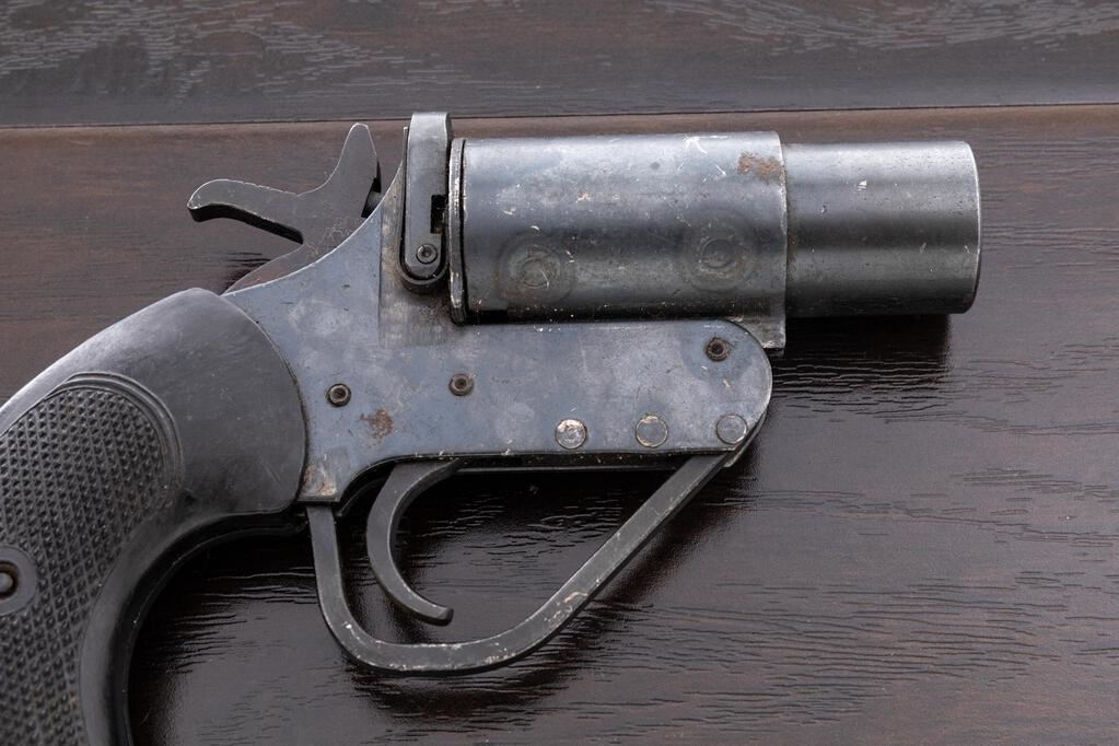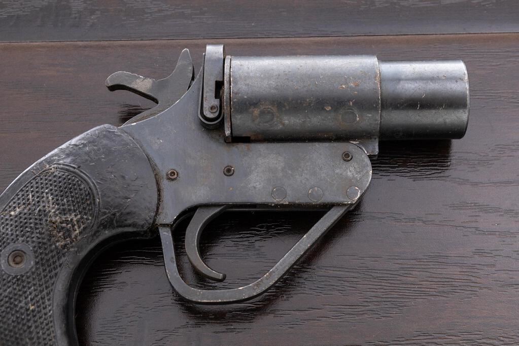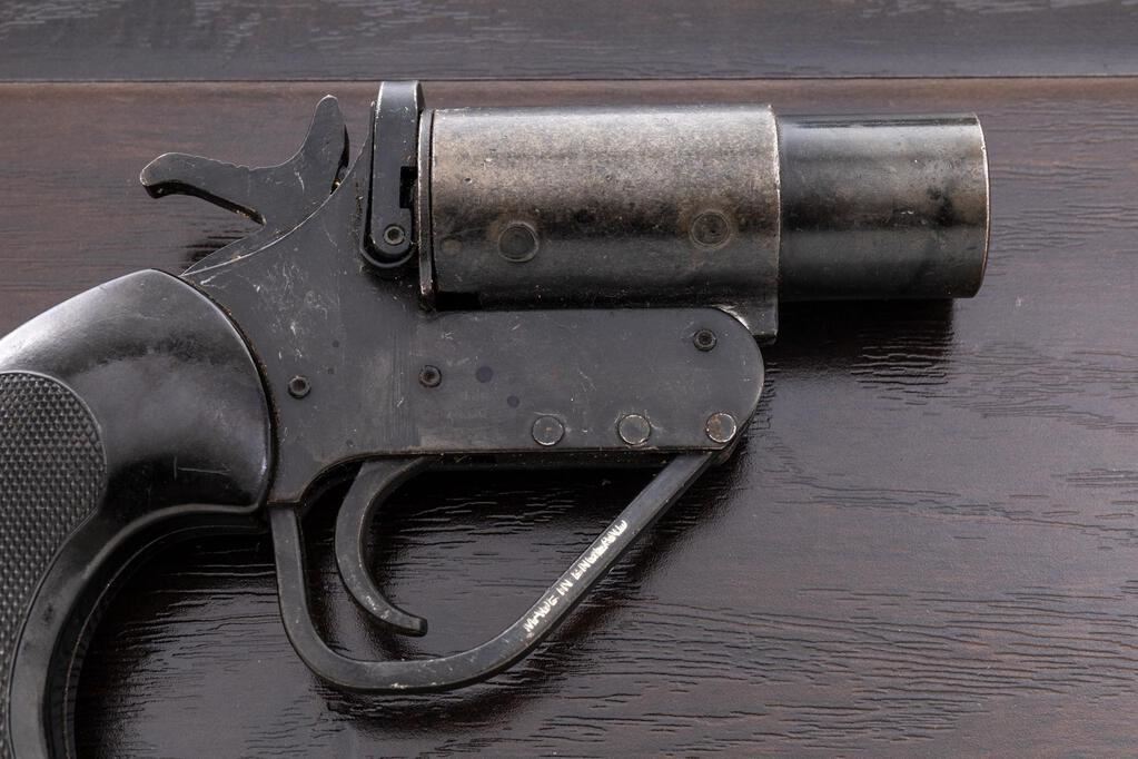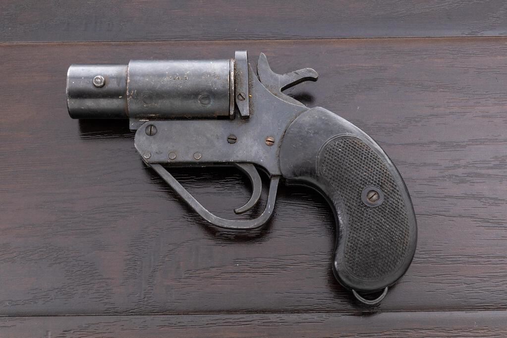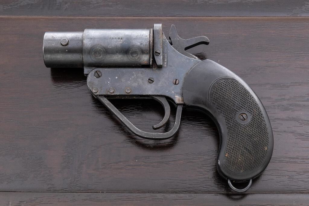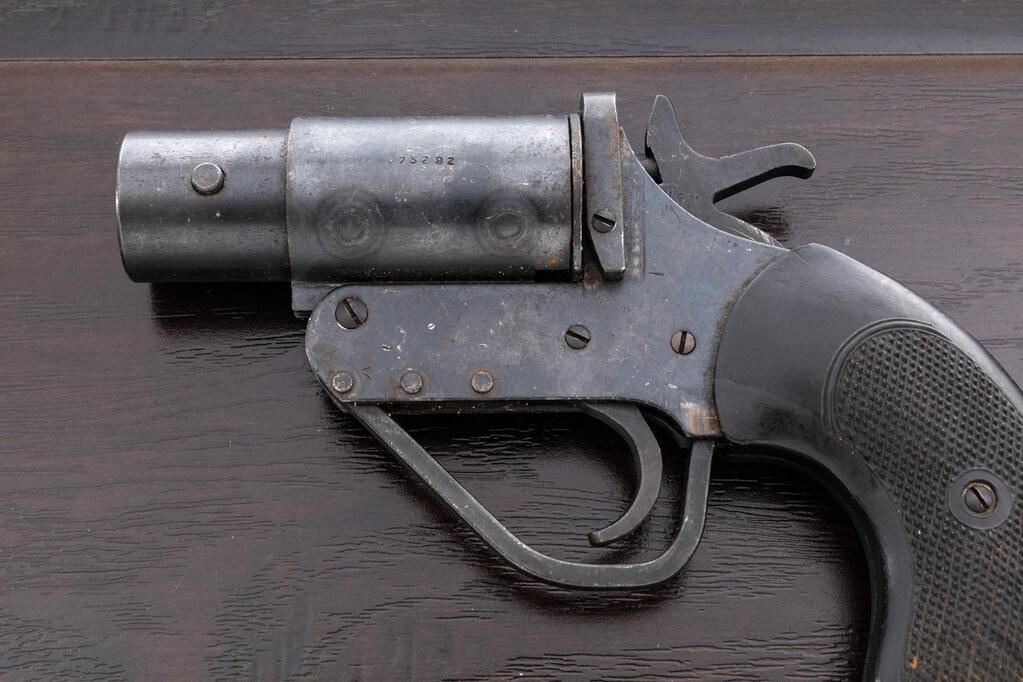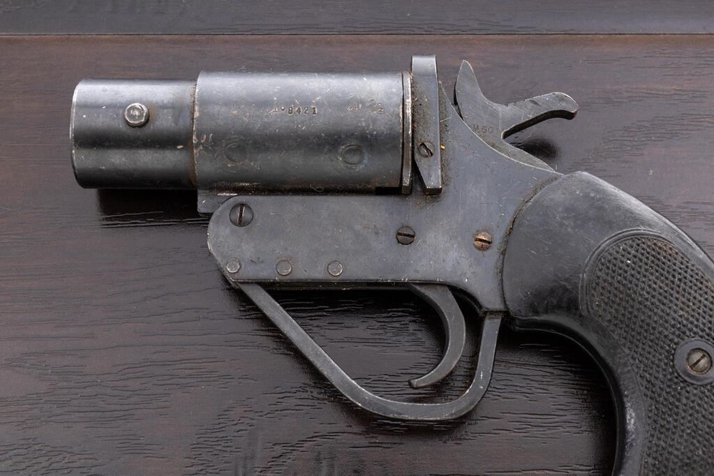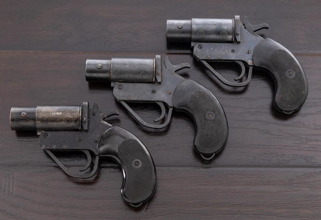 Group of Three (3) WWII British No. 2 Mk 5 Flare Pistols, 26.5mm bores, takes 1" flare cartridges, 3.6" barrels, all three have the round lug on the barrel associated with RAF issued pieces, external hammers marked M601 (war-time mfgr's code), top "U"-shaped opening lever, retracting lanyard loops, and black composite checkered grips. 1.) Number 108421, small proof on top of barrel, broad arrow on frame, NP proof on side of barrel, trigger guard stamped "Made in England", bore is clean, numerous scratches and small dings, some old dried grease in recesses. 2.) Number 075292, small proof on top of barrel, broad arrow on frame, bore is mint, numerous small scratches and minor dings, couple of tiny rust spots. 3.) Number 143606, small proof on top of barrel, broad arrow on frame, partial black painted finish over bluing, trigger guard stamped "Made in England", bore is lightly rusted overall but should clean well, with numerous small scratches and light wear. Est.: $400-$600/Lot. (Non-gun)