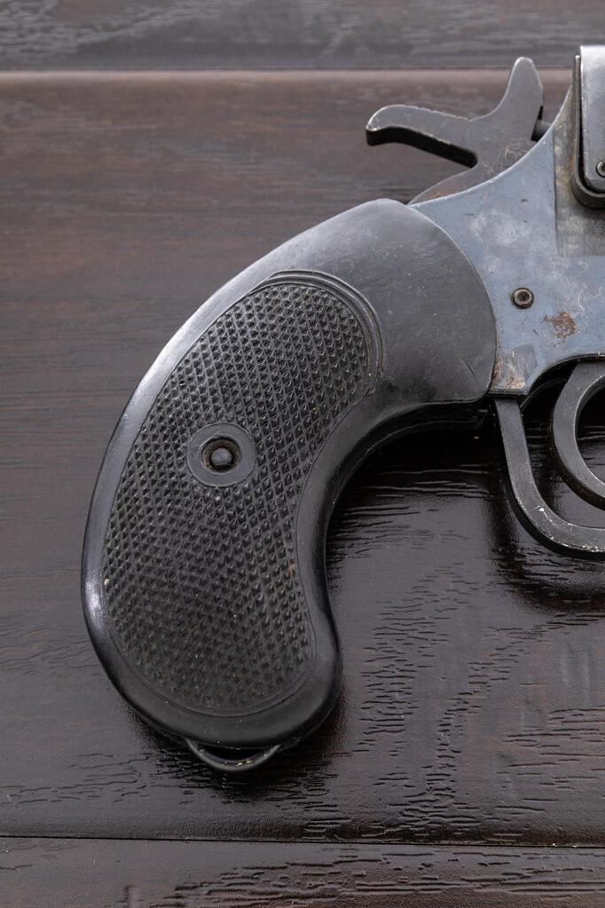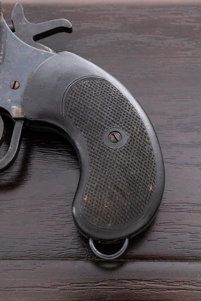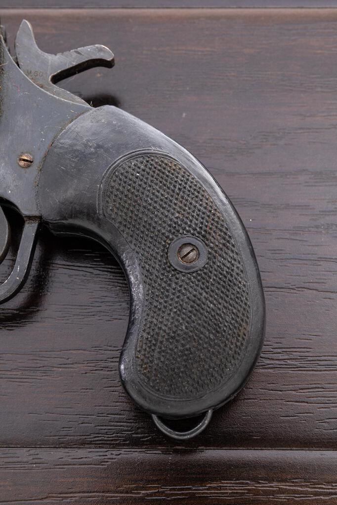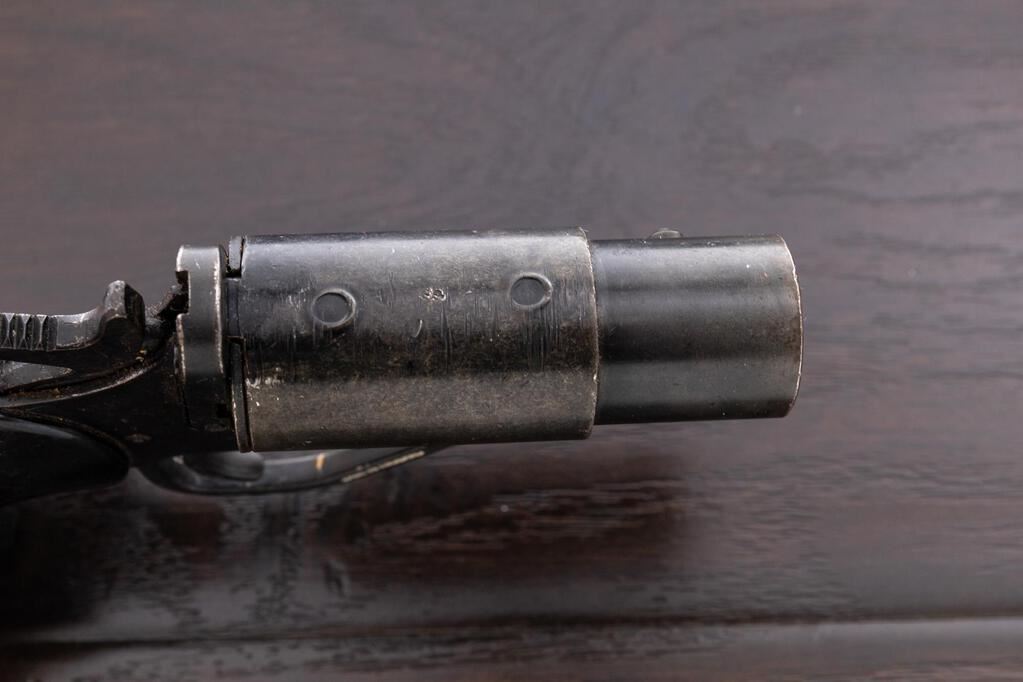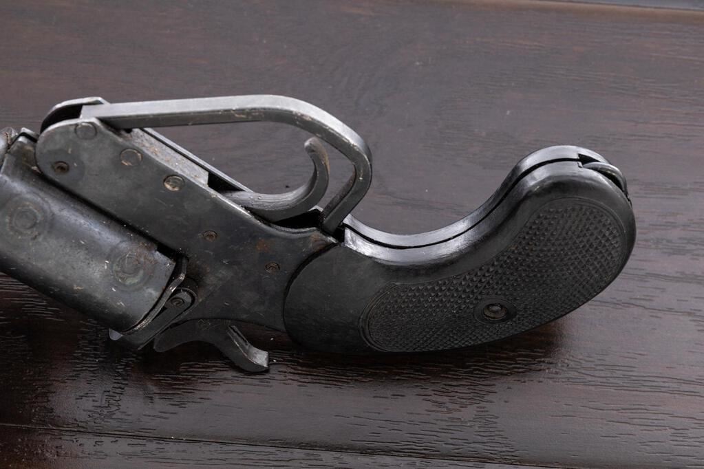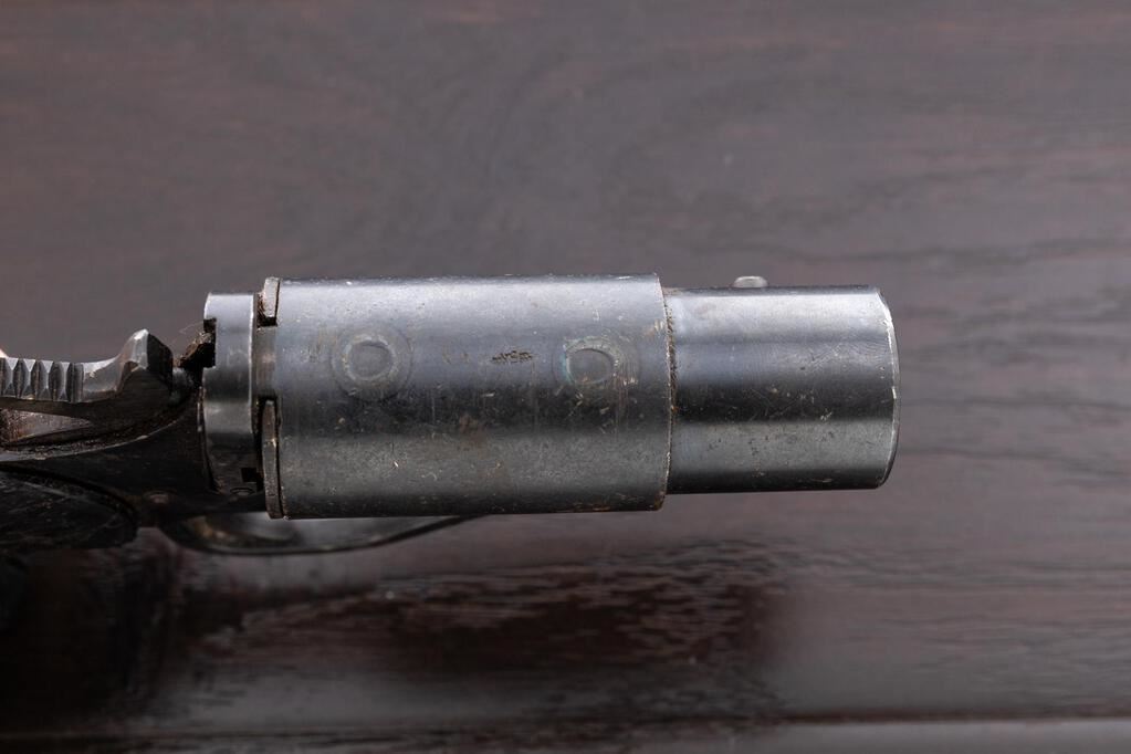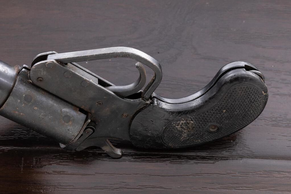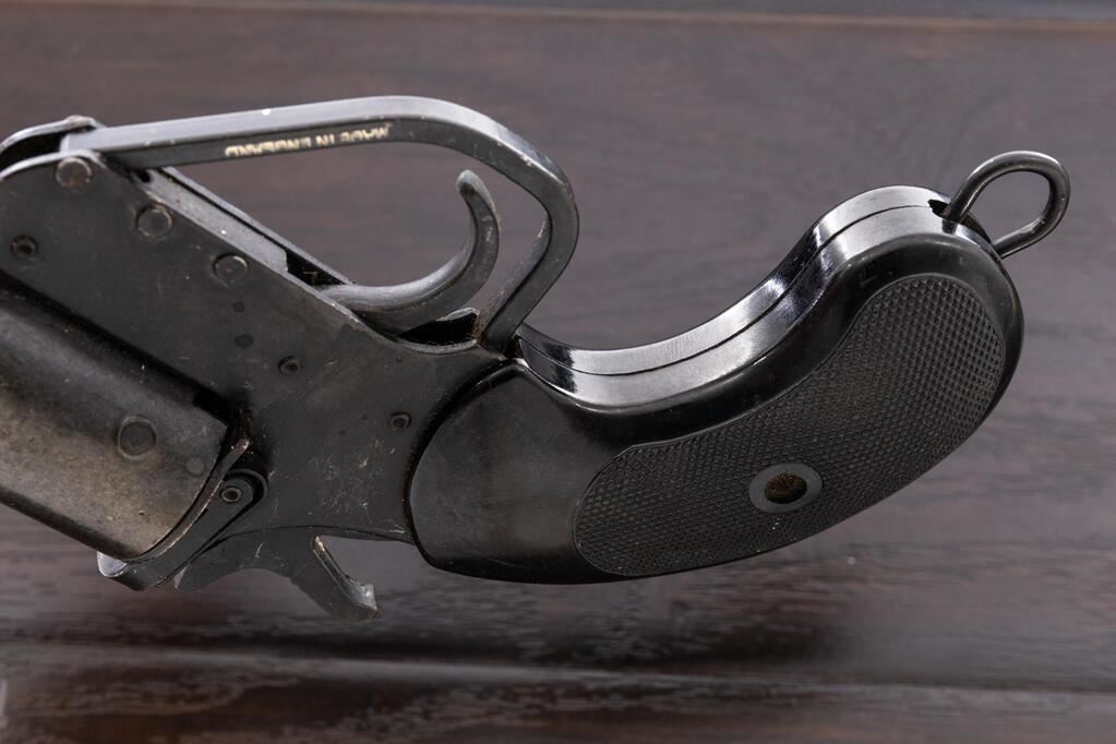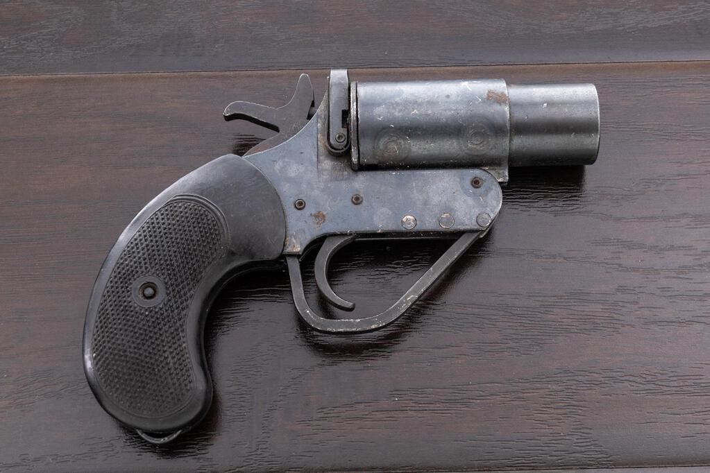 Group of Three (3) WWII British No. 2 Mk 5 Flare Pistols, 26.5mm bores, takes 1" flare cartridges, 3.6" barrels, all three have the round lug on the barrel associated with RAF issued pieces, external hammers marked M601 (war-time mfgr's code), top "U"-shaped opening lever, retracting lanyard loops, and black composite checkered grips. 1.) Number 108421, small proof on top of barrel, broad arrow on frame, NP proof on side of barrel, trigger guard stamped "Made in England", bore is clean, numerous scratches and small dings, some old dried grease in recesses. 2.) Number 075292, small proof on top of barrel, broad arrow on frame, bore is mint, numerous small scratches and minor dings, couple of tiny rust spots. 3.) Number 143606, small proof on top of barrel, broad arrow on frame, partial black painted finish over bluing, trigger guard stamped "Made in England", bore is lightly rusted overall but should clean well, with numerous small scratches and light wear. Est.: $400-$600/Lot. (Non-gun)