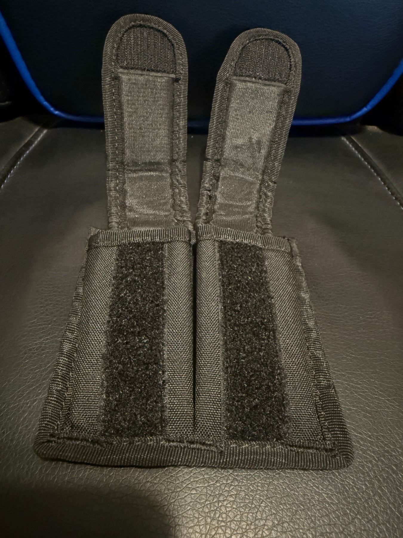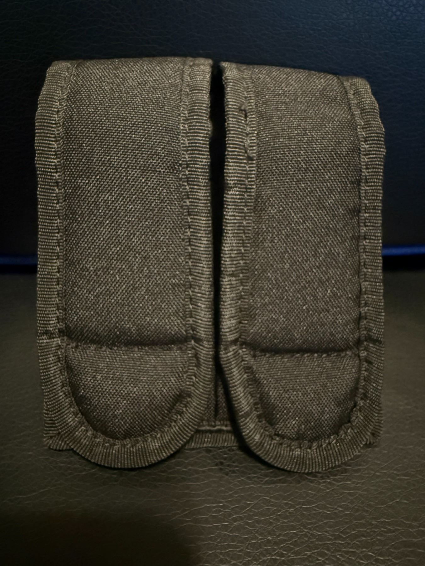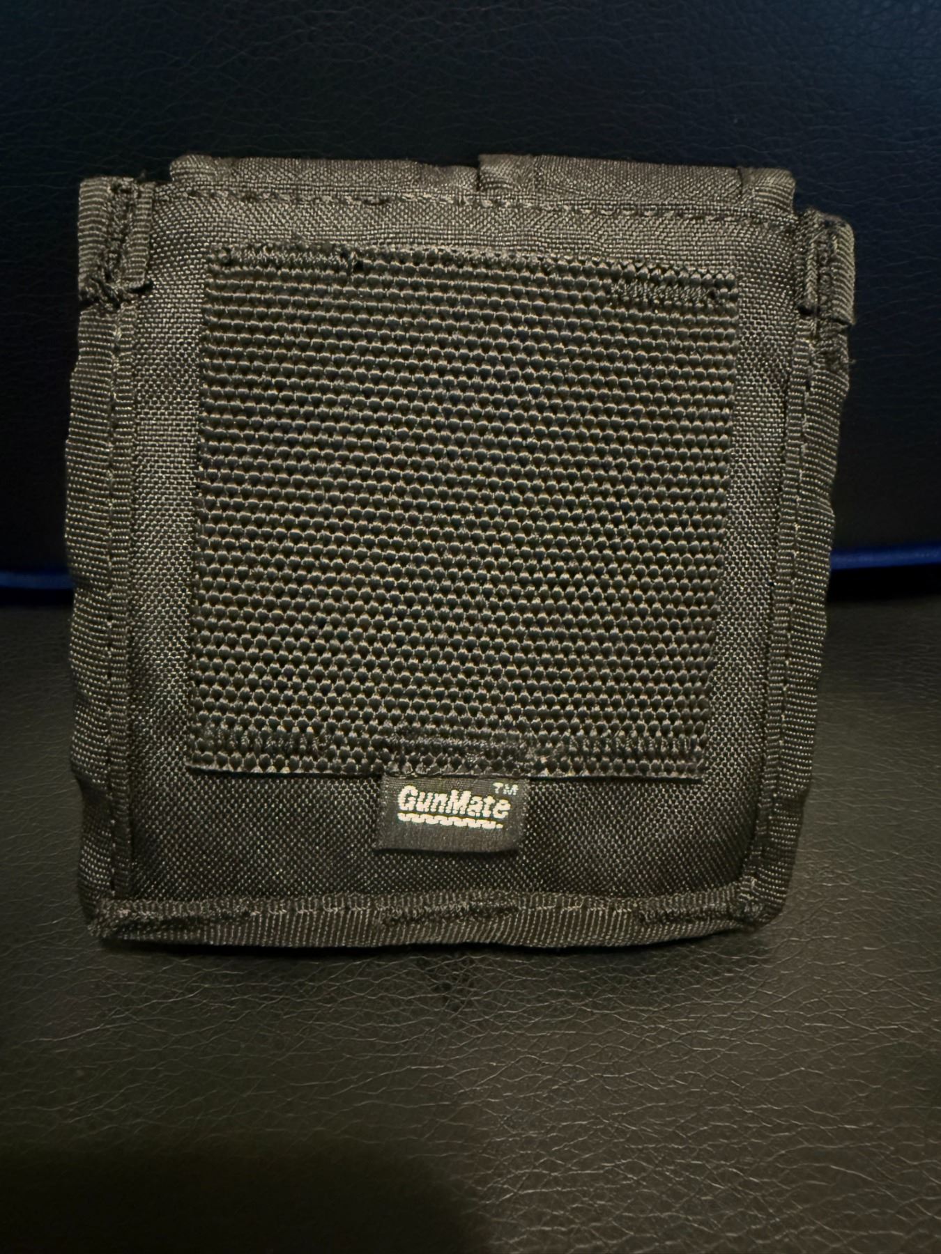 Black GunMate brand belt holder for 2 magazines. Made from durable nylon with reinforced stitching and features two separate compartments, each with individual Velcro-closure flaps. Reinforced stitching for long-term durability. Soft-lined interior to protect magazines. Rear Velcro panel for attaching to compatible gear, bags, or surfaces.