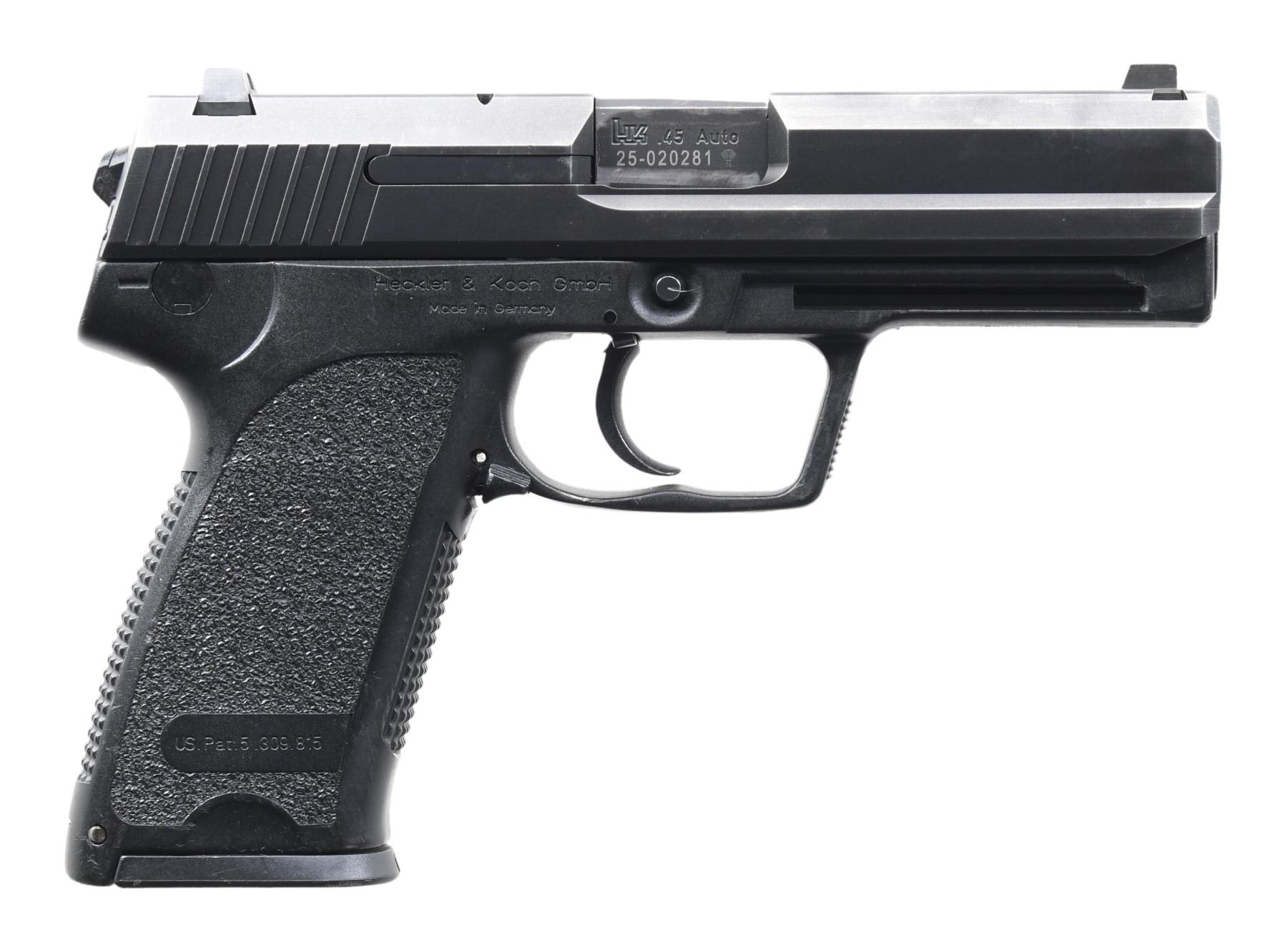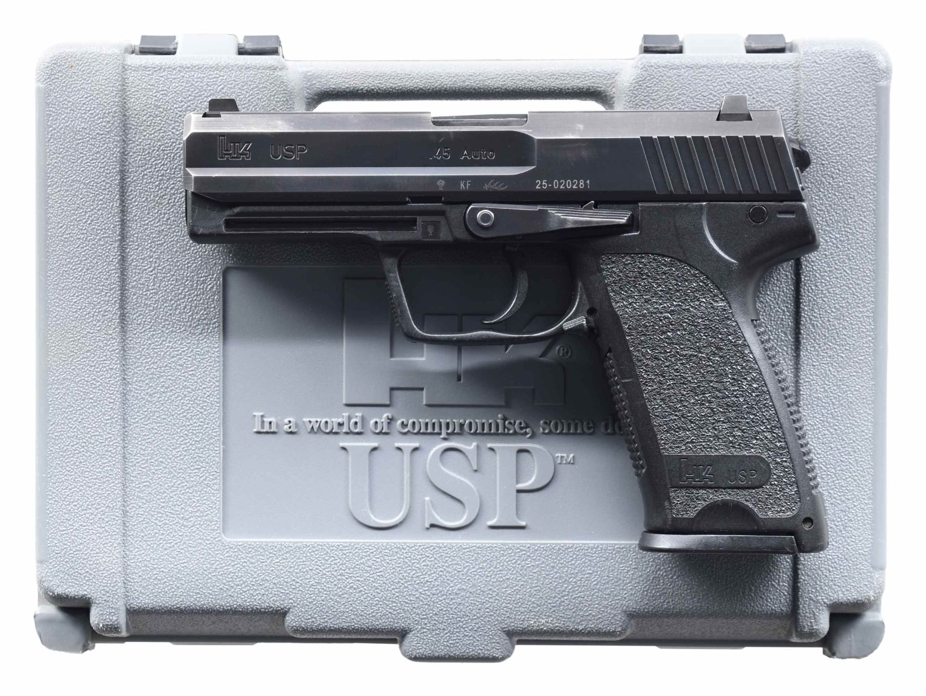 Cal. 45 ACP. S# 25-020281. Bbl. 4 1/3". Three dot sights. Left side of slide has "KF" date code denoting 1995 mfr. LEM trigger USP without manual safety or decocker. Matte black finish. Polymer frame with H&K accessory rail. MAGS: 4-12 rd. Mags marked in white marker on back of spine identifying what model they are. UNATTACHED ACCESSORIES: gray factory hardcase with manual. Exterior of case has added black marker matching numbered to pistol. CONDITION: frame shows scattered handling marks & a scratch on left side of frame likely from a decocker once was. Slide retains 85% original matte finish with scattered edge wear. Action functions properly when hand cycled. Bright near excellent bore. (25-3366/MJC). MODERN. $500-750.