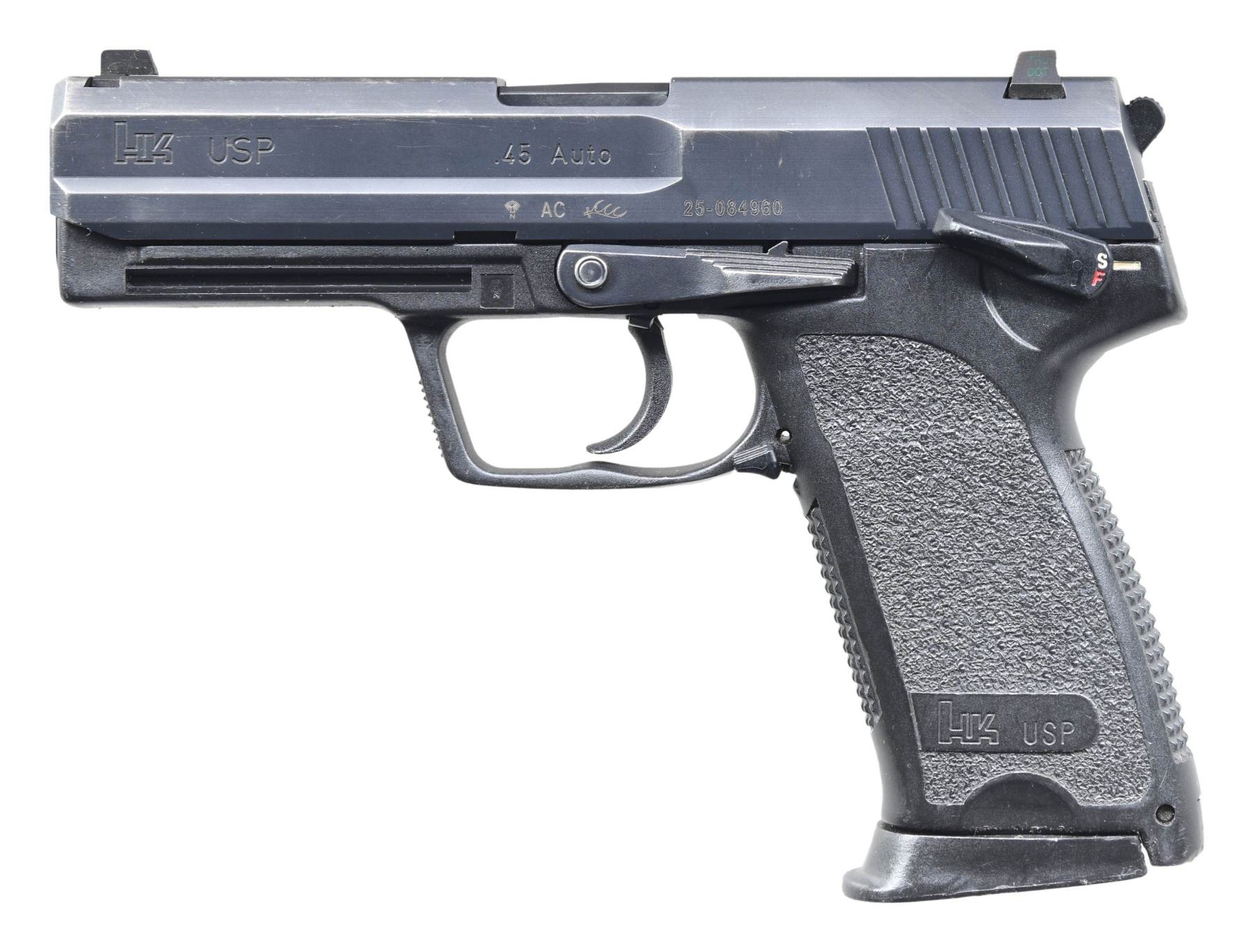 Cal. 45 ACP. S# 25-084960. Bbl. 4 3/4". Tru-Dot sights. Variant 1 USP pistol with left side safety that also acts as a decocker. Left side of slide has "AC" date code denoting mfr. in 2002. Matte black finish. Polymer frame with H&K accessory rail. MAGS: 3-12 rd. Back of spines have added white paint paint identifying what they are. CONDITION: frame shows scattered handling marks & some operational wear. Slide & bbl. retain 90% original matte black finish with extractor turning plum & scattered edge wear. Action functions properly when hand cycled. Bright near excellent bore. (25-3369/MJC). MODERN. $450-650.