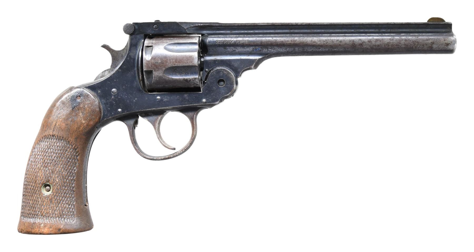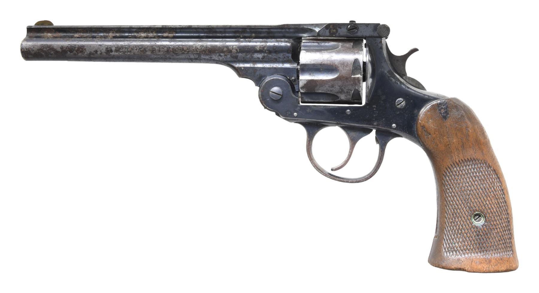 Cal. 22 RF. S# 520733. Bbl. 6". Round blade front sight. U-notch rear sight. 6-shot cyl. Blued finish. Checkered two-piece hardwood grips. CONDITION: grips show several dings on bottom, some chipping, further dings, some staining & handling wear. Metal retains 40% original blue with overall pitting, oxidation & edge wear. Action is sluggish but functional when hand cycled. Good bore with strong rifling. (25-2066/MJC). CURIO. $75-125.