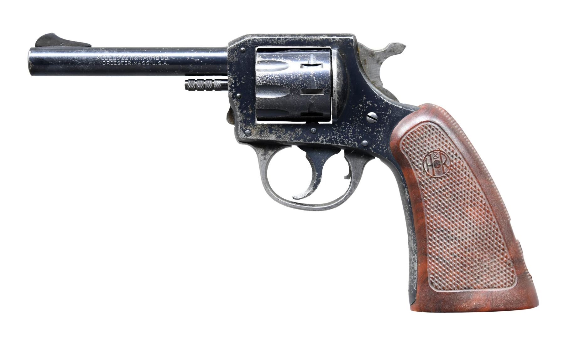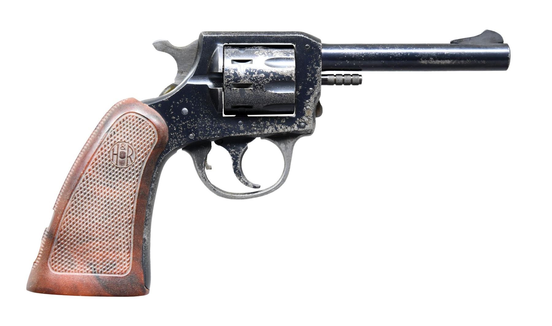 Cal. 22 LR. S# M27201. Bbl. 4". Ramped blade front sight. Fixed rear sight. 9-shot cyl. Blued finish. Checkered brown plastic grips with H&R logos. CONDITION: grips show scattered handling marks & scratches. Metal retains 40-50% blue with overall spotty oxidation, some light pitting & fading to gray. Action is a bit sluggish but functional when hand cycled. Bore shows some frosting but strong rifling. (25-2722/MJC). CURIO. $100-200.