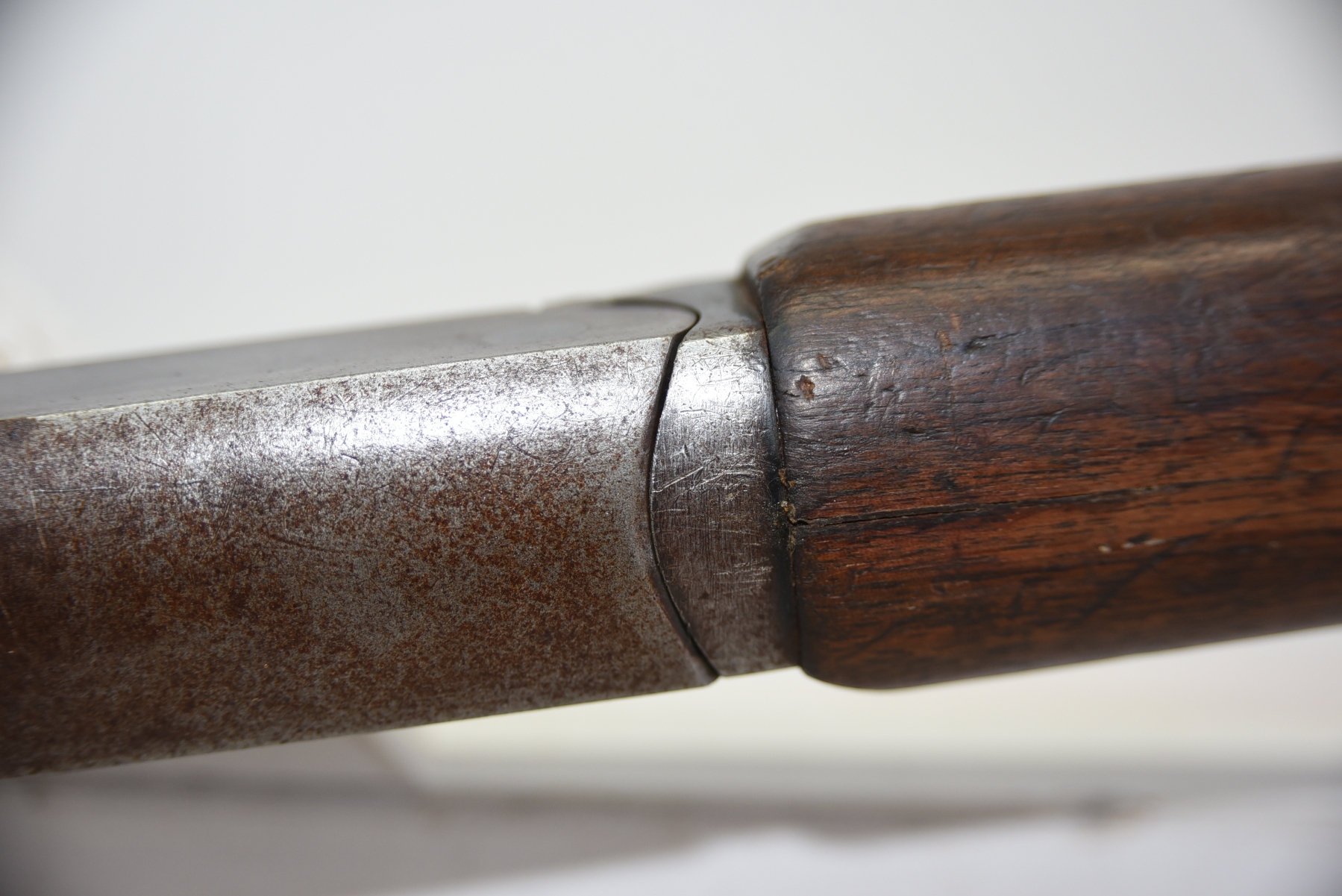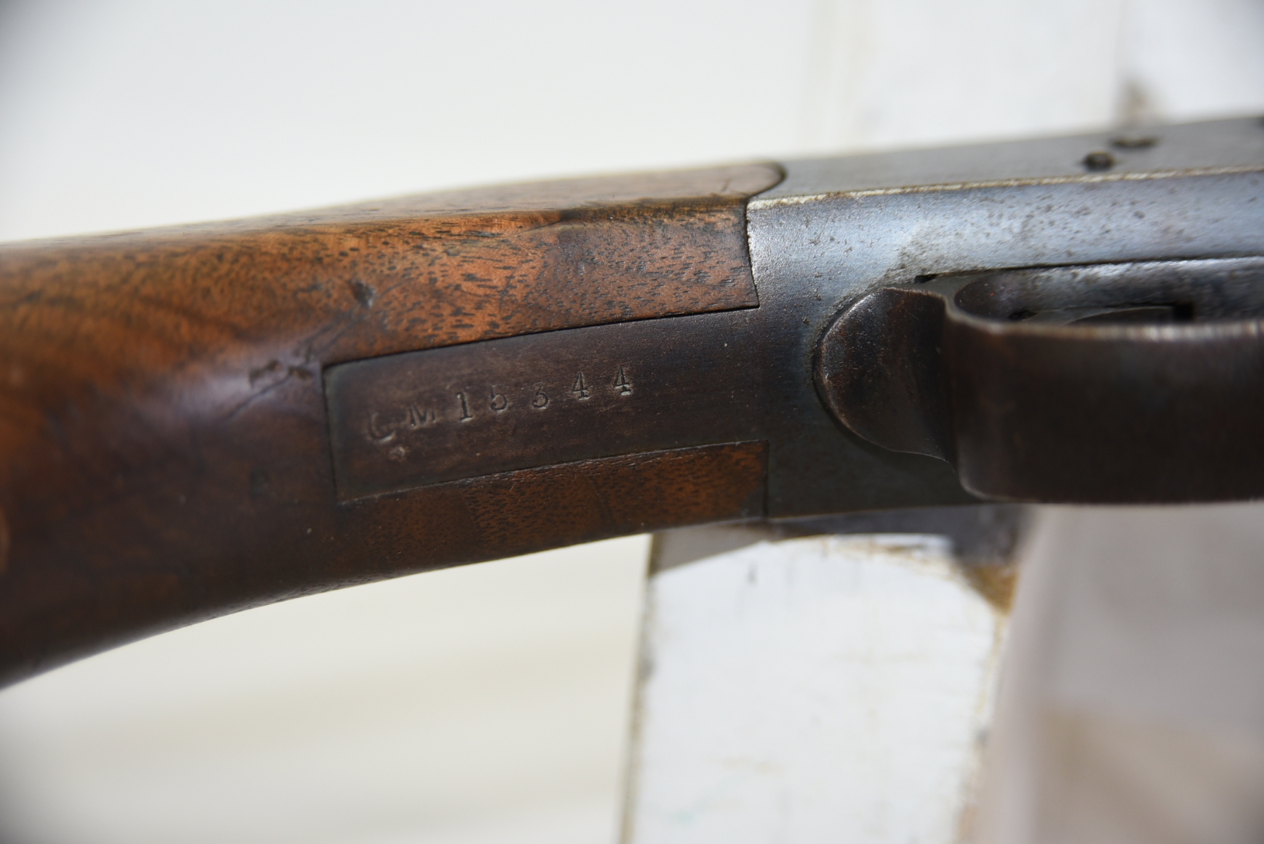Wood stock shows scratches, scuffs, few light dents, forearm and rear stock show some fine cracks; condition is fair.