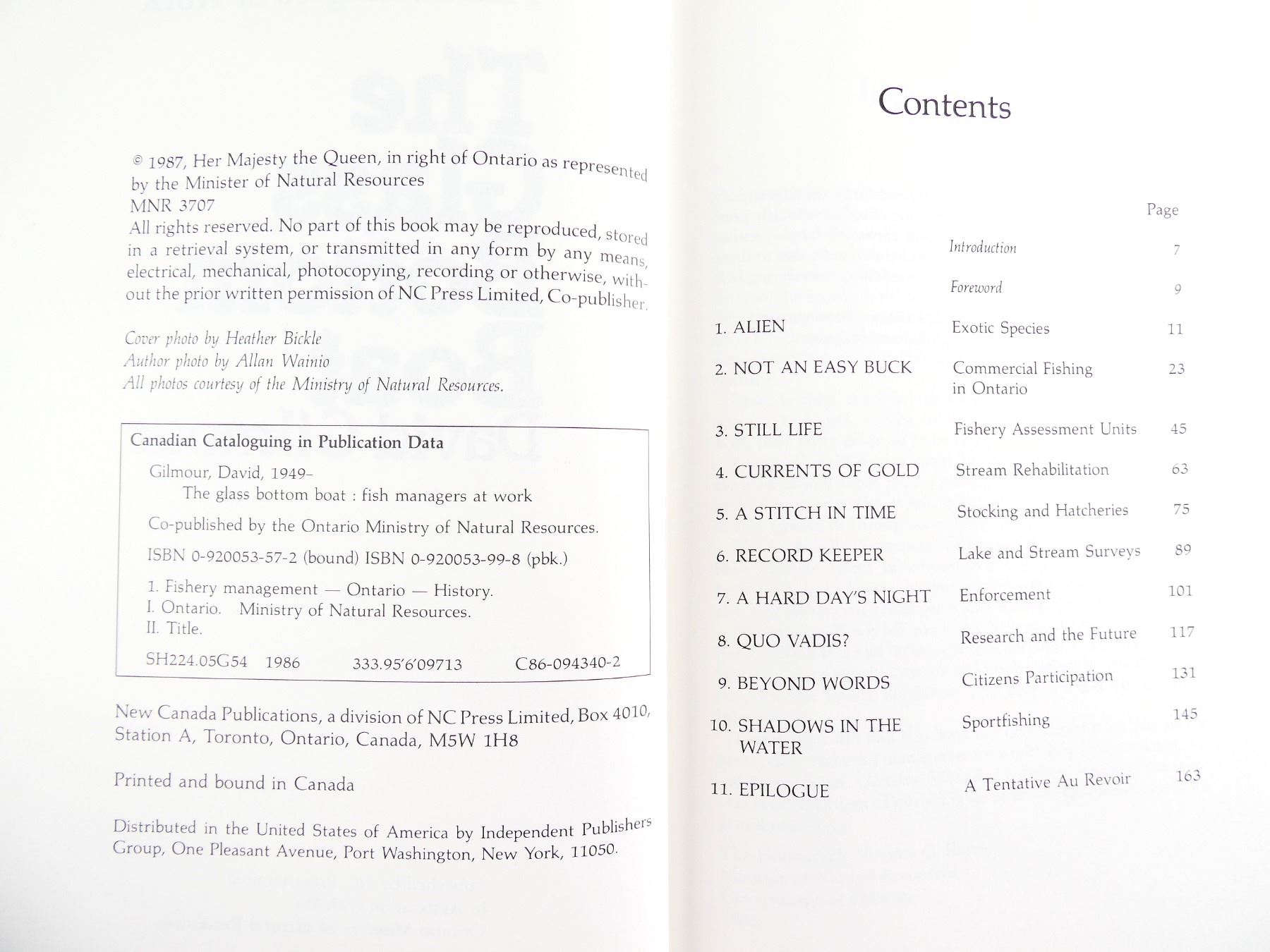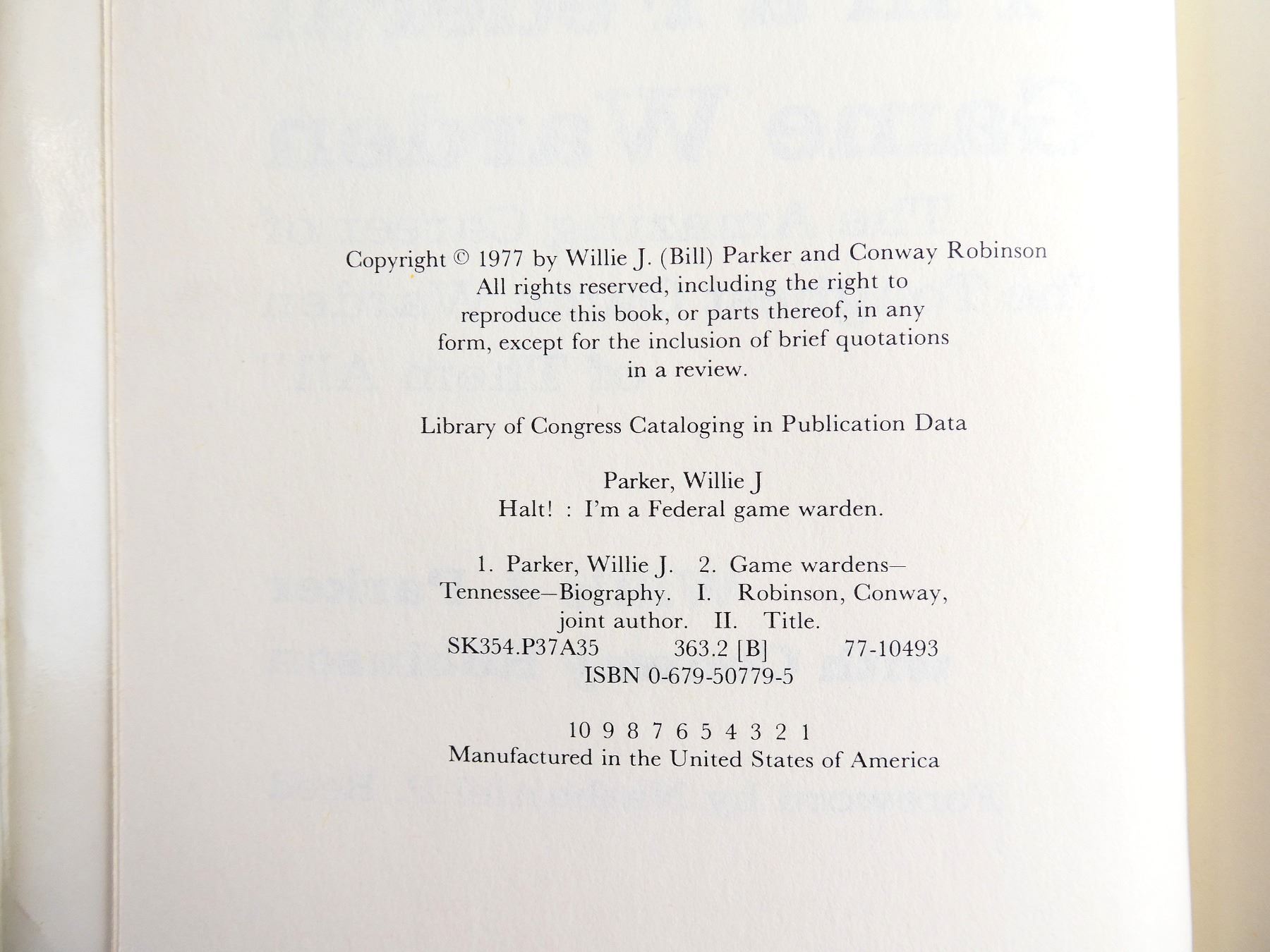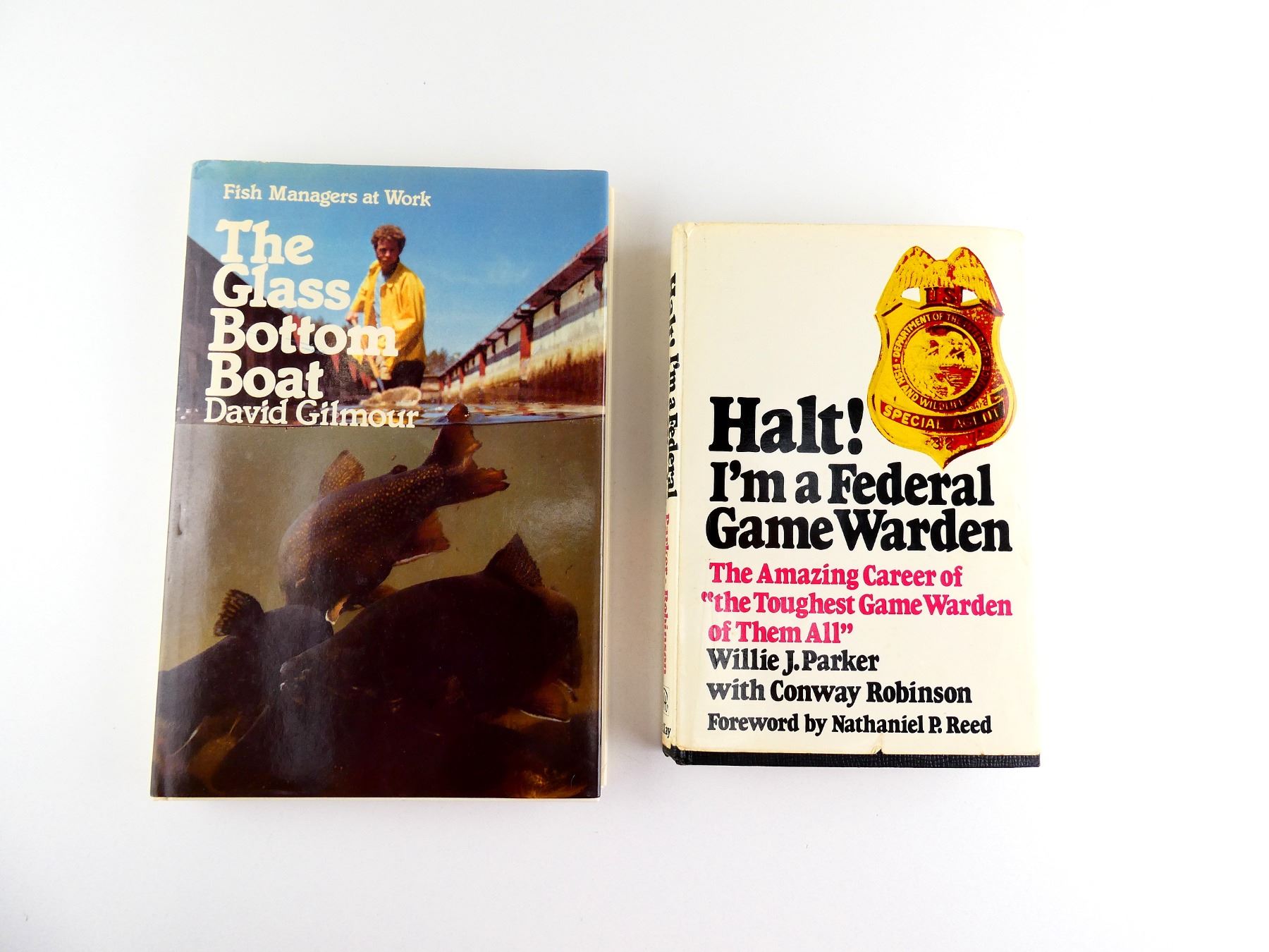 LOT INCLUDES; (1) "HALT! I'M A FEDERAL GAME WARDEN" BOOK BY WILLIE J. PARKER, HARD COVER WITH DUST COVER, ISBN: 0-679-50779-5 & (1) "THE GLASS BOTTOM BOAT" BOOK BY DAVID GILMOUR, HARD COVER WITH DUST COVER, ISBN: 0-920053-57-2. SEE PHOTOS.