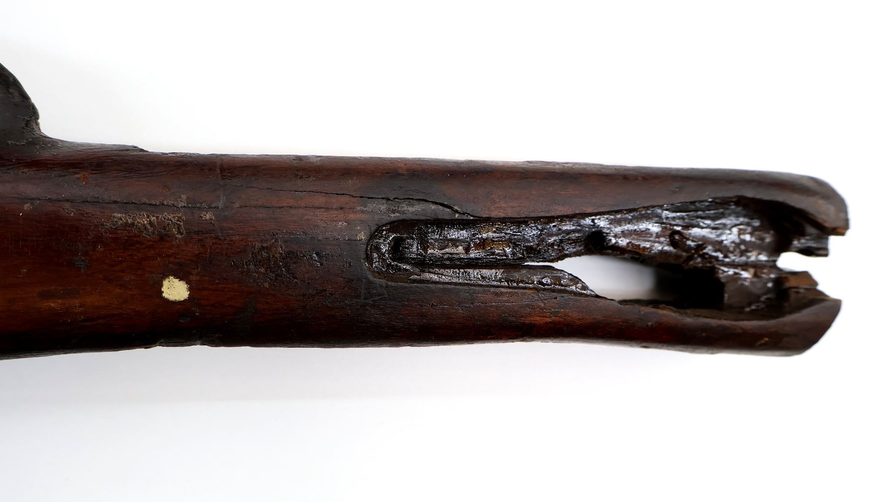 Main Description: Has engraved receiver with firing pins, triggers, underlever and repaired trigger guard. Not installed by included: Engraved back action locks with spur hammers, right side has been repaired, appear complete. One piece wood butt stock only, chipped, cracked and repaired with epoxy, smooth steel butt plate, sling swivel. No other parts or stocks are included.