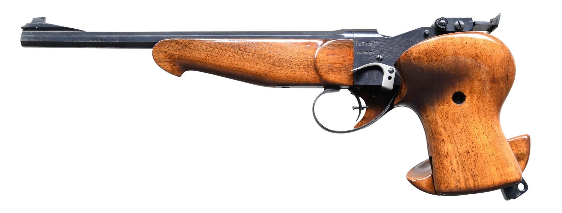 Cal. 22 LR. S# 2538. Bbl. light weight 11 1/4" tapered octagon with longitudinally dovetailed Patridge blade on serrated ramped base as front sight plus finely adjustable factory rear sight at rear of frame. Mfg. 1950-1956 with "London 1948", Helsinki 1952 and Olympic rings on top right front of receiver; indicative of Swiss shooting team. Fully adjustable lever actuated set trigger. Smooth walnut forend with semi circular side panels and schnable tip. Matching grip designed to lock a shooter's hand into the pistol with its only adjustment being a heel support; fitment matches men's large to extra large glove size. Chambered with rifling without leade so that ammunition choice is critical for use. CONDITION: occasional light handling / use marks on its original blued finish (polished) with spots of peppery oxidation on barrel. Stock set has extra finish applied in very good plus condition. Bore is near excellent. (25-3253/NW). CURIO. $650-900.