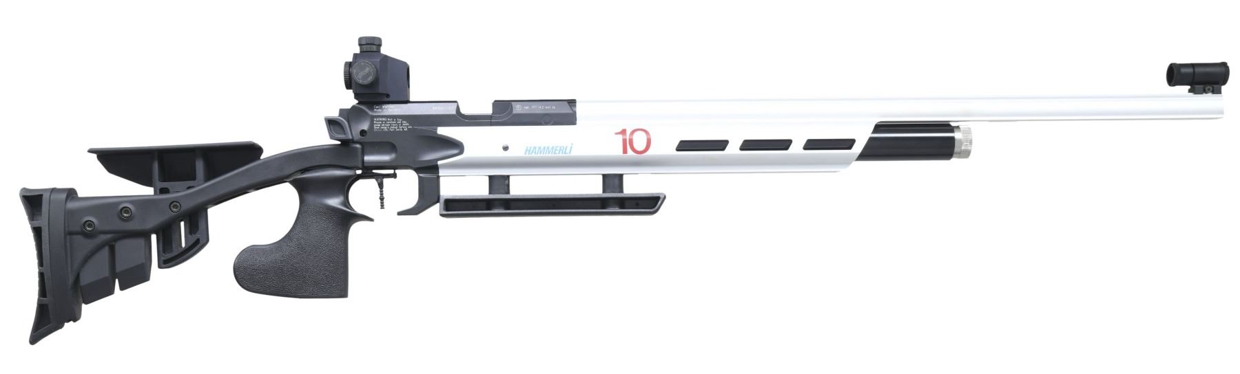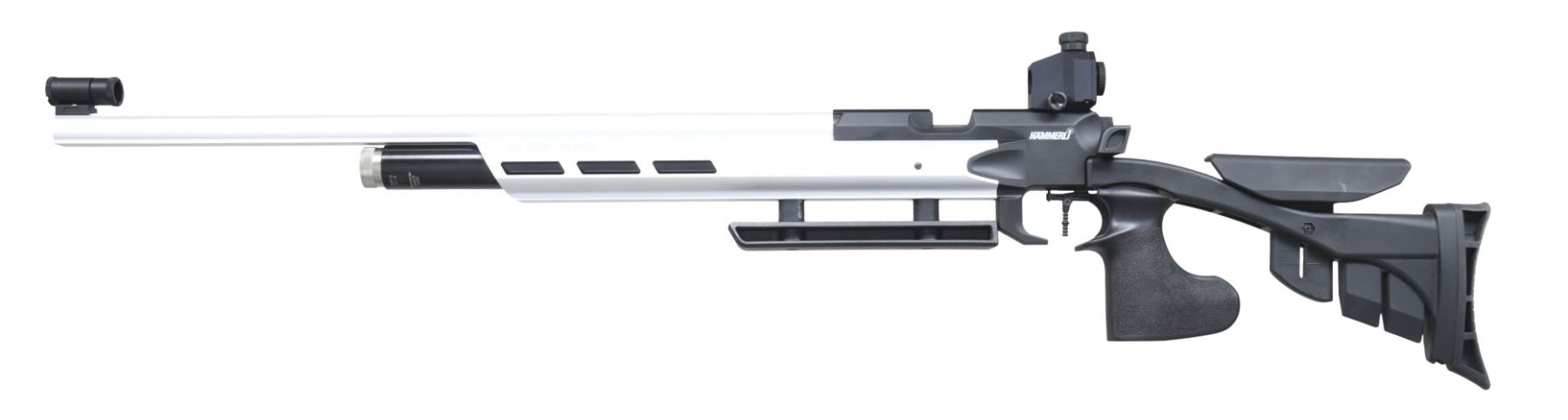 Cal. .177. S# RR122004303. Bbl. 19.69" in aluminum shroud having 11MM grooved rib that matches receiver. Shroud significantly increases sight radius for improved accuracy using its fully adjustable Walther rear sight and globe target front sight. Introduced 2022 as a top quality match rifle at a moderate price (MSRP $999); made in Germany by Carl Walther. Its main features are aluminum construction and ambidextrous design. Designed for 10 meter matches and recognized for its accuracy and suitability for beginners and experienced shooters alike. Operates using 2012 / 2022 dated Walther 300 bar (4,350 PSI) air cylinder (with capacity gauge) being suitable for up to 350 shots per fill at 557 FPS velocity. Most common variation is the blue colored AR20PRO. Extremely adjustable to the individual user for fit and trigger pull; not made with a safety. Cocking via rear handle that is very similar to an AR-15 charging handle. Right side has red "10" numeral. CONDITION: all aspects near excellent including bore. (02-24606-/NW). $400-600