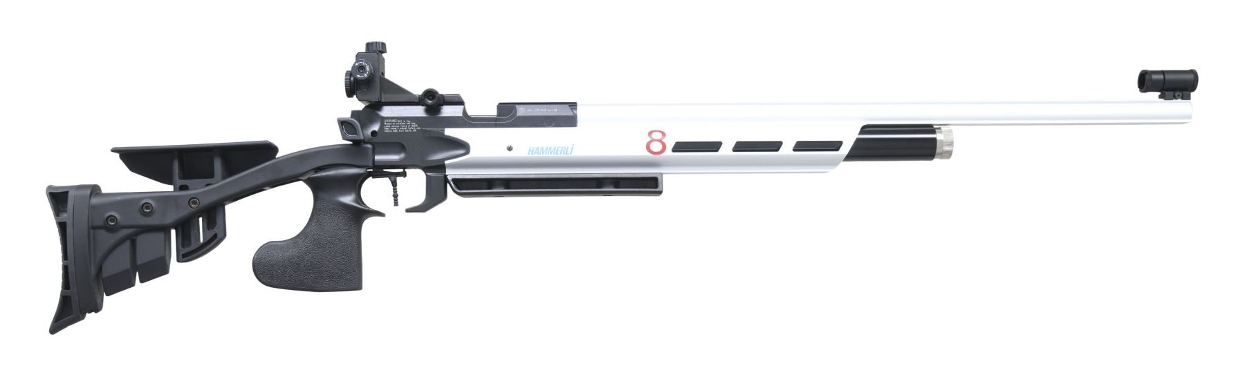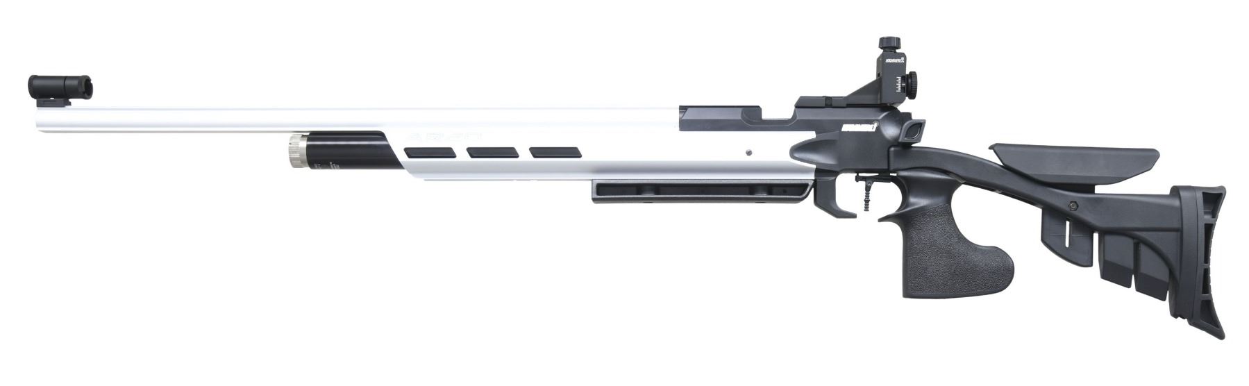 Cal. .177. S# RR122004305. Bbl. 19.69" in aluminum shroud having 11MM grooved rib that matches receiver. Shroud significantly increases sight radius for improved accuracy using its fully adjustable Hammerli rear sight and globe target front sight. Introduced 2022 as a top quality match rifle at a moderate price (MSRP $999); made in Germany by Carl Walther. Its main features are aluminum construction and ambidextrous design. Designed for 10 meter matches and recognized for its accuracy and suitability for beginners and experienced shooters alike. Operates using 2012 / 2022 dated Walther 300 bar (4,350 PSI) air cylinder (with capacity gauge) being suitable for up to 350 shots per fill at 557 FPS velocity. Most common variation is the blue colored AR20PRO. Extremely adjustable to the individual user for fit and trigger pull; not made with a safety. Cocking via rear handle that is very similar to an AR-15 charging handle. Right side has red "8" numeral. CONDITION: all aspects near excellent including bore. (02-24608-/NW). $400-600
