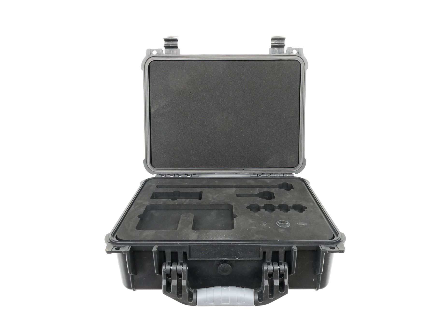 LOT INCLUDES; (1) BLACK HARD PADDED HANDGUN CASE, CARRY HANDLE, (2) LATCHES, PRESSURE RELEASE VALE, APPROX. OVERALL LENGTH 15", SHOWS WEAR AND TEAR FROM USAGE, SEE PHOTOS.