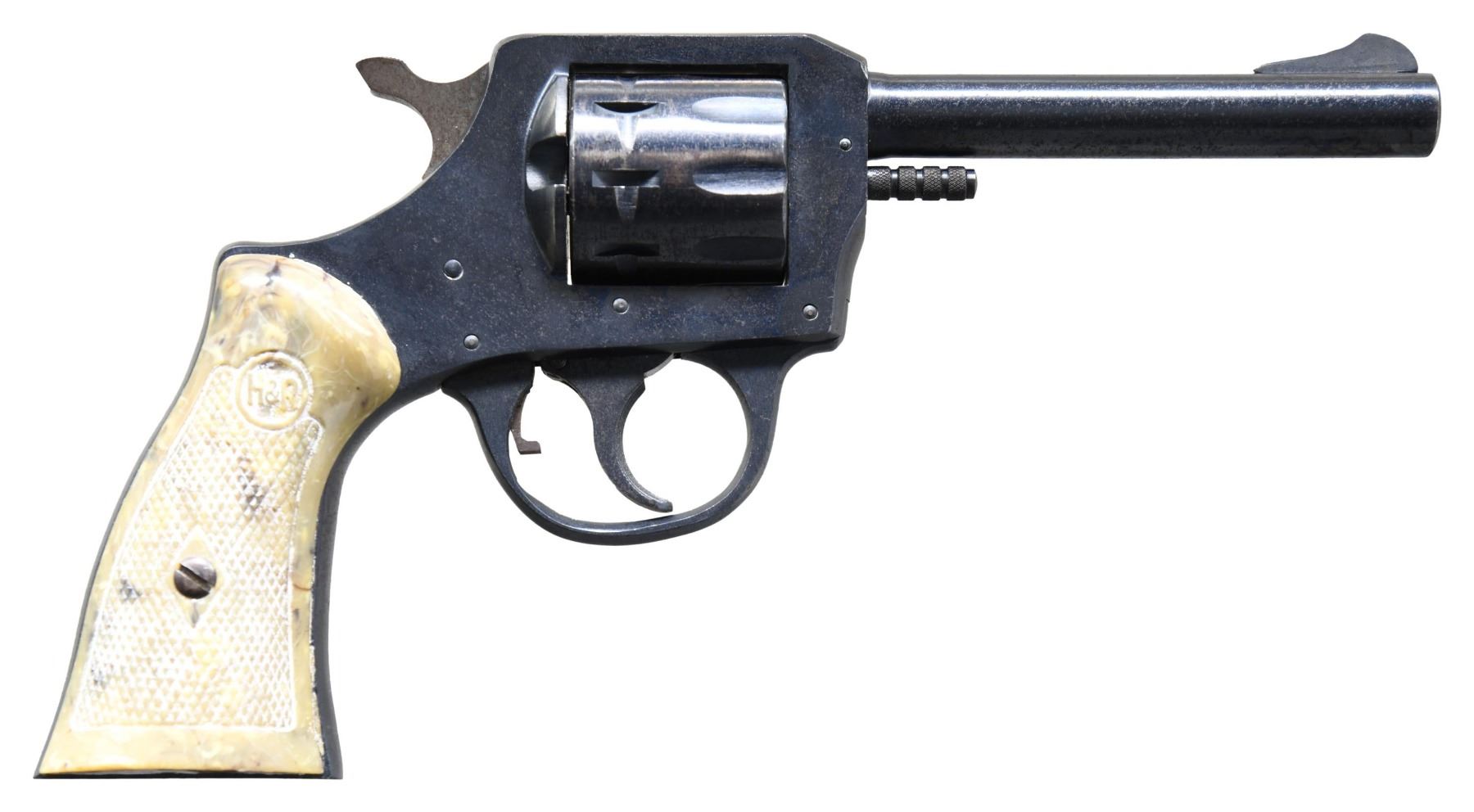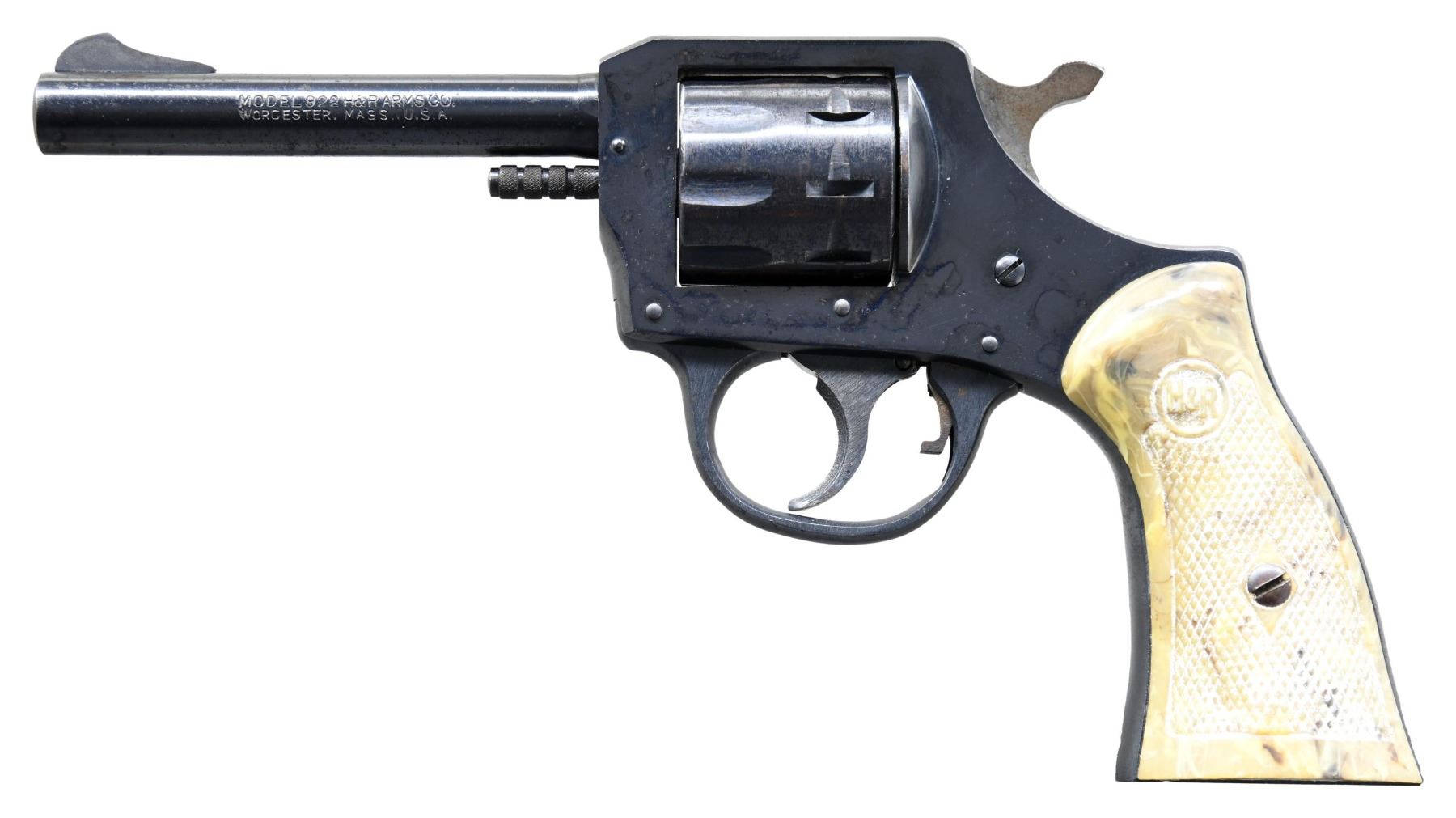 REVOLVER. Cal. 22 LR. S# N81785. Bbl. 4". Model 922 double action revolver mfg. by Harrington & Richardson. Left side of the bbl. is marked with the model designation, as well as H&R's mfg. information. Metal components exhibit a blue finish overall, save for on the hammer, which is polished in-the-white. Frame is mounted with 2-piece H&R mottled brown and white checkered synthetic grips. Fixed blade front sight, with square frame notch rear sight. CONDITION: metal components retain the majority of their original factory blue finish, exhibiting a few spots of light edge wear, with consistent spots/areas of light to mild surface oxidation present overall. Mirror bore, retaining well defined rifling throughout. Grips show scattered superficial marks from handling and storage, but otherwise remain sturdy and serviceable. (25-2358/MLW). MODERN. $100-200.