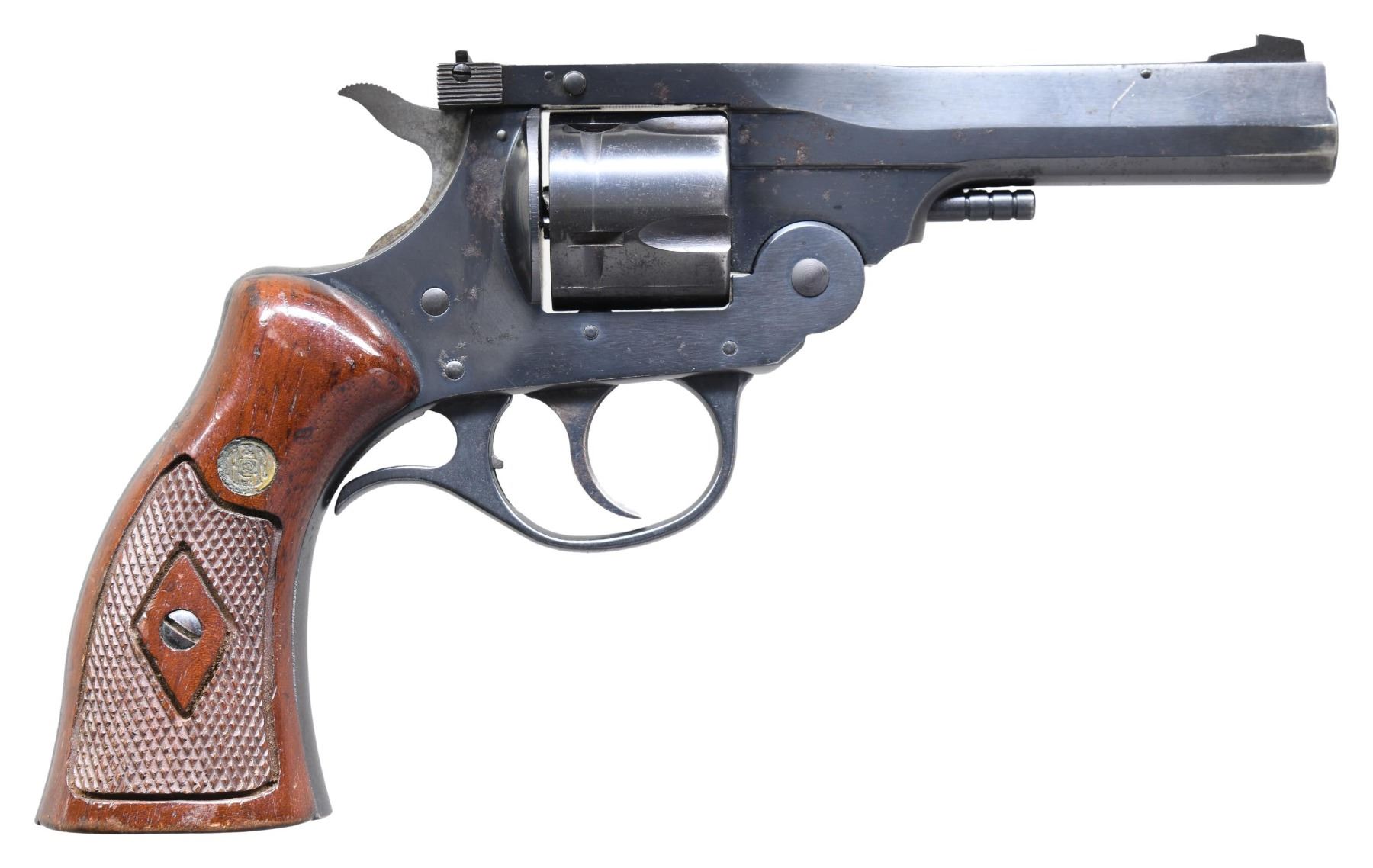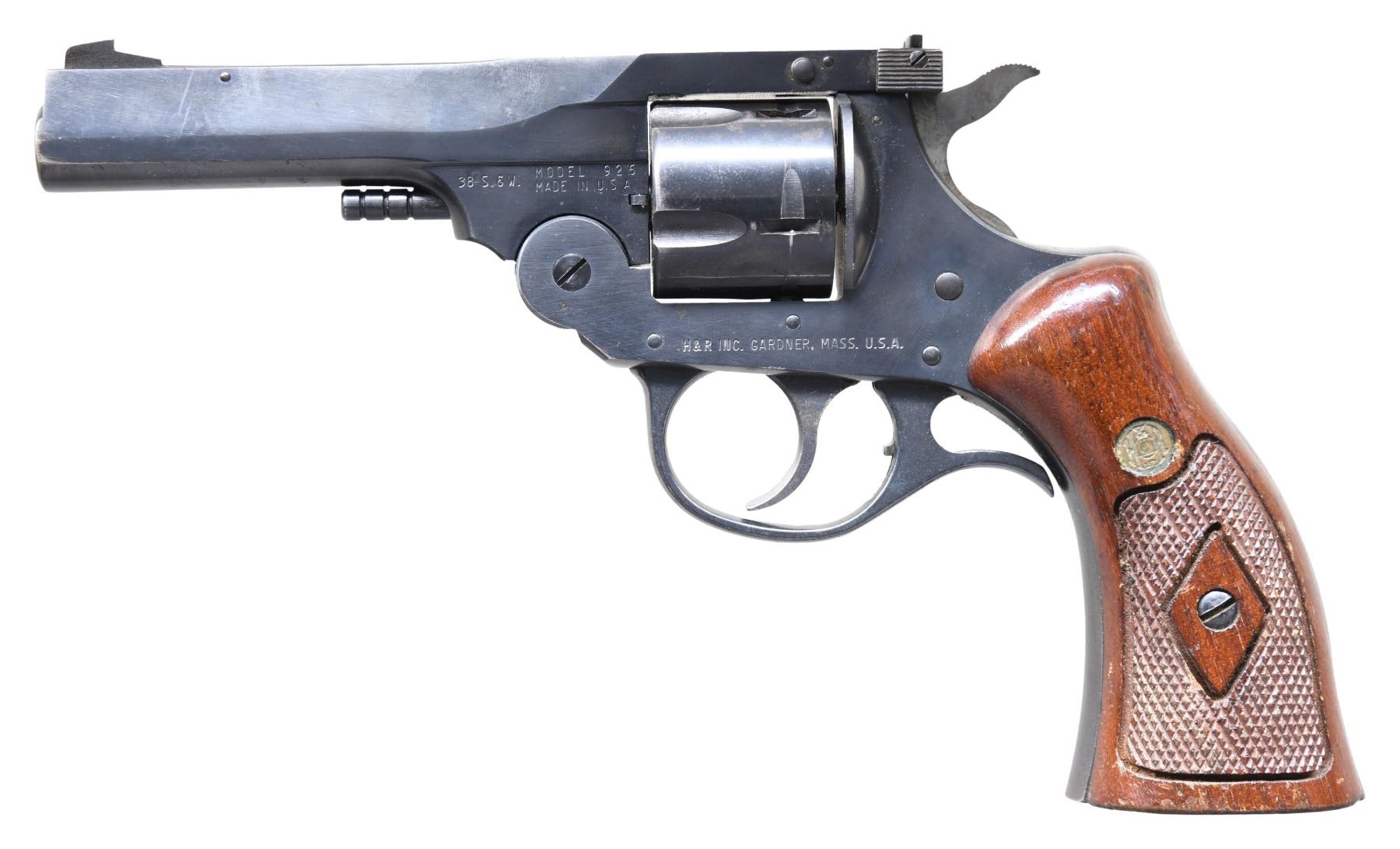 REVOLVER. Cal. 38 S&W. S# AR82849. Bbl. 4". Model 926 double action revolver mfg. by Harrington & Richardson. Left side of the bbl. is marked with the cal. and model designations, with H&R's mfg. information marked on the left side of the frame. Metal components exhibit a blue finish overall, save for on the hammer, which is polished in-the-white. Frame is mounted with 2-piece H&R checkered wood grips. Fixed blade front sight, with fixed square notch rear sight on bbl. latch. All serialized parts are matching and include the frame, bbl., bbl. latch, cyl., and ejector. CONDITION: metal components retain the majority of their original factory blue finish, exhibiting some spots of light to mild wear, with spots/areas of light to mild surface oxidation present primarily on the right side of the frame and bbl. Mirror bore, exhibiting a spot of mild oxidation/pitting, while retaining strong rifling throughout. Grips show some superficial marks from handling and storage, but otherwise remain sturdy and serviceable. (25-2354/MLW). MODERN. $200-300