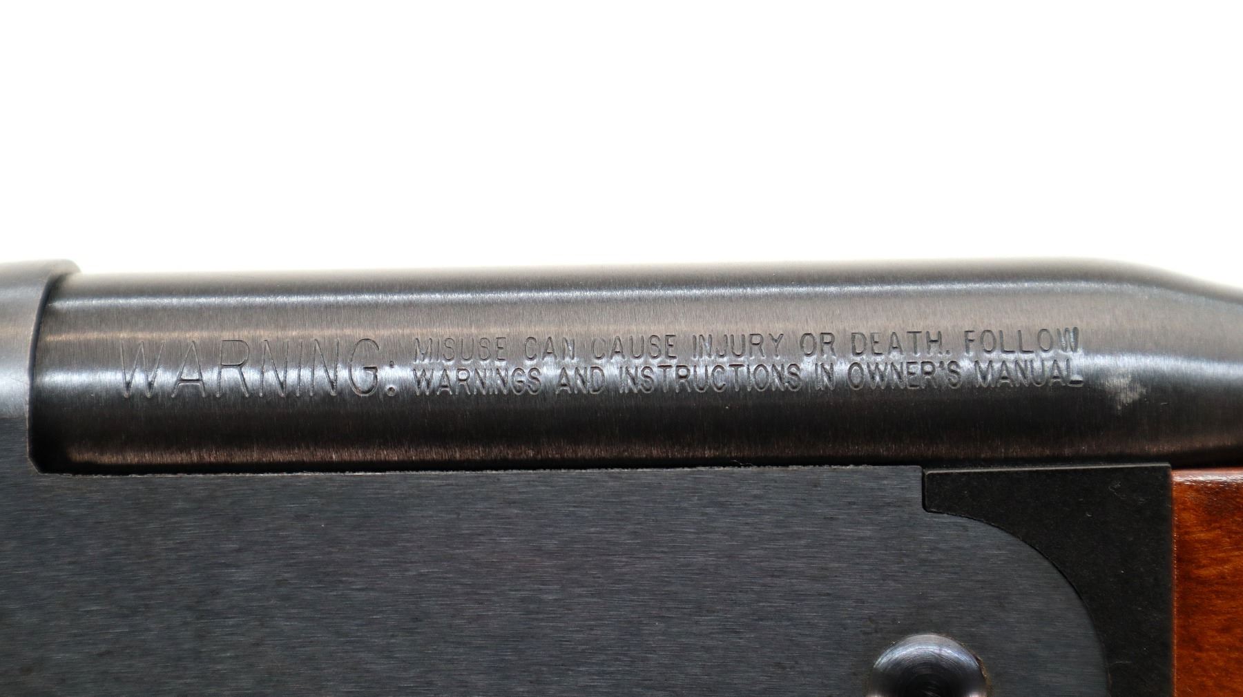 Main Description: Brass bead, blued finish, round barrel, grooved spur hammer, smooth opening lever, ejector. Two piece wood stocks, straight grip, black vented rubber recoil pad, 13" LOP