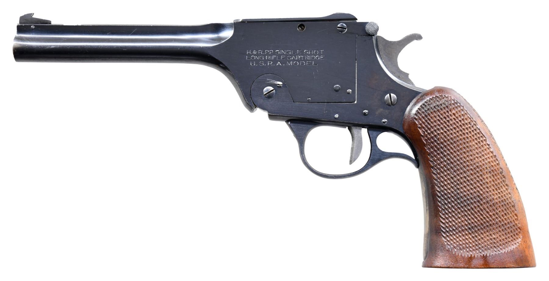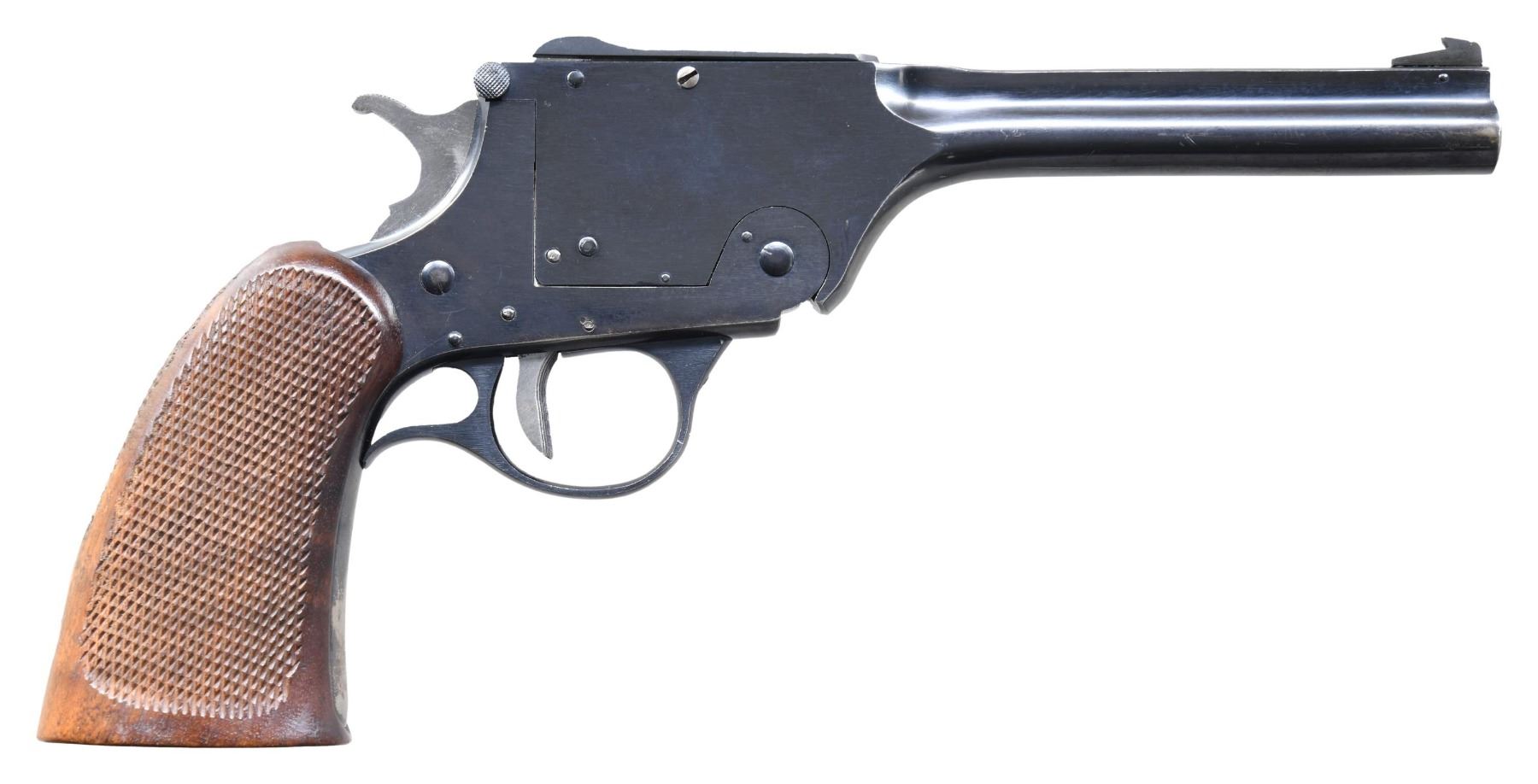 PISTOL. Cal. 22 LR. S# 1761 found on bottom of breechblock and left side of grip frame. Bbl. 7" with tapered sides to wide style rib. Undercut Patridge style pinned blade front sight with elevation adj. square notch rear sight. Lever style ejector. Blue finish. Case color hardened hammer with polished sides. Polished grooved trigger. No. 4 oversized walnut grip with cut checkering on sides and along back strap. Butt of grip has deeply cut name "S W PRESTON". CONDITION: 85-90% lightly worn blue showing wear on edges and front grip strap. Grip has lightly worn finish. Checkered panel along rear edge shows damage consisting of some flattened diamonds. Very good bright bore. (25-3997/DS). CURIO. $600-900.