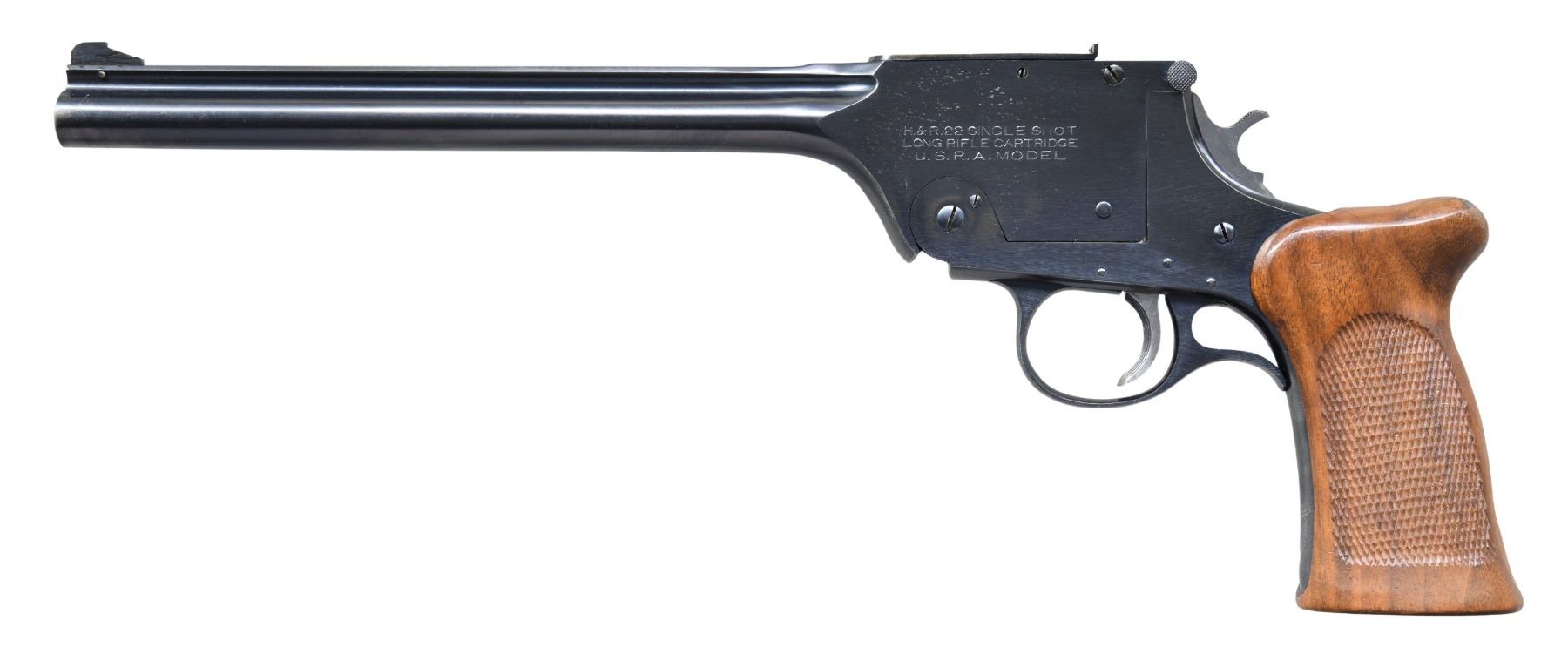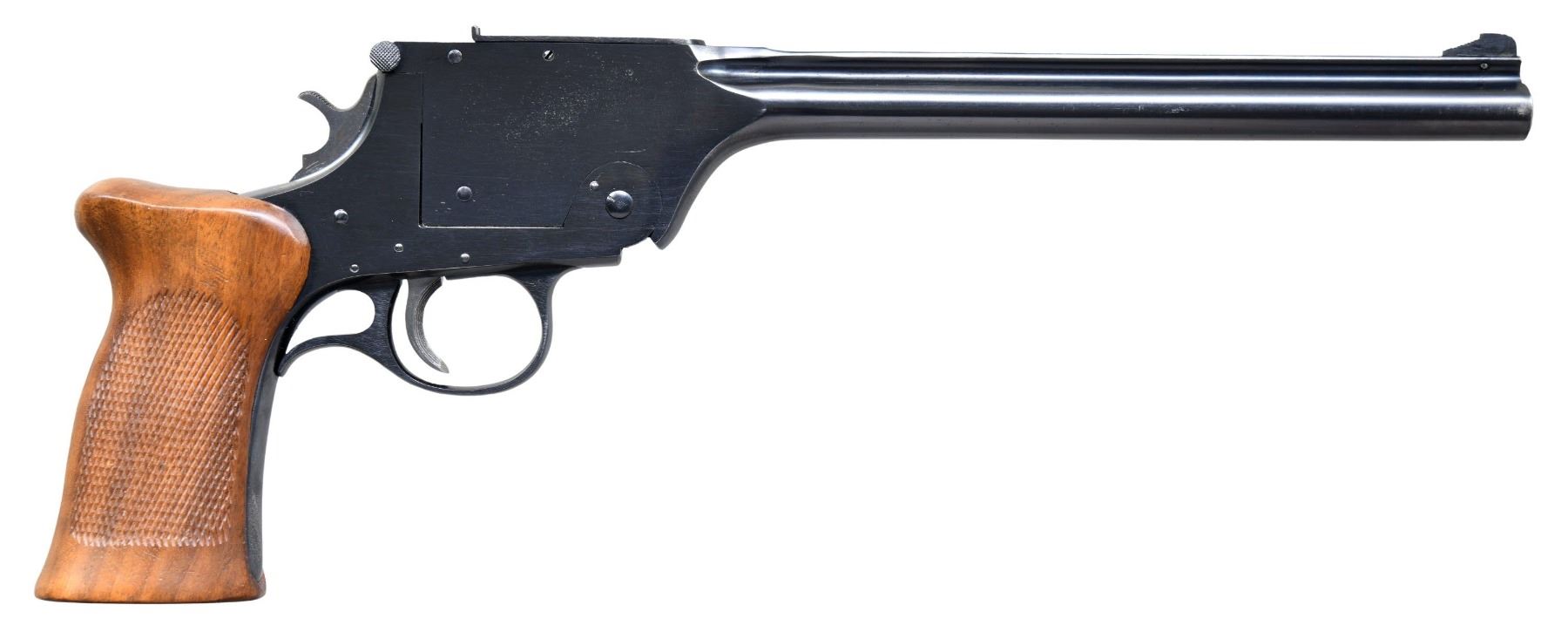 BREAK PISTOL. Cal. 22 LR. S# 1152 found on bottom of breechblock and left side of frame under the grip. Bbl. 10" rnd. with deep flutes to narrow rib. Round head plunger type ejector. Serrated ramp pinned blade front sight with elevation adj. square notch rear sight. Top break action. Blue finish. Case hardened hammer with polished sides. Bright finished grooved trigger. No. 0 standard size grip with rearward protruding spur at top having cut checkering on the sides. CONDITION: over 90% lightly worn blue showing edge wear with small spots of finish loss on breechblock and front grip strap. Grips have original finish showing small marks. Bright near excellent bore. (25-3999/DS). CURIO. $800-1,100.