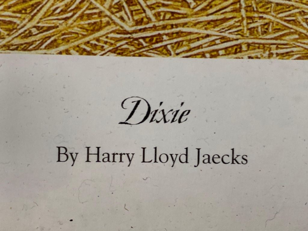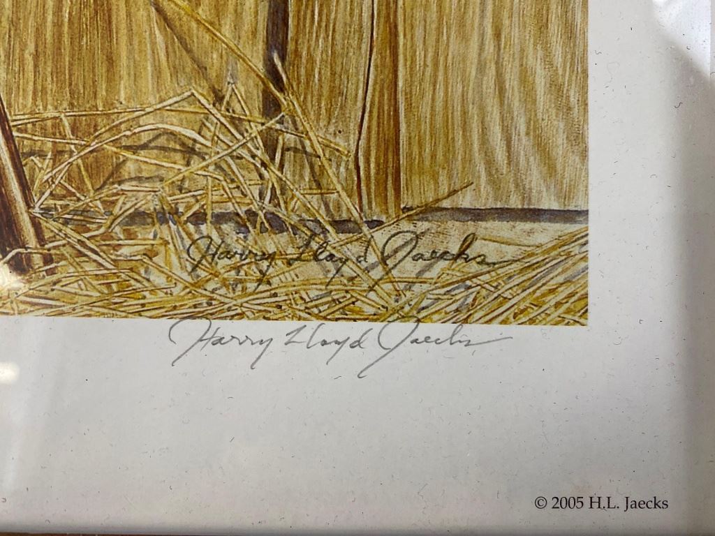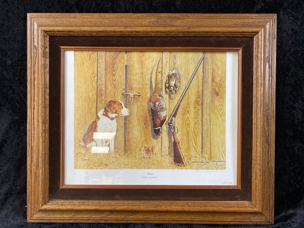 Harry Lloyd Jaecks print, "Dixie" depicting the faithful bird dog and shotgun.  The piece is well completed matted and well framed.  The reverse is signed with a lengthy note to the original owner from the artist.