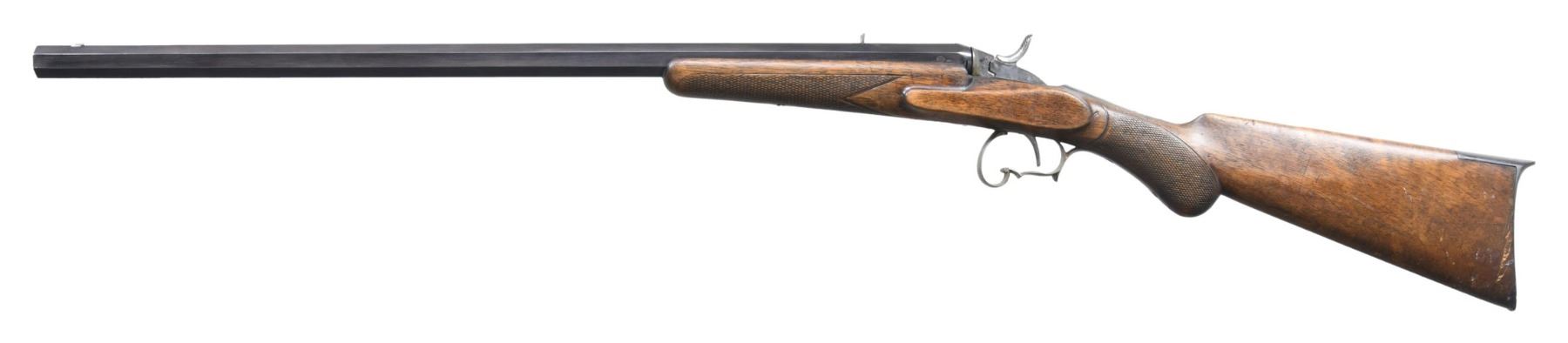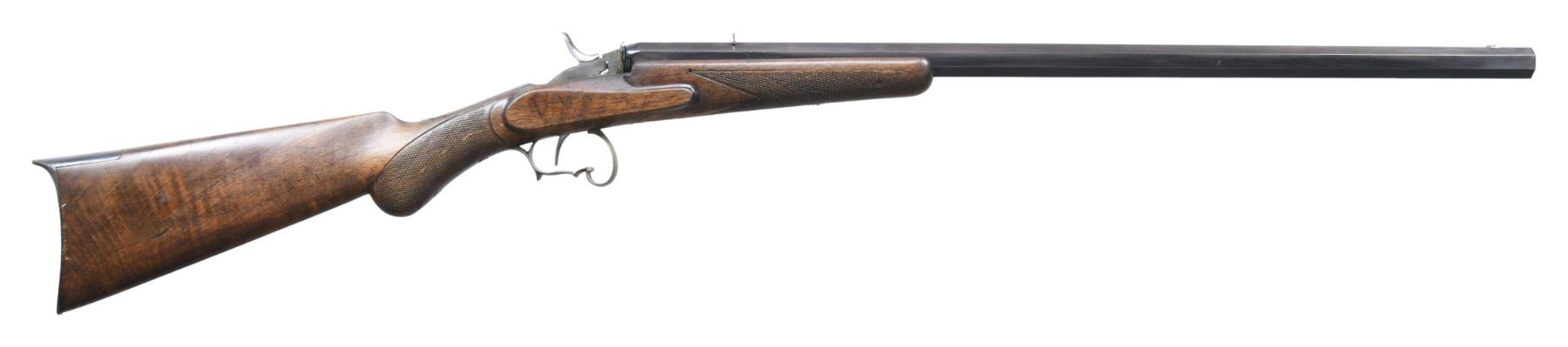 Cal. 22 RF. NSN. Bbl. 24". Single shot parlor rifle produced by an unknown maker in Belgium. Left flat of the heavy octagonal bbl. exhibits 2 Belgian commercial proofs towards the breech. Bbl. and buttplate exhibit a reapplied blue finish, with remaining metal components having been cleaned and polished in-the-white. 1-piece checkered wood rnd. knob buttstock. Blade front sight, with V-notch rear sight. CONDITION: metal components retain bountiful amounts of their reapplied blue finish, exhibiting striations from prior cleaning, as well as some spots of light pitting beneath the bluing. In-the-white parts are very good, exhibiting some light to mild pitting. Dark pitted bore, retaining fair to good rifling throughout. Stock shows scattered marks and impressions from handling and storage, but otherwise remains sturdy and serviceable. (25-2502/MLW). CURIO. $150-250.