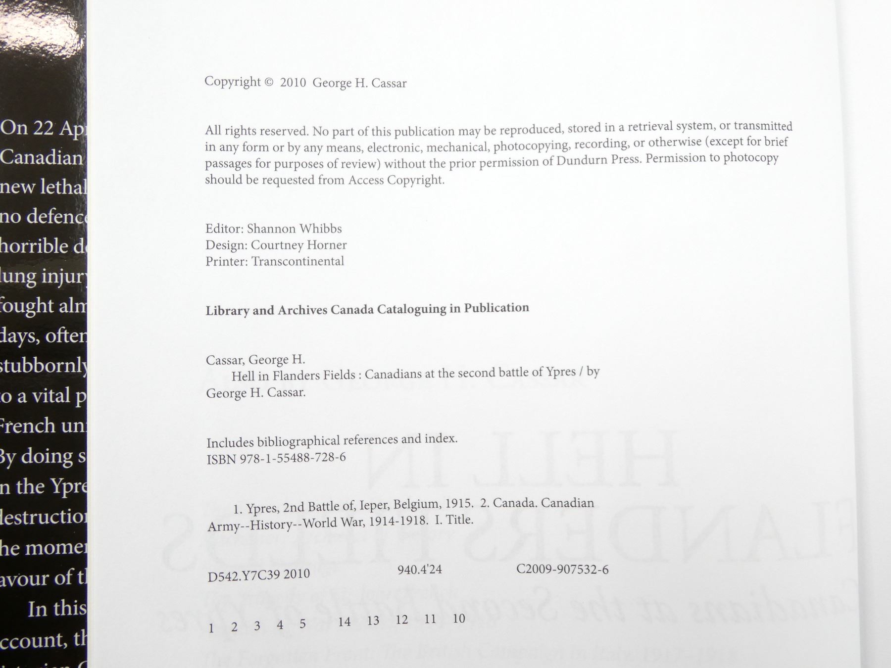 (1) "CANADIANS AT THE SECOND BATTLE OF YPRES" BOOK BY GEORGE H. CASSAR, HARD COVER WITH DUST COVER, ISBN: 978-1-55488-728-6. SEE PHOTOS.