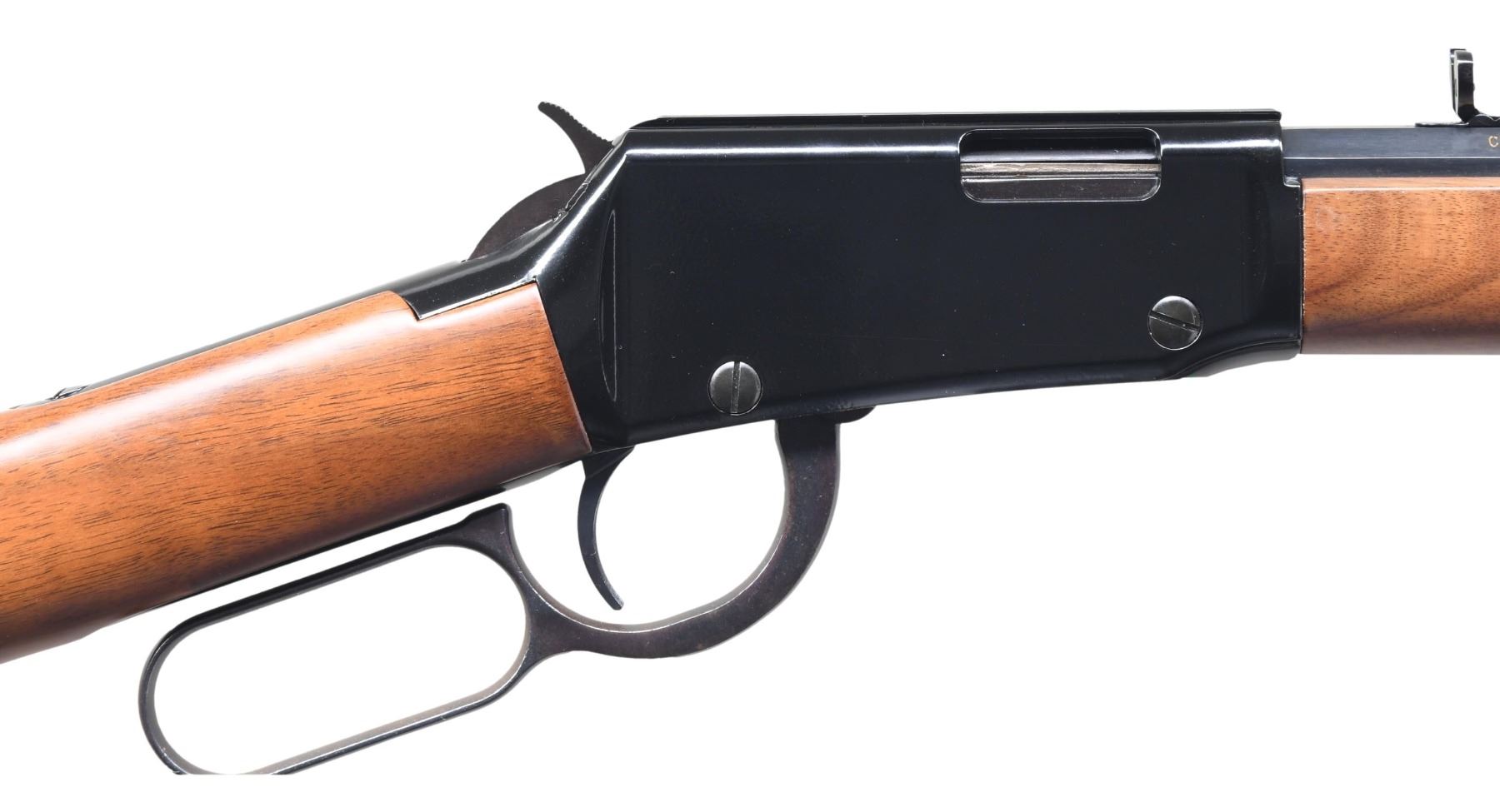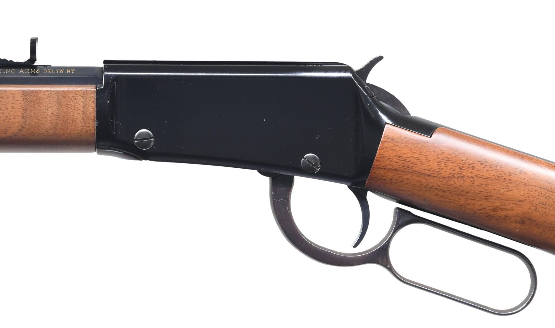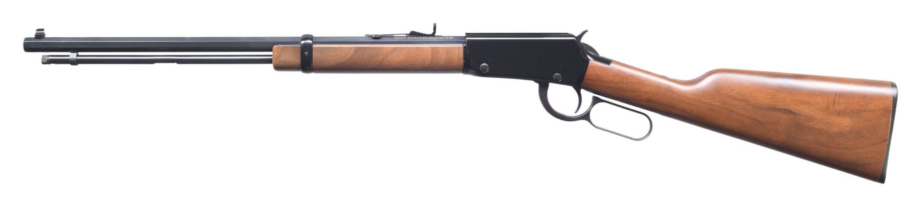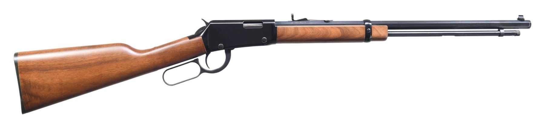 Cal. 22 LR. S# T02510H. Oct. 20" w/ gold filled markings. Tubular mag. Bead front sight & elevator rear sight. Smooth walnut stock set. UNATTACHED ACCESSORIES: Henry hang tag. CONDITION: all aspects near excellent. (25-3324/MD). MODERN. $300-500.