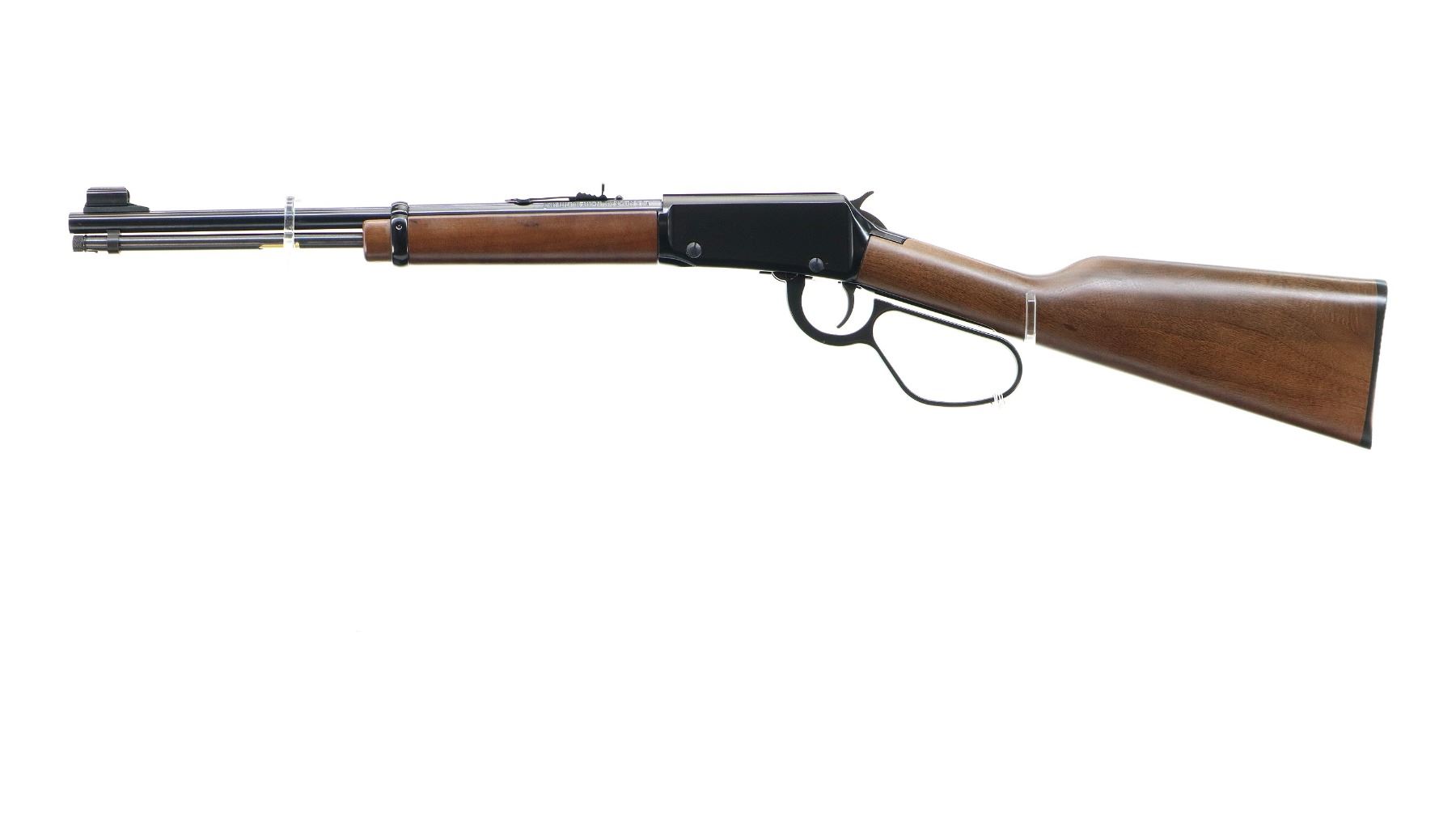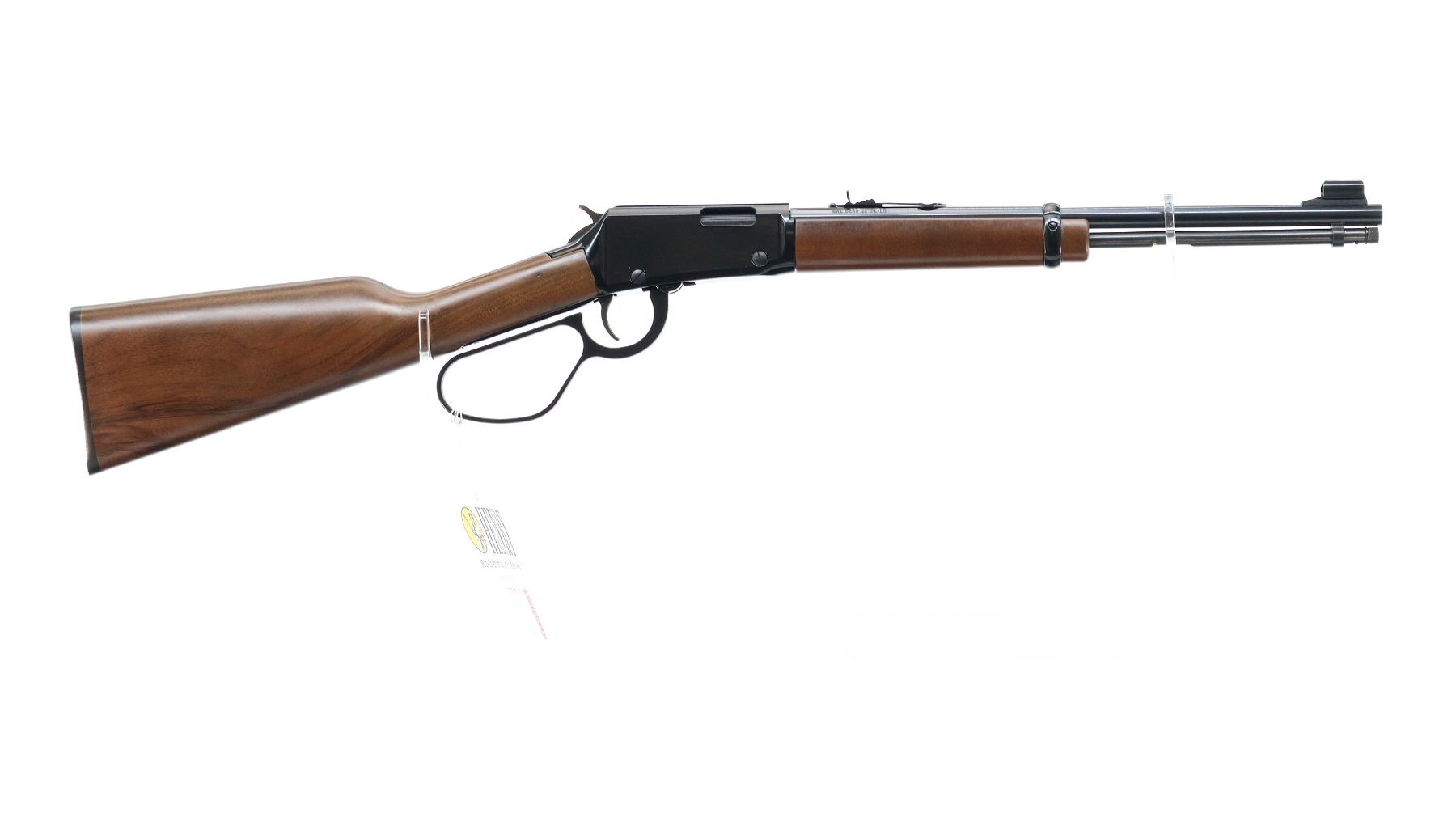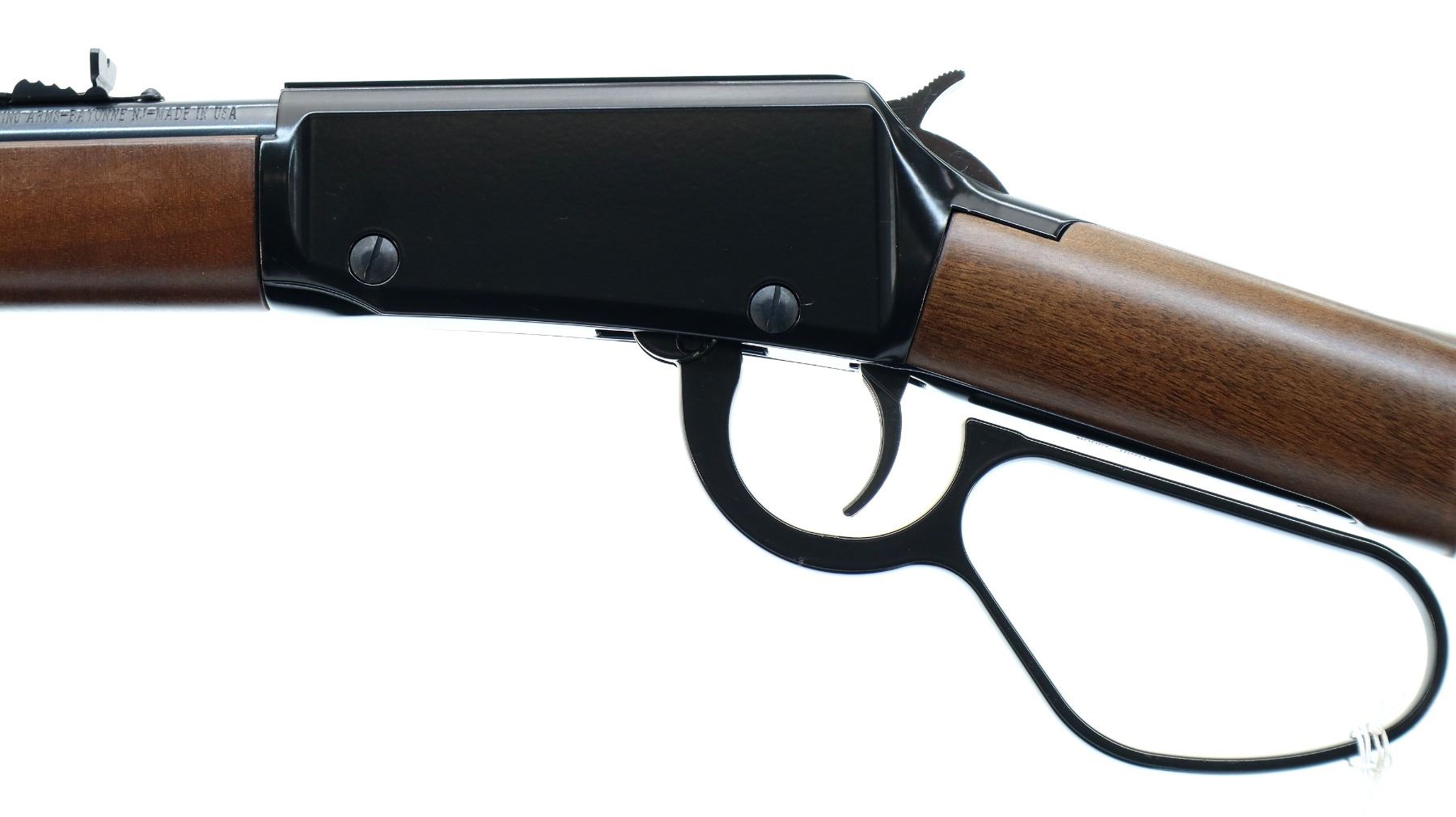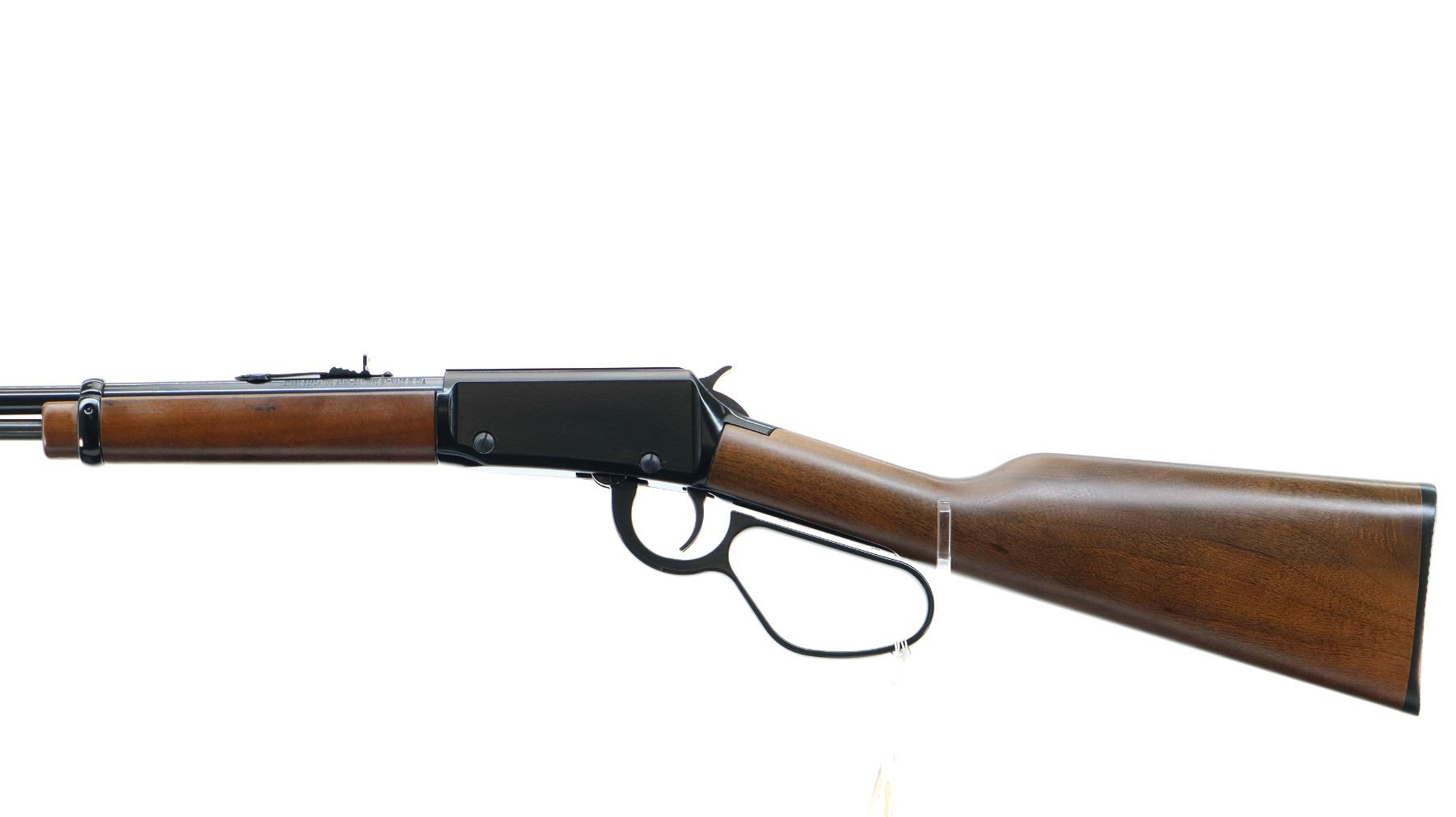 Main Description: Blade front sight with hood and ramp, adjustable u notched rear sight, blued round barrel and full length magtube, grooved black alloy receiver, spur hammer. Two piece wood stocks, straight grip, checkered black polymer butt plate and large loop lever, retains factory hang tags.