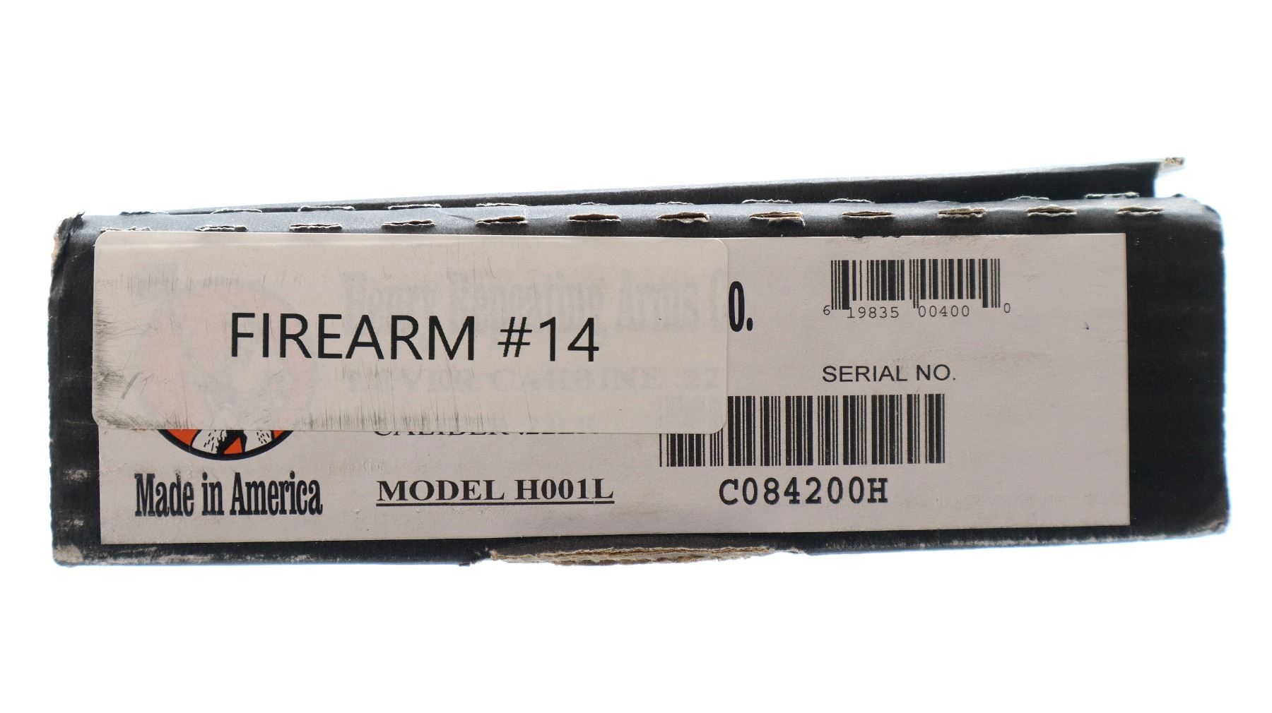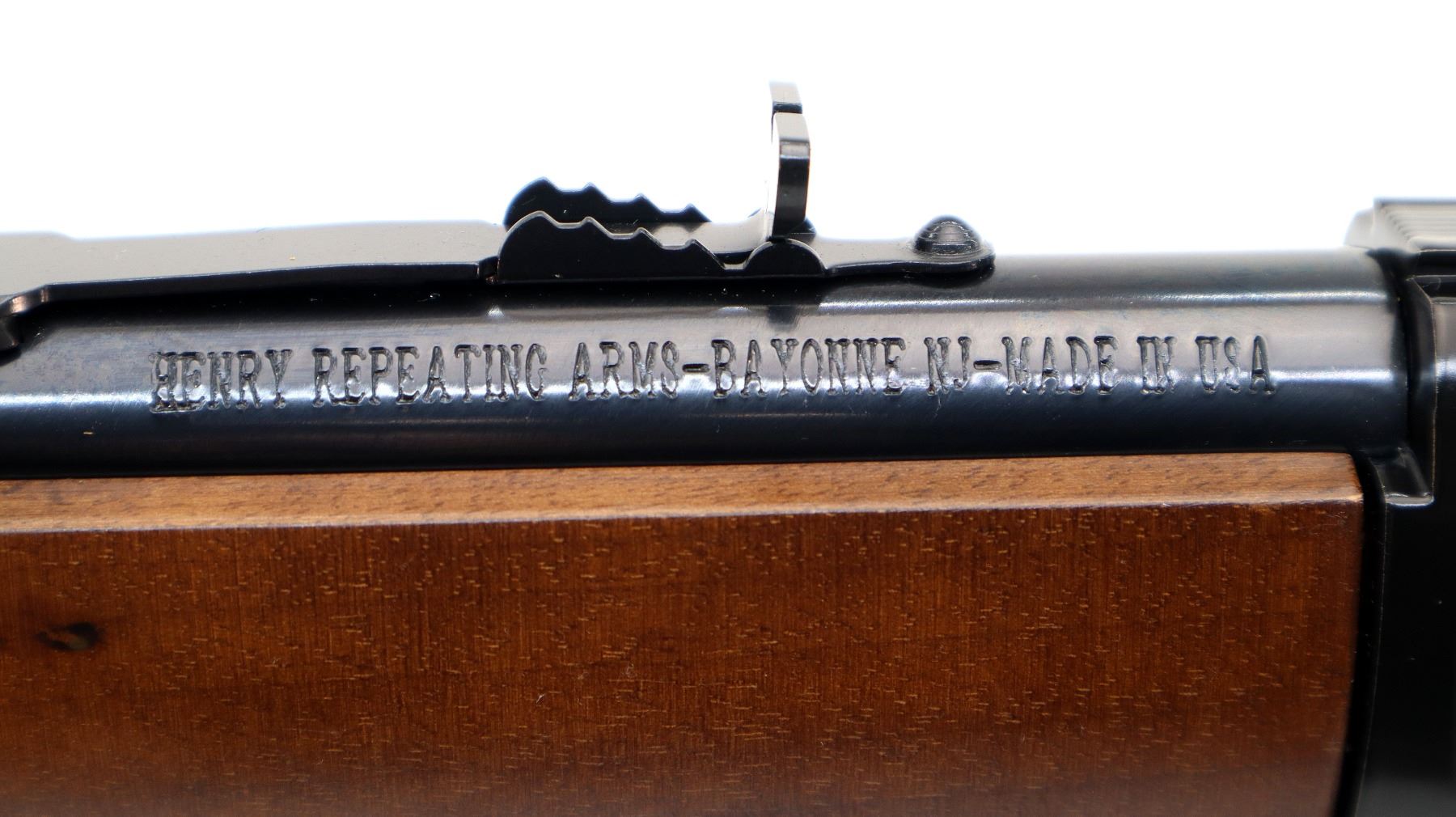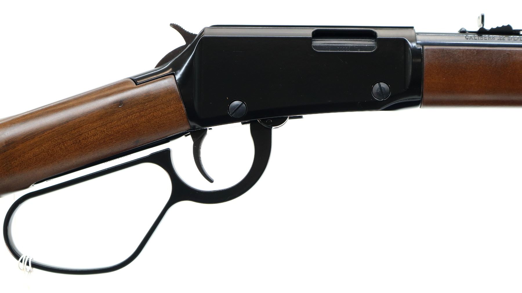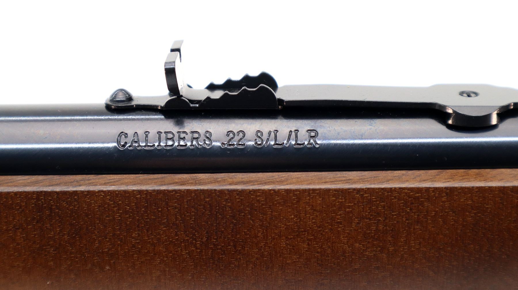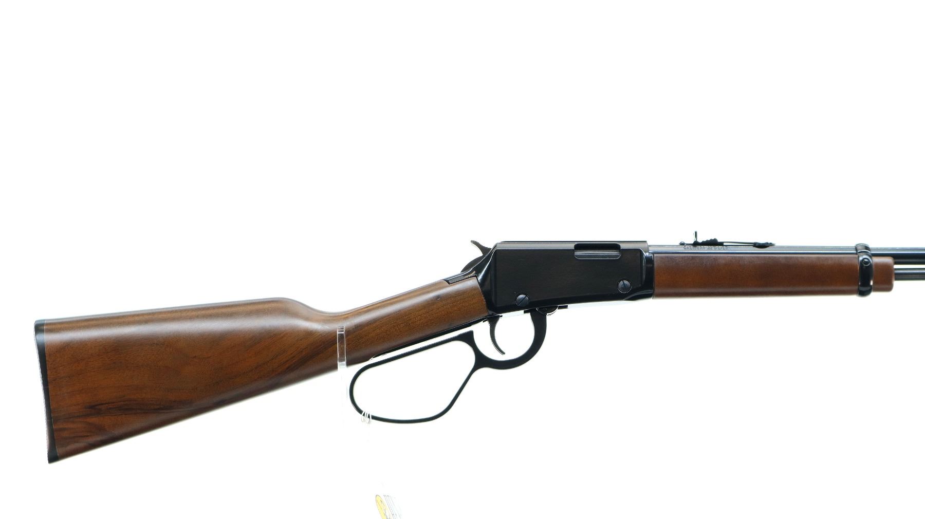 Main Description: Blade front sight with hood and ramp, adjustable u notched rear sight, blued round barrel and full length magtube, grooved black alloy receiver, spur hammer. Two piece wood stocks, straight grip, checkered black polymer butt plate and large loop lever, retains factory hang tags.